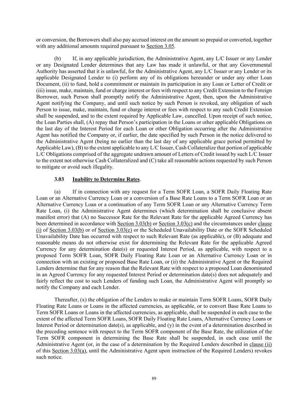 89 or conversion, the Borrowers shall also pay accrued interest on the amount so prepaid or converted, together with any additional amounts required pursuant to Section 3.05. (b) If, in any applicable jurisdiction, the Administrative Agent, any L/C Issuer or any Lender or any Designated Lender determines that any Law has made it unlawful, or that any Governmental Authority has asserted that it is unlawful, for the Administrative Agent, any L/C Issuer or any Lender or its applicable Designated Lender to (i) perform any of its obligations hereunder or under any other Loan Document, (ii) to fund, hold a commitment or maintain its participation in any Loan or Letter of Credit or (iii) issue, make, maintain, fund or charge interest or fees with respect to any Credit Extension to the Foreign Borrower, such Person shall promptly notify the Administrative Agent, then, upon the Administrative Agent notifying the Company, and until such notice by such Person is revoked, any obligation of such Person to issue, make, maintain, fund or charge interest or fees with respect to any such Credit Extension shall be suspended, and to the extent required by Applicable Law, cancelled. Upon receipt of such notice, the Loan Parties shall, (A) repay that Person’s participation in the Loans or other applicable Obligations on the last day of the Interest Period for each Loan or other Obligation occurring after the Administrative Agent has notified the Company or, if earlier, the date specified by such Person in the notice delivered to the Administrative Agent (being no earlier than the last day of any applicable grace period permitted by Applicable Law), (B) to the extent applicable to any L/C Issuer, Cash Collateralize that portion of applicable L/C Obligations comprised of the aggregate undrawn amount of Letters of Credit issued by such L/C Issuer to the extent not otherwise Cash Collateralized and (C) take all reasonable actions requested by such Person to mitigate or avoid such illegality. 3.03 Inability to Determine Rates. (a) If in connection with any request for a Term SOFR Loan, a SOFR Daily Floating Rate Loan or an Alternative Currency Loan or a conversion of a Base Rate Loans to a Term SOFR Loan or an Alternative Currency Loan or a continuation of any Term SOFR Loan or any Alternative Currency Term Rate Loan, (i) the Administrative Agent determines (which determination shall be conclusive absent manifest error) that (A) no Successor Rate for the Relevant Rate for the applicable Agreed Currency has been determined in accordance with Section 3.03(b) or Section 3.03(c) and the circumstances under clause (i) of Section 3.03(b) or of Section 3.03(c) or the Scheduled Unavailability Date or the SOFR Scheduled Unavailability Date has occurred with respect to such Relevant Rate (as applicable), or (B) adequate and reasonable means do not otherwise exist for determining the Relevant Rate for the applicable Agreed Currency for any determination date(s) or requested Interest Period, as applicable, with respect to a proposed Term SOFR Loan, SOFR Daily Floating Rate Loan or an Alternative Currency Loan or in connection with an existing or proposed Base Rate Loan, or (ii) the Administrative Agent or the Required Lenders determine that for any reason that the Relevant Rate with respect to a proposed Loan denominated in an Agreed Currency for any requested Interest Period or determination date(s) does not adequately and fairly reflect the cost to such Lenders of funding such Loan, the Administrative Agent will promptly so notify the Company and each Lender. Thereafter, (x) the obligation of the Lenders to make or maintain Term SOFR Loans, SOFR Daily Floating Rate Loans or Loans in the affected currencies, as applicable, or to convert Base Rate Loans to Term SOFR Loans or Loans in the affected currencies, as applicable, shall be suspended in each case to the extent of the affected Term SOFR Loans, SOFR Daily Floating Rate Loans, Alternative Currency Loans or Interest Period or determination date(s), as applicable, and (y) in the event of a determination described in the preceding sentence with respect to the Term SOFR component of the Base Rate, the utilization of the Term SOFR component in determining the Base Rate shall be suspended, in each case until the Administrative Agent (or, in the case of a determination by the Required Lenders described in clause (ii) of this Section 3.03(a), until the Administrative Agent upon instruction of the Required Lenders) revokes such notice.