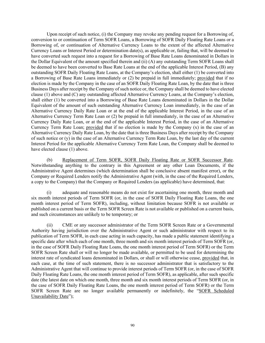 90 Upon receipt of such notice, (i) the Company may revoke any pending request for a Borrowing of, conversion to or continuation of Term SOFR Loans, a Borrowing of SOFR Daily Floating Rate Loans or a Borrowing of, or continuation of Alternative Currency Loans to the extent of the affected Alternative Currency Loans or Interest Period or determination date(s), as applicable or, failing that, will be deemed to have converted such request into a request for a Borrowing of Base Rate Loans denominated in Dollars in the Dollar Equivalent of the amount specified therein and (ii) (A) any outstanding Term SOFR Loans shall be deemed to have been converted to Base Rate Loans at the end of the applicable Interest Period, (B) any outstanding SOFR Daily Floating Rate Loans, at the Company’s election, shall either (1) be converted into a Borrowing of Base Rate Loans immediately or (2) be prepaid in full immediately; provided that if no election is made by the Company in the case of an SOFR Daily Floating Rate Loan, by the date that is three Business Days after receipt by the Company of such notice or, the Company shall be deemed to have elected clause (1) above and (C) any outstanding affected Alternative Currency Loans, at the Company’s election, shall either (1) be converted into a Borrowing of Base Rate Loans denominated in Dollars in the Dollar Equivalent of the amount of such outstanding Alternative Currency Loan immediately, in the case of an Alternative Currency Daily Rate Loan or at the end of the applicable Interest Period, in the case of an Alternative Currency Term Rate Loan or (2) be prepaid in full immediately, in the case of an Alternative Currency Daily Rate Loan, or at the end of the applicable Interest Period, in the case of an Alternative Currency Term Rate Loan; provided that if no election is made by the Company (x) in the case of an Alternative Currency Daily Rate Loan, by the date that is three Business Days after receipt by the Company of such notice or (y) in the case of an Alternative Currency Term Rate Loan, by the last day of the current Interest Period for the applicable Alternative Currency Term Rate Loan, the Company shall be deemed to have elected clause (1) above. (b) Replacement of Term SOFR, SOFR Daily Floating Rate or SOFR Successor Rate. Notwithstanding anything to the contrary in this Agreement or any other Loan Documents, if the Administrative Agent determines (which determination shall be conclusive absent manifest error), or the Company or Required Lenders notify the Administrative Agent (with, in the case of the Required Lenders, a copy to the Company) that the Company or Required Lenders (as applicable) have determined, that: (i) adequate and reasonable means do not exist for ascertaining one month, three month and six month interest periods of Term SOFR (or, in the case of SOFR Daily Floating Rate Loans, the one month interest period of Term SOFR), including, without limitation because SOFR is not available or published on a current basis or the Term SOFR Screen Rate is not available or published on a current basis, and such circumstances are unlikely to be temporary; or (ii) CME or any successor administrator of the Term SOFR Screen Rate or a Governmental Authority having jurisdiction over the Administrative Agent or such administrator with respect to its publication of Term SOFR, in each case acting in such capacity, has made a public statement identifying a specific date after which each of one month, three month and six month interest periods of Term SOFR (or, in the case of SOFR Daily Floating Rate Loans, the one month interest period of Term SOFR) or the Term SOFR Screen Rate shall or will no longer be made available, or permitted to be used for determining the interest rate of syndicated loans denominated in Dollars, or shall or will otherwise cease, provided that, in each case, at the time of such statement, there is no successor administrator that is satisfactory to the Administrative Agent that will continue to provide interest periods of Term SOFR (or, in the case of SOFR Daily Floating Rate Loans, the one month interest period of Term SOFR), as applicable, after such specific date (the latest date on which one month, three month and six month interest periods of Term SOFR (or, in the case of SOFR Daily Floating Rate Loans, the one month interest period of Term SOFR) or the Term SOFR Screen Rate are no longer available permanently or indefinitely, the “SOFR Scheduled Unavailability Date”);