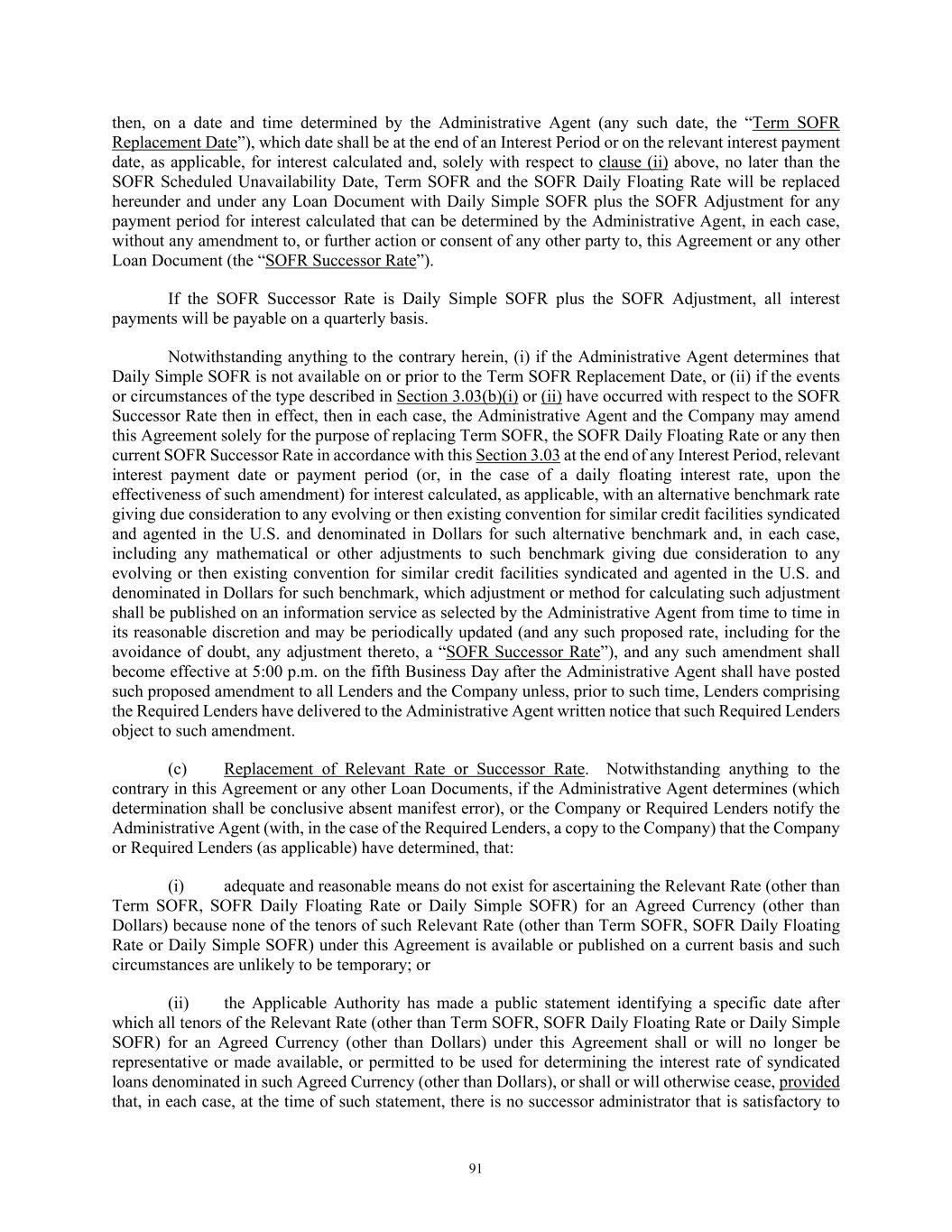 91 then, on a date and time determined by the Administrative Agent (any such date, the “Term SOFR Replacement Date”), which date shall be at the end of an Interest Period or on the relevant interest payment date, as applicable, for interest calculated and, solely with respect to clause (ii) above, no later than the SOFR Scheduled Unavailability Date, Term SOFR and the SOFR Daily Floating Rate will be replaced hereunder and under any Loan Document with Daily Simple SOFR plus the SOFR Adjustment for any payment period for interest calculated that can be determined by the Administrative Agent, in each case, without any amendment to, or further action or consent of any other party to, this Agreement or any other Loan Document (the “SOFR Successor Rate”). If the SOFR Successor Rate is Daily Simple SOFR plus the SOFR Adjustment, all interest payments will be payable on a quarterly basis. Notwithstanding anything to the contrary herein, (i) if the Administrative Agent determines that Daily Simple SOFR is not available on or prior to the Term SOFR Replacement Date, or (ii) if the events or circumstances of the type described in Section 3.03(b)(i) or (ii) have occurred with respect to the SOFR Successor Rate then in effect, then in each case, the Administrative Agent and the Company may amend this Agreement solely for the purpose of replacing Term SOFR, the SOFR Daily Floating Rate or any then current SOFR Successor Rate in accordance with this Section 3.03 at the end of any Interest Period, relevant interest payment date or payment period (or, in the case of a daily floating interest rate, upon the effectiveness of such amendment) for interest calculated, as applicable, with an alternative benchmark rate giving due consideration to any evolving or then existing convention for similar credit facilities syndicated and agented in the U.S. and denominated in Dollars for such alternative benchmark and, in each case, including any mathematical or other adjustments to such benchmark giving due consideration to any evolving or then existing convention for similar credit facilities syndicated and agented in the U.S. and denominated in Dollars for such benchmark, which adjustment or method for calculating such adjustment shall be published on an information service as selected by the Administrative Agent from time to time in its reasonable discretion and may be periodically updated (and any such proposed rate, including for the avoidance of doubt, any adjustment thereto, a “SOFR Successor Rate”), and any such amendment shall become effective at 5:00 p.m. on the fifth Business Day after the Administrative Agent shall have posted such proposed amendment to all Lenders and the Company unless, prior to such time, Lenders comprising the Required Lenders have delivered to the Administrative Agent written notice that such Required Lenders object to such amendment. (c) Replacement of Relevant Rate or Successor Rate. Notwithstanding anything to the contrary in this Agreement or any other Loan Documents, if the Administrative Agent determines (which determination shall be conclusive absent manifest error), or the Company or Required Lenders notify the Administrative Agent (with, in the case of the Required Lenders, a copy to the Company) that the Company or Required Lenders (as applicable) have determined, that: (i) adequate and reasonable means do not exist for ascertaining the Relevant Rate (other than Term SOFR, SOFR Daily Floating Rate or Daily Simple SOFR) for an Agreed Currency (other than Dollars) because none of the tenors of such Relevant Rate (other than Term SOFR, SOFR Daily Floating Rate or Daily Simple SOFR) under this Agreement is available or published on a current basis and such circumstances are unlikely to be temporary; or (ii) the Applicable Authority has made a public statement identifying a specific date after which all tenors of the Relevant Rate (other than Term SOFR, SOFR Daily Floating Rate or Daily Simple SOFR) for an Agreed Currency (other than Dollars) under this Agreement shall or will no longer be representative or made available, or permitted to be used for determining the interest rate of syndicated loans denominated in such Agreed Currency (other than Dollars), or shall or will otherwise cease, provided that, in each case, at the time of such statement, there is no successor administrator that is satisfactory to