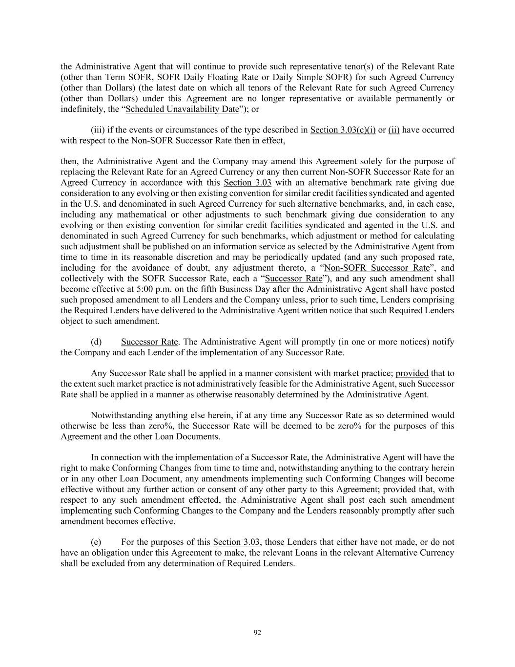 92 the Administrative Agent that will continue to provide such representative tenor(s) of the Relevant Rate (other than Term SOFR, SOFR Daily Floating Rate or Daily Simple SOFR) for such Agreed Currency (other than Dollars) (the latest date on which all tenors of the Relevant Rate for such Agreed Currency (other than Dollars) under this Agreement are no longer representative or available permanently or indefinitely, the “Scheduled Unavailability Date”); or (iii) if the events or circumstances of the type described in Section 3.03(c)(i) or (ii) have occurred with respect to the Non-SOFR Successor Rate then in effect, then, the Administrative Agent and the Company may amend this Agreement solely for the purpose of replacing the Relevant Rate for an Agreed Currency or any then current Non-SOFR Successor Rate for an Agreed Currency in accordance with this Section 3.03 with an alternative benchmark rate giving due consideration to any evolving or then existing convention for similar credit facilities syndicated and agented in the U.S. and denominated in such Agreed Currency for such alternative benchmarks, and, in each case, including any mathematical or other adjustments to such benchmark giving due consideration to any evolving or then existing convention for similar credit facilities syndicated and agented in the U.S. and denominated in such Agreed Currency for such benchmarks, which adjustment or method for calculating such adjustment shall be published on an information service as selected by the Administrative Agent from time to time in its reasonable discretion and may be periodically updated (and any such proposed rate, including for the avoidance of doubt, any adjustment thereto, a “Non-SOFR Successor Rate”, and collectively with the SOFR Successor Rate, each a “Successor Rate”), and any such amendment shall become effective at 5:00 p.m. on the fifth Business Day after the Administrative Agent shall have posted such proposed amendment to all Lenders and the Company unless, prior to such time, Lenders comprising the Required Lenders have delivered to the Administrative Agent written notice that such Required Lenders object to such amendment. (d) Successor Rate. The Administrative Agent will promptly (in one or more notices) notify the Company and each Lender of the implementation of any Successor Rate. Any Successor Rate shall be applied in a manner consistent with market practice; provided that to the extent such market practice is not administratively feasible for the Administrative Agent, such Successor Rate shall be applied in a manner as otherwise reasonably determined by the Administrative Agent. Notwithstanding anything else herein, if at any time any Successor Rate as so determined would otherwise be less than zero%, the Successor Rate will be deemed to be zero% for the purposes of this Agreement and the other Loan Documents. In connection with the implementation of a Successor Rate, the Administrative Agent will have the right to make Conforming Changes from time to time and, notwithstanding anything to the contrary herein or in any other Loan Document, any amendments implementing such Conforming Changes will become effective without any further action or consent of any other party to this Agreement; provided that, with respect to any such amendment effected, the Administrative Agent shall post each such amendment implementing such Conforming Changes to the Company and the Lenders reasonably promptly after such amendment becomes effective. (e) For the purposes of this Section 3.03, those Lenders that either have not made, or do not have an obligation under this Agreement to make, the relevant Loans in the relevant Alternative Currency shall be excluded from any determination of Required Lenders.