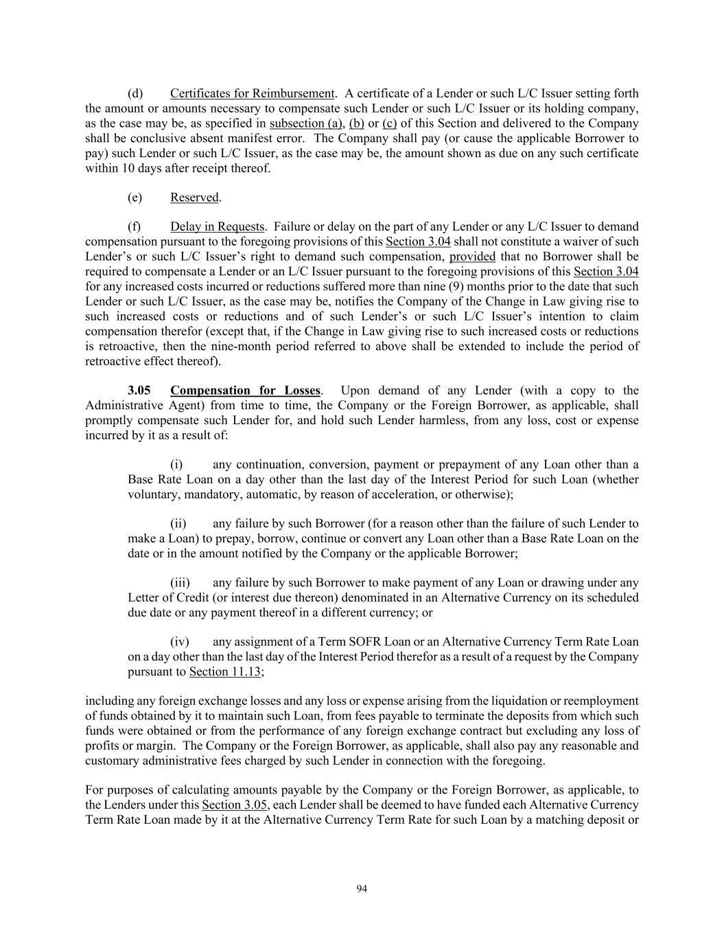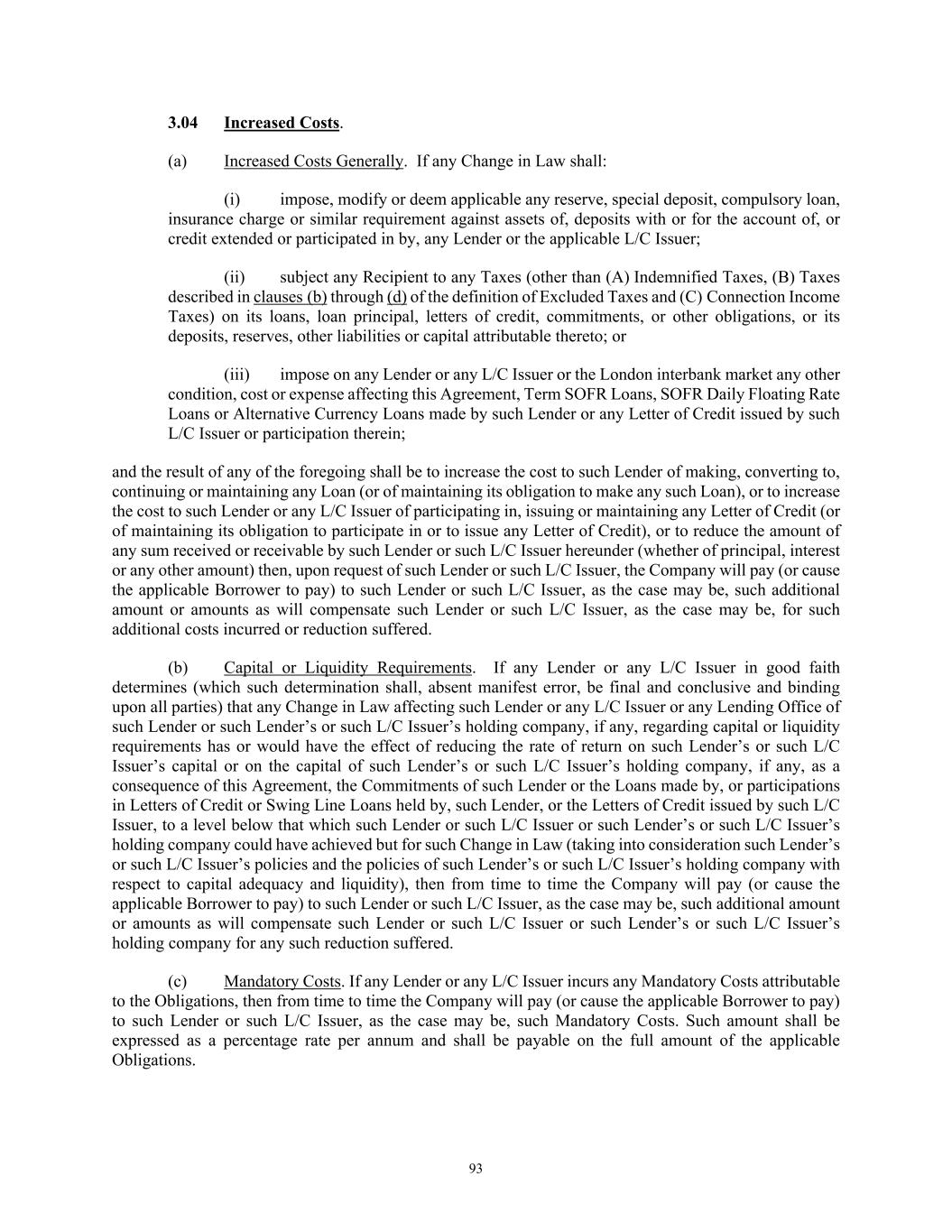 93 3.04 Increased Costs. (a) Increased Costs Generally. If any Change in Law shall: (i) impose, modify or deem applicable any reserve, special deposit, compulsory loan, insurance charge or similar requirement against assets of, deposits with or for the account of, or credit extended or participated in by, any Lender or the applicable L/C Issuer; (ii) subject any Recipient to any Taxes (other than (A) Indemnified Taxes, (B) Taxes described in clauses (b) through (d) of the definition of Excluded Taxes and (C) Connection Income Taxes) on its loans, loan principal, letters of credit, commitments, or other obligations, or its deposits, reserves, other liabilities or capital attributable thereto; or (iii) impose on any Lender or any L/C Issuer or the London interbank market any other condition, cost or expense affecting this Agreement, Term SOFR Loans, SOFR Daily Floating Rate Loans or Alternative Currency Loans made by such Lender or any Letter of Credit issued by such L/C Issuer or participation therein; and the result of any of the foregoing shall be to increase the cost to such Lender of making, converting to, continuing or maintaining any Loan (or of maintaining its obligation to make any such Loan), or to increase the cost to such Lender or any L/C Issuer of participating in, issuing or maintaining any Letter of Credit (or of maintaining its obligation to participate in or to issue any Letter of Credit), or to reduce the amount of any sum received or receivable by such Lender or such L/C Issuer hereunder (whether of principal, interest or any other amount) then, upon request of such Lender or such L/C Issuer, the Company will pay (or cause the applicable Borrower to pay) to such Lender or such L/C Issuer, as the case may be, such additional amount or amounts as will compensate such Lender or such L/C Issuer, as the case may be, for such additional costs incurred or reduction suffered. (b) Capital or Liquidity Requirements. If any Lender or any L/C Issuer in good faith determines (which such determination shall, absent manifest error, be final and conclusive and binding upon all parties) that any Change in Law affecting such Lender or any L/C Issuer or any Lending Office of such Lender or such Lender’s or such L/C Issuer’s holding company, if any, regarding capital or liquidity requirements has or would have the effect of reducing the rate of return on such Lender’s or such L/C Issuer’s capital or on the capital of such Lender’s or such L/C Issuer’s holding company, if any, as a consequence of this Agreement, the Commitments of such Lender or the Loans made by, or participations in Letters of Credit or Swing Line Loans held by, such Lender, or the Letters of Credit issued by such L/C Issuer, to a level below that which such Lender or such L/C Issuer or such Lender’s or such L/C Issuer’s holding company could have achieved but for such Change in Law (taking into consideration such Lender’s or such L/C Issuer’s policies and the policies of such Lender’s or such L/C Issuer’s holding company with respect to capital adequacy and liquidity), then from time to time the Company will pay (or cause the applicable Borrower to pay) to such Lender or such L/C Issuer, as the case may be, such additional amount or amounts as will compensate such Lender or such L/C Issuer or such Lender’s or such L/C Issuer’s holding company for any such reduction suffered. (c) Mandatory Costs. If any Lender or any L/C Issuer incurs any Mandatory Costs attributable to the Obligations, then from time to time the Company will pay (or cause the applicable Borrower to pay) to such Lender or such L/C Issuer, as the case may be, such Mandatory Costs. Such amount shall be expressed as a percentage rate per annum and shall be payable on the full amount of the applicable Obligations.