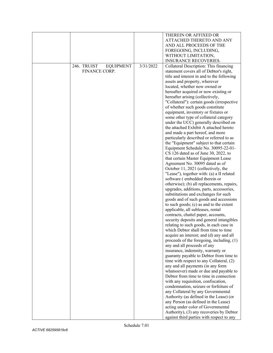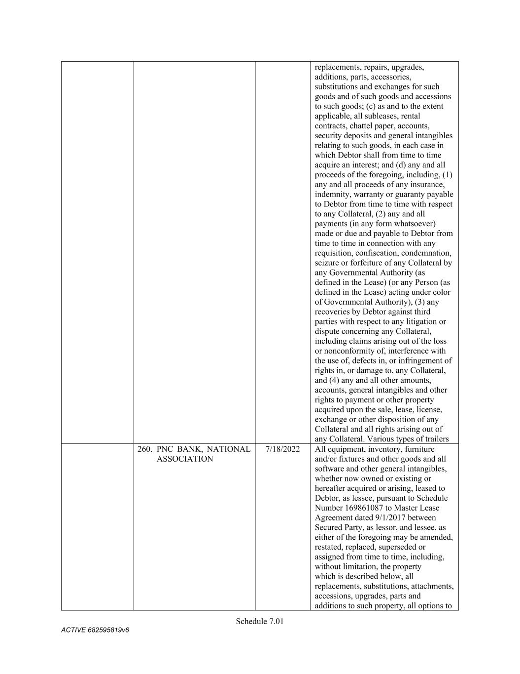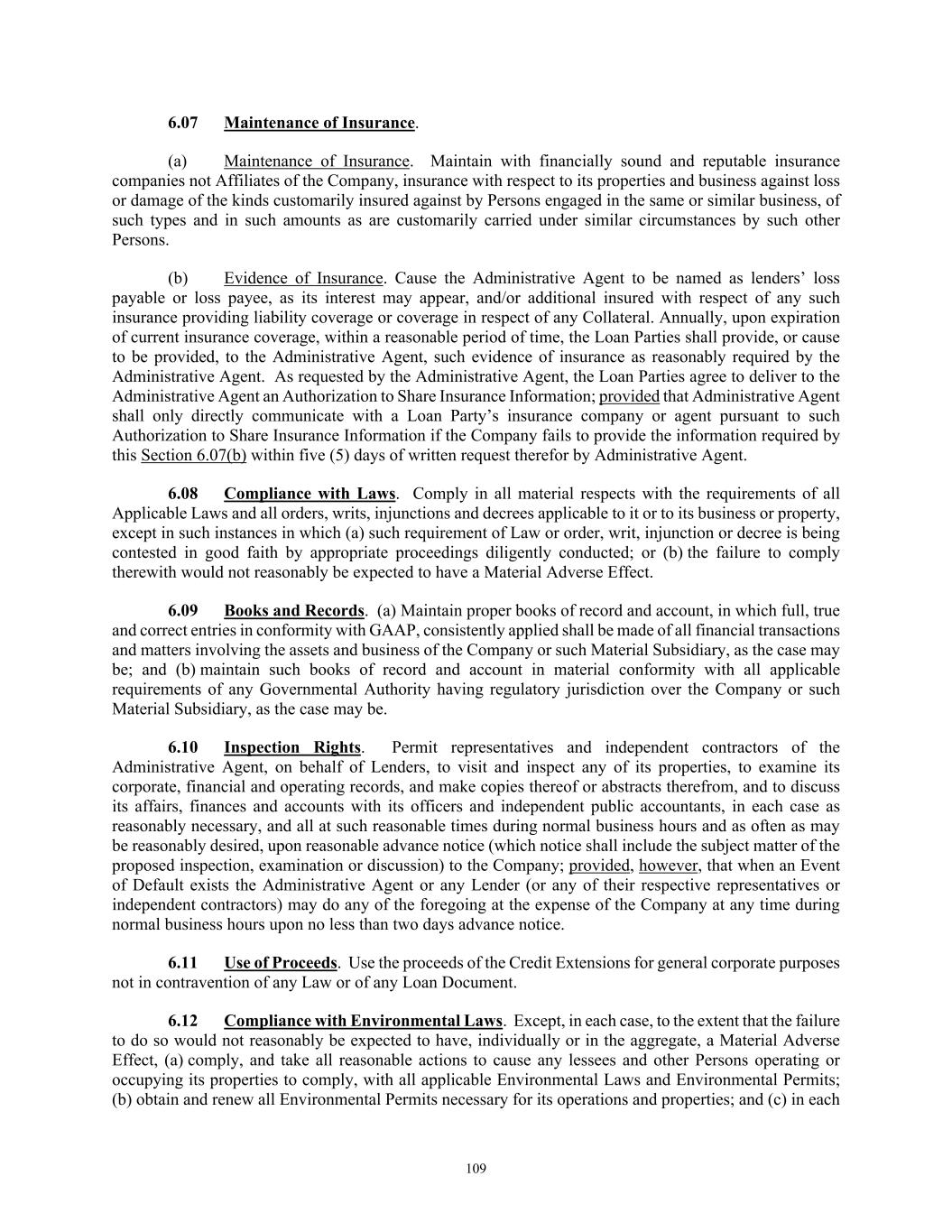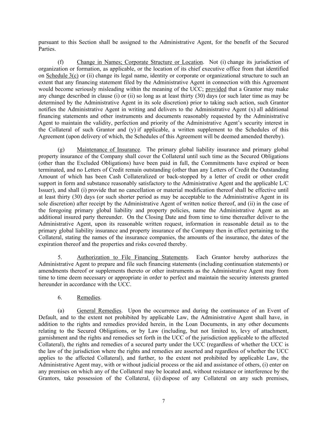 7 pursuant to this Section shall be assigned to the Administrative Agent, for the benefit of the Secured Parties. (f) Change in Names; Corporate Structure or Location. Not (i) change its jurisdiction of organization or formation, as applicable, or the location of its chief executive office from that identified on Schedule 3(c) or (ii) change its legal name, identity or corporate or organizational structure to such an extent that any financing statement filed by the Administrative Agent in connection with this Agreement would become seriously misleading within the meaning of the UCC; provided that a Grantor may make any change described in clause (i) or (ii) so long as at least thirty (30) days (or such later time as may be determined by the Administrative Agent in its sole discretion) prior to taking such action, such Grantor notifies the Administrative Agent in writing and delivers to the Administrative Agent (x) all additional financing statements and other instruments and documents reasonably requested by the Administrative Agent to maintain the validity, perfection and priority of the Administrative Agent’s security interest in the Collateral of such Grantor and (y) if applicable, a written supplement to the Schedules of this Agreement (upon delivery of which, the Schedules of this Agreement will be deemed amended thereby). (g) Maintenance of Insurance. The primary global liability insurance and primary global property insurance of the Company shall cover the Collateral until such time as the Secured Obligations (other than the Excluded Obligations) have been paid in full, the Commitments have expired or been terminated, and no Letters of Credit remain outstanding (other than any Letters of Credit the Outstanding Amount of which has been Cash Collateralized or back-stopped by a letter of credit or other credit support in form and substance reasonably satisfactory to the Administrative Agent and the applicable L/C Issuer), and shall (i) provide that no cancellation or material modification thereof shall be effective until at least thirty (30) days (or such shorter period as may be acceptable to the Administrative Agent in its sole discretion) after receipt by the Administrative Agent of written notice thereof, and (ii) in the case of the foregoing primary global liability and property policies, name the Administrative Agent as an additional insured party thereunder. On the Closing Date and from time to time thereafter deliver to the Administrative Agent, upon its reasonable written request, information in reasonable detail as to the primary global liability insurance and property insurance of the Company then in effect pertaining to the Collateral, stating the names of the insurance companies, the amounts of the insurance, the dates of the expiration thereof and the properties and risks covered thereby. 5. Authorization to File Financing Statements. Each Grantor hereby authorizes the Administrative Agent to prepare and file such financing statements (including continuation statements) or amendments thereof or supplements thereto or other instruments as the Administrative Agent may from time to time deem necessary or appropriate in order to perfect and maintain the security interests granted hereunder in accordance with the UCC. 6. Remedies. (a) General Remedies. Upon the occurrence and during the continuance of an Event of Default, and to the extent not prohibited by applicable Law, the Administrative Agent shall have, in addition to the rights and remedies provided herein, in the Loan Documents, in any other documents relating to the Secured Obligations, or by Law (including, but not limited to, levy of attachment, garnishment and the rights and remedies set forth in the UCC of the jurisdiction applicable to the affected Collateral), the rights and remedies of a secured party under the UCC (regardless of whether the UCC is the law of the jurisdiction where the rights and remedies are asserted and regardless of whether the UCC applies to the affected Collateral), and further, to the extent not prohibited by applicable Law, the Administrative Agent may, with or without judicial process or the aid and assistance of others, (i) enter on any premises on which any of the Collateral may be located and, without resistance or interference by the Grantors, take possession of the Collateral, (ii) dispose of any Collateral on any such premises,