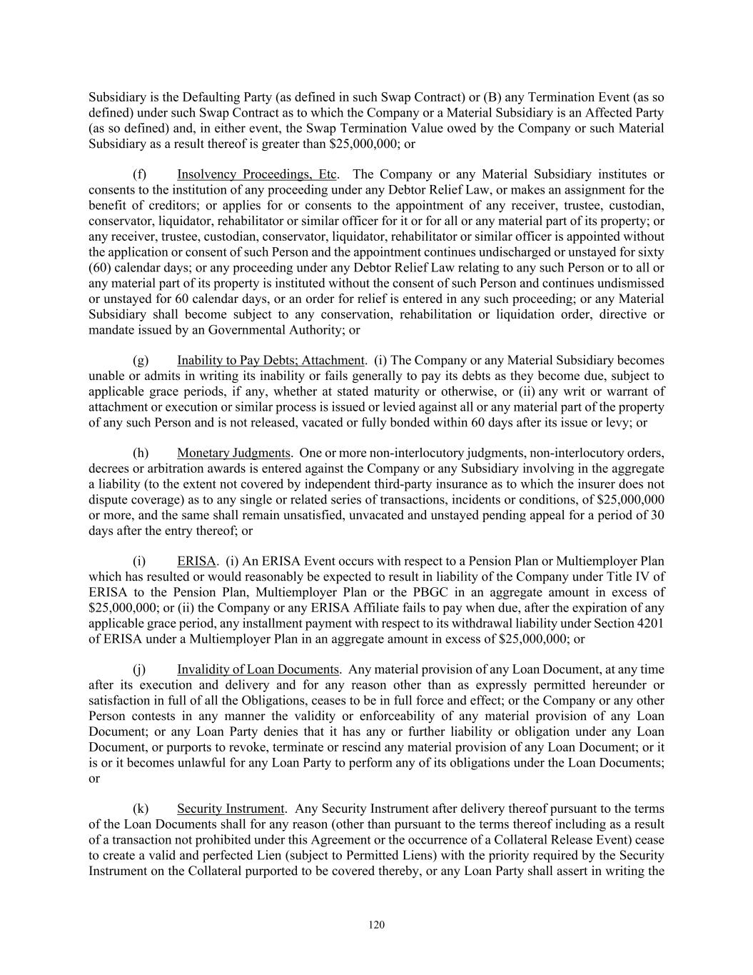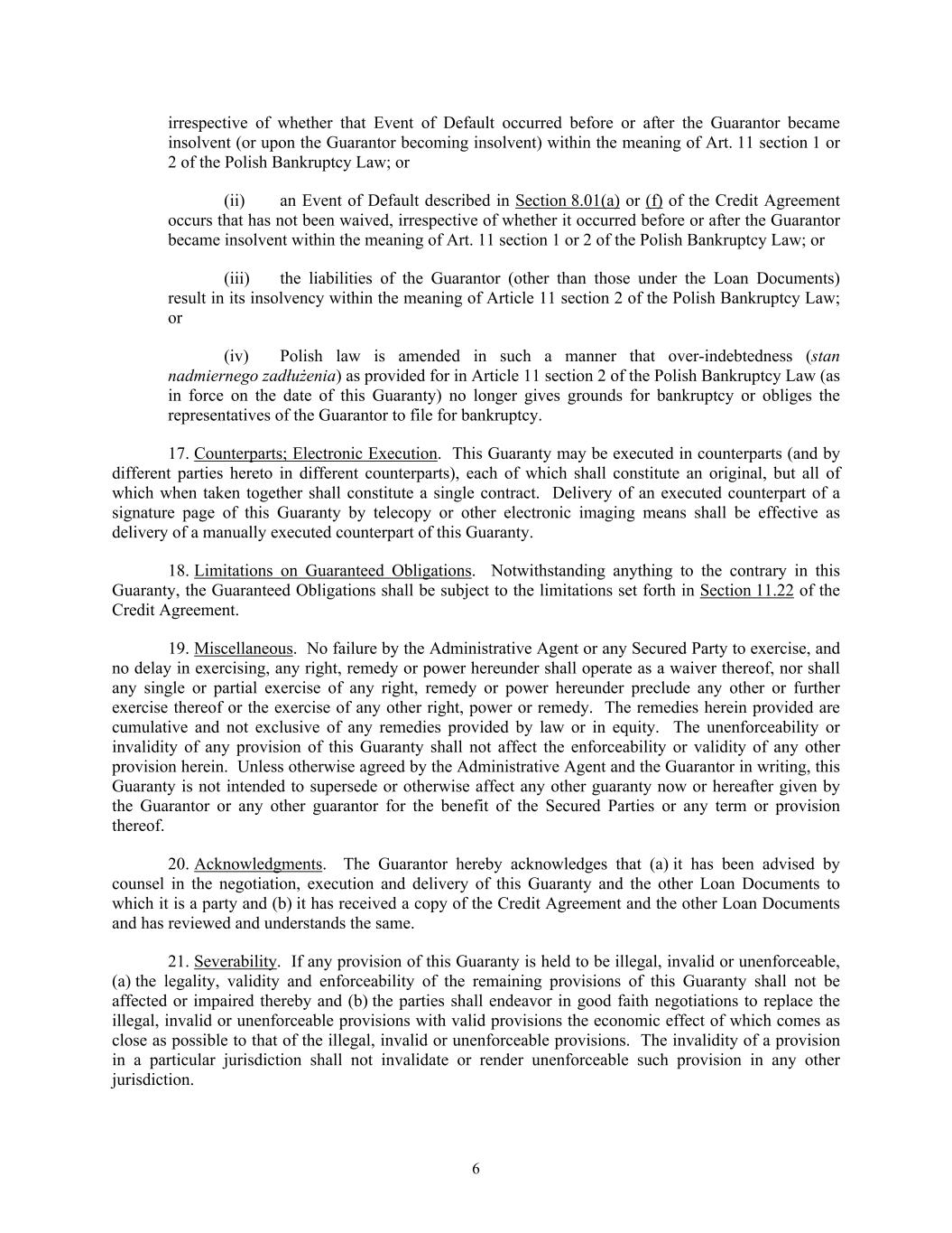 6 irrespective of whether that Event of Default occurred before or after the Guarantor became insolvent (or upon the Guarantor becoming insolvent) within the meaning of Art. 11 section 1 or 2 of the Polish Bankruptcy Law; or (ii) an Event of Default described in Section 8.01(a) or (f) of the Credit Agreement occurs that has not been waived, irrespective of whether it occurred before or after the Guarantor became insolvent within the meaning of Art. 11 section 1 or 2 of the Polish Bankruptcy Law; or (iii) the liabilities of the Guarantor (other than those under the Loan Documents) result in its insolvency within the meaning of Article 11 section 2 of the Polish Bankruptcy Law; or (iv) Polish law is amended in such a manner that over-indebtedness (stan nadmiernego zadłużenia) as provided for in Article 11 section 2 of the Polish Bankruptcy Law (as in force on the date of this Guaranty) no longer gives grounds for bankruptcy or obliges the representatives of the Guarantor to file for bankruptcy. 17. Counterparts; Electronic Execution. This Guaranty may be executed in counterparts (and by different parties hereto in different counterparts), each of which shall constitute an original, but all of which when taken together shall constitute a single contract. Delivery of an executed counterpart of a signature page of this Guaranty by telecopy or other electronic imaging means shall be effective as delivery of a manually executed counterpart of this Guaranty. 18. Limitations on Guaranteed Obligations. Notwithstanding anything to the contrary in this Guaranty, the Guaranteed Obligations shall be subject to the limitations set forth in Section 11.22 of the Credit Agreement. 19. Miscellaneous. No failure by the Administrative Agent or any Secured Party to exercise, and no delay in exercising, any right, remedy or power hereunder shall operate as a waiver thereof, nor shall any single or partial exercise of any right, remedy or power hereunder preclude any other or further exercise thereof or the exercise of any other right, power or remedy. The remedies herein provided are cumulative and not exclusive of any remedies provided by law or in equity. The unenforceability or invalidity of any provision of this Guaranty shall not affect the enforceability or validity of any other provision herein. Unless otherwise agreed by the Administrative Agent and the Guarantor in writing, this Guaranty is not intended to supersede or otherwise affect any other guaranty now or hereafter given by the Guarantor or any other guarantor for the benefit of the Secured Parties or any term or provision thereof. 20. Acknowledgments. The Guarantor hereby acknowledges that (a) it has been advised by counsel in the negotiation, execution and delivery of this Guaranty and the other Loan Documents to which it is a party and (b) it has received a copy of the Credit Agreement and the other Loan Documents and has reviewed and understands the same. 21. Severability. If any provision of this Guaranty is held to be illegal, invalid or unenforceable, (a) the legality, validity and enforceability of the remaining provisions of this Guaranty shall not be affected or impaired thereby and (b) the parties shall endeavor in good faith negotiations to replace the illegal, invalid or unenforceable provisions with valid provisions the economic effect of which comes as close as possible to that of the illegal, invalid or unenforceable provisions. The invalidity of a provision in a particular jurisdiction shall not invalidate or render unenforceable such provision in any other jurisdiction.