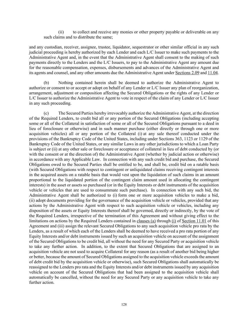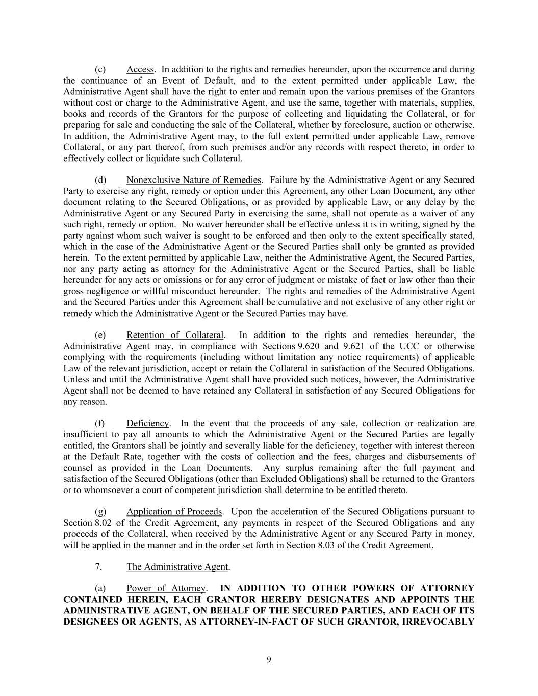 9 (c) Access. In addition to the rights and remedies hereunder, upon the occurrence and during the continuance of an Event of Default, and to the extent permitted under applicable Law, the Administrative Agent shall have the right to enter and remain upon the various premises of the Grantors without cost or charge to the Administrative Agent, and use the same, together with materials, supplies, books and records of the Grantors for the purpose of collecting and liquidating the Collateral, or for preparing for sale and conducting the sale of the Collateral, whether by foreclosure, auction or otherwise. In addition, the Administrative Agent may, to the full extent permitted under applicable Law, remove Collateral, or any part thereof, from such premises and/or any records with respect thereto, in order to effectively collect or liquidate such Collateral. (d) Nonexclusive Nature of Remedies. Failure by the Administrative Agent or any Secured Party to exercise any right, remedy or option under this Agreement, any other Loan Document, any other document relating to the Secured Obligations, or as provided by applicable Law, or any delay by the Administrative Agent or any Secured Party in exercising the same, shall not operate as a waiver of any such right, remedy or option. No waiver hereunder shall be effective unless it is in writing, signed by the party against whom such waiver is sought to be enforced and then only to the extent specifically stated, which in the case of the Administrative Agent or the Secured Parties shall only be granted as provided herein. To the extent permitted by applicable Law, neither the Administrative Agent, the Secured Parties, nor any party acting as attorney for the Administrative Agent or the Secured Parties, shall be liable hereunder for any acts or omissions or for any error of judgment or mistake of fact or law other than their gross negligence or willful misconduct hereunder. The rights and remedies of the Administrative Agent and the Secured Parties under this Agreement shall be cumulative and not exclusive of any other right or remedy which the Administrative Agent or the Secured Parties may have. (e) Retention of Collateral. In addition to the rights and remedies hereunder, the Administrative Agent may, in compliance with Sections 9.620 and 9.621 of the UCC or otherwise complying with the requirements (including without limitation any notice requirements) of applicable Law of the relevant jurisdiction, accept or retain the Collateral in satisfaction of the Secured Obligations. Unless and until the Administrative Agent shall have provided such notices, however, the Administrative Agent shall not be deemed to have retained any Collateral in satisfaction of any Secured Obligations for any reason. (f) Deficiency. In the event that the proceeds of any sale, collection or realization are insufficient to pay all amounts to which the Administrative Agent or the Secured Parties are legally entitled, the Grantors shall be jointly and severally liable for the deficiency, together with interest thereon at the Default Rate, together with the costs of collection and the fees, charges and disbursements of counsel as provided in the Loan Documents. Any surplus remaining after the full payment and satisfaction of the Secured Obligations (other than Excluded Obligations) shall be returned to the Grantors or to whomsoever a court of competent jurisdiction shall determine to be entitled thereto. (g) Application of Proceeds. Upon the acceleration of the Secured Obligations pursuant to Section 8.02 of the Credit Agreement, any payments in respect of the Secured Obligations and any proceeds of the Collateral, when received by the Administrative Agent or any Secured Party in money, will be applied in the manner and in the order set forth in Section 8.03 of the Credit Agreement. 7. The Administrative Agent. (a) Power of Attorney. IN ADDITION TO OTHER POWERS OF ATTORNEY CONTAINED HEREIN, EACH GRANTOR HEREBY DESIGNATES AND APPOINTS THE ADMINISTRATIVE AGENT, ON BEHALF OF THE SECURED PARTIES, AND EACH OF ITS DESIGNEES OR AGENTS, AS ATTORNEY-IN-FACT OF SUCH GRANTOR, IRREVOCABLY