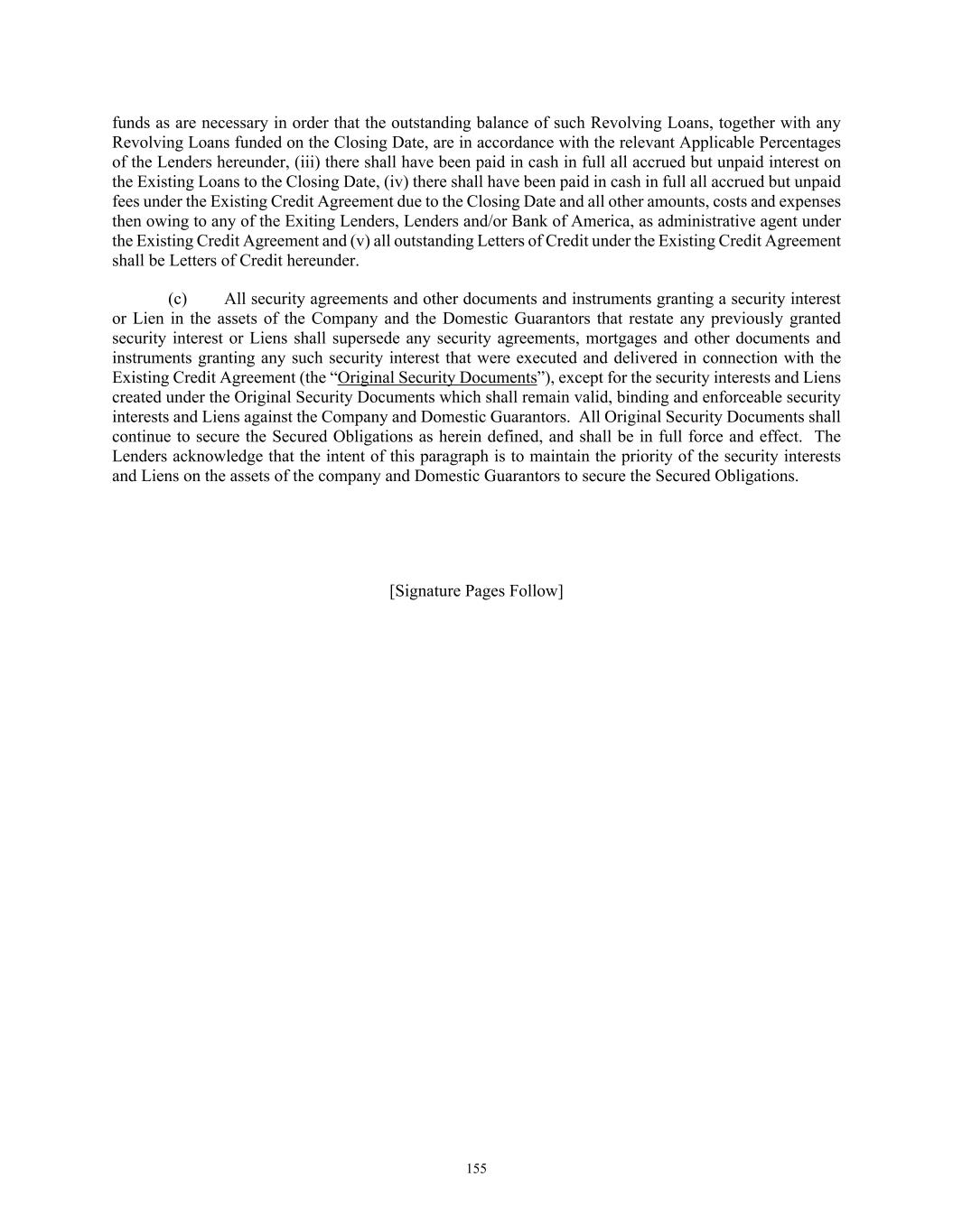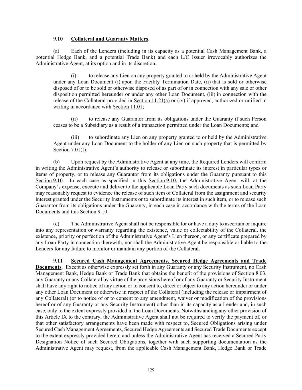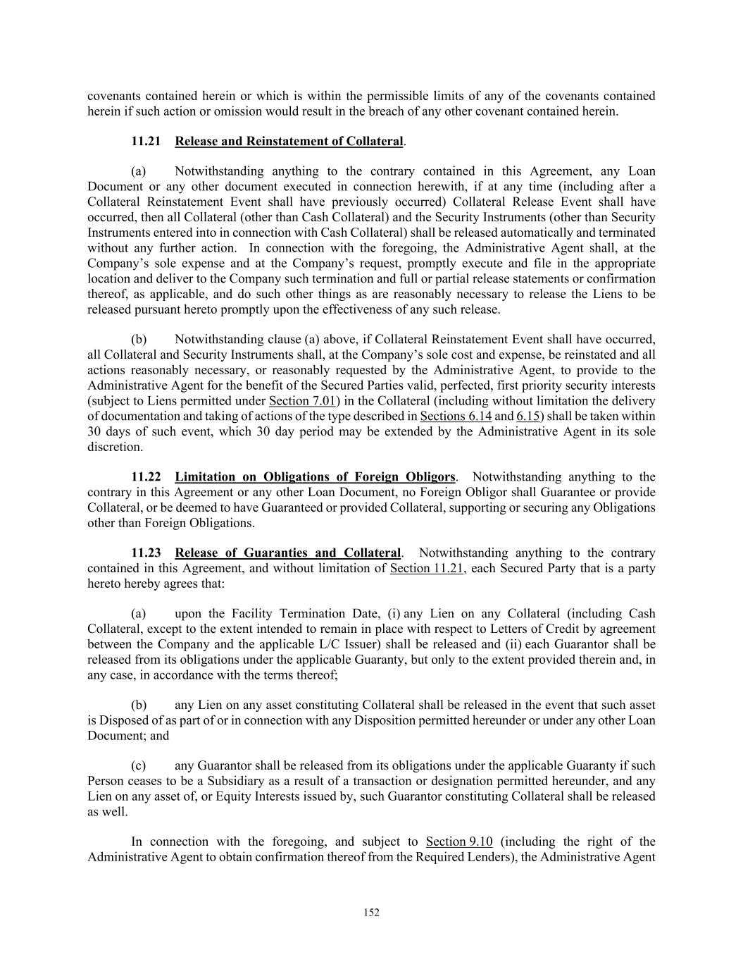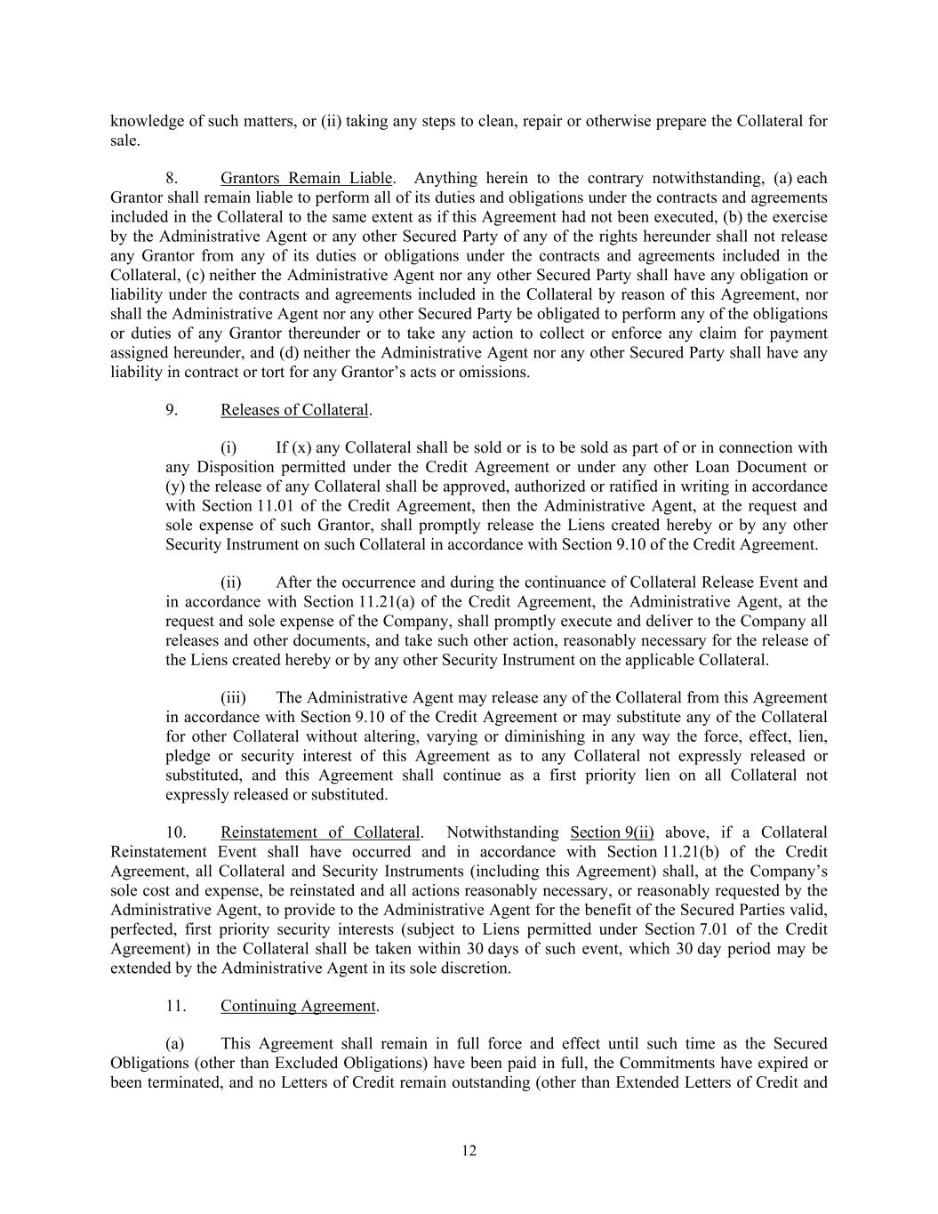 12 knowledge of such matters, or (ii) taking any steps to clean, repair or otherwise prepare the Collateral for sale. 8. Grantors Remain Liable. Anything herein to the contrary notwithstanding, (a) each Grantor shall remain liable to perform all of its duties and obligations under the contracts and agreements included in the Collateral to the same extent as if this Agreement had not been executed, (b) the exercise by the Administrative Agent or any other Secured Party of any of the rights hereunder shall not release any Grantor from any of its duties or obligations under the contracts and agreements included in the Collateral, (c) neither the Administrative Agent nor any other Secured Party shall have any obligation or liability under the contracts and agreements included in the Collateral by reason of this Agreement, nor shall the Administrative Agent nor any other Secured Party be obligated to perform any of the obligations or duties of any Grantor thereunder or to take any action to collect or enforce any claim for payment assigned hereunder, and (d) neither the Administrative Agent nor any other Secured Party shall have any liability in contract or tort for any Grantor’s acts or omissions. 9. Releases of Collateral. (i) If (x) any Collateral shall be sold or is to be sold as part of or in connection with any Disposition permitted under the Credit Agreement or under any other Loan Document or (y) the release of any Collateral shall be approved, authorized or ratified in writing in accordance with Section 11.01 of the Credit Agreement, then the Administrative Agent, at the request and sole expense of such Grantor, shall promptly release the Liens created hereby or by any other Security Instrument on such Collateral in accordance with Section 9.10 of the Credit Agreement. (ii) After the occurrence and during the continuance of Collateral Release Event and in accordance with Section 11.21(a) of the Credit Agreement, the Administrative Agent, at the request and sole expense of the Company, shall promptly execute and deliver to the Company all releases and other documents, and take such other action, reasonably necessary for the release of the Liens created hereby or by any other Security Instrument on the applicable Collateral. (iii) The Administrative Agent may release any of the Collateral from this Agreement in accordance with Section 9.10 of the Credit Agreement or may substitute any of the Collateral for other Collateral without altering, varying or diminishing in any way the force, effect, lien, pledge or security interest of this Agreement as to any Collateral not expressly released or substituted, and this Agreement shall continue as a first priority lien on all Collateral not expressly released or substituted. 10. Reinstatement of Collateral. Notwithstanding Section 9(ii) above, if a Collateral Reinstatement Event shall have occurred and in accordance with Section 11.21(b) of the Credit Agreement, all Collateral and Security Instruments (including this Agreement) shall, at the Company’s sole cost and expense, be reinstated and all actions reasonably necessary, or reasonably requested by the Administrative Agent, to provide to the Administrative Agent for the benefit of the Secured Parties valid, perfected, first priority security interests (subject to Liens permitted under Section 7.01 of the Credit Agreement) in the Collateral shall be taken within 30 days of such event, which 30 day period may be extended by the Administrative Agent in its sole discretion. 11. Continuing Agreement. (a) This Agreement shall remain in full force and effect until such time as the Secured Obligations (other than Excluded Obligations) have been paid in full, the Commitments have expired or been terminated, and no Letters of Credit remain outstanding (other than Extended Letters of Credit and