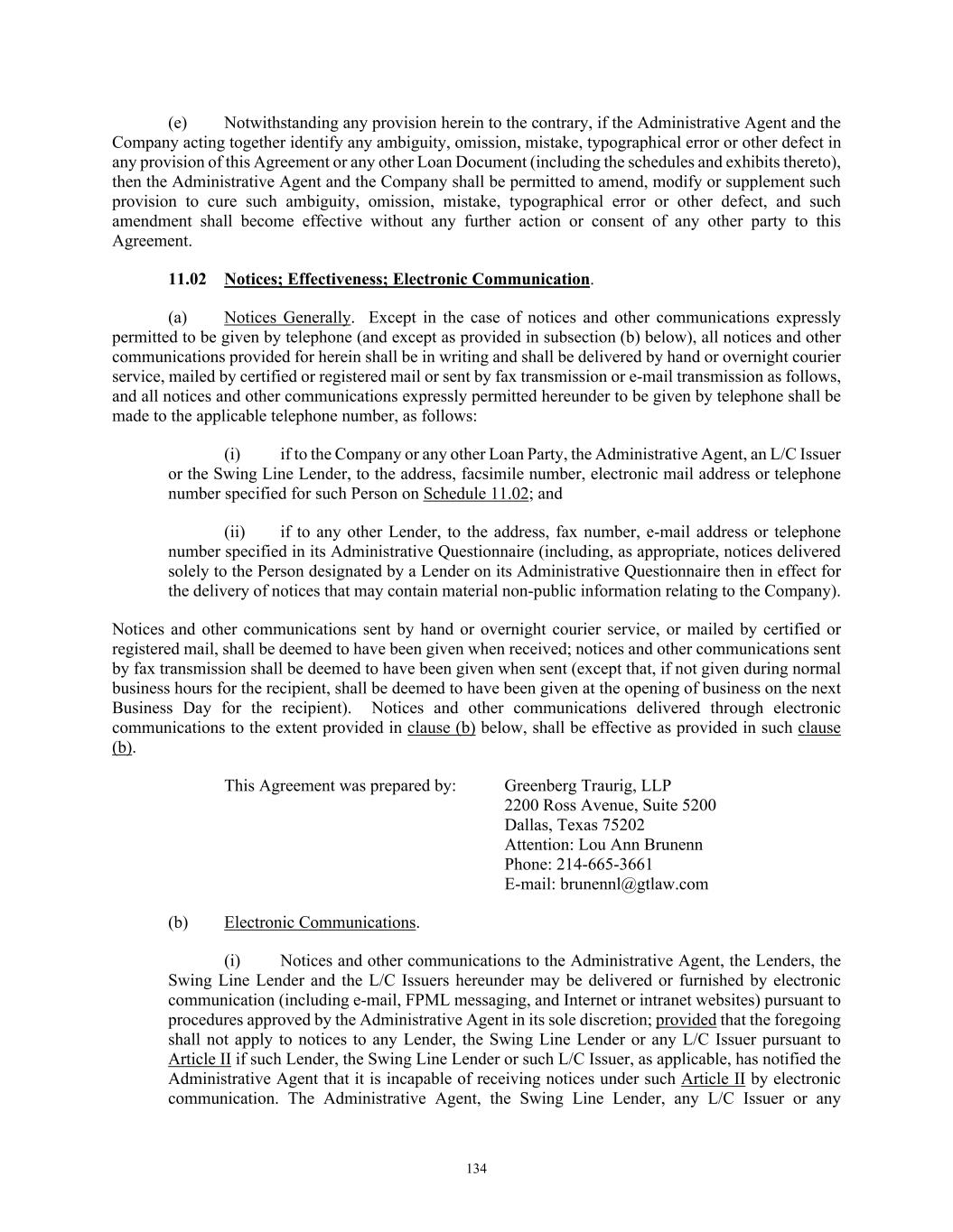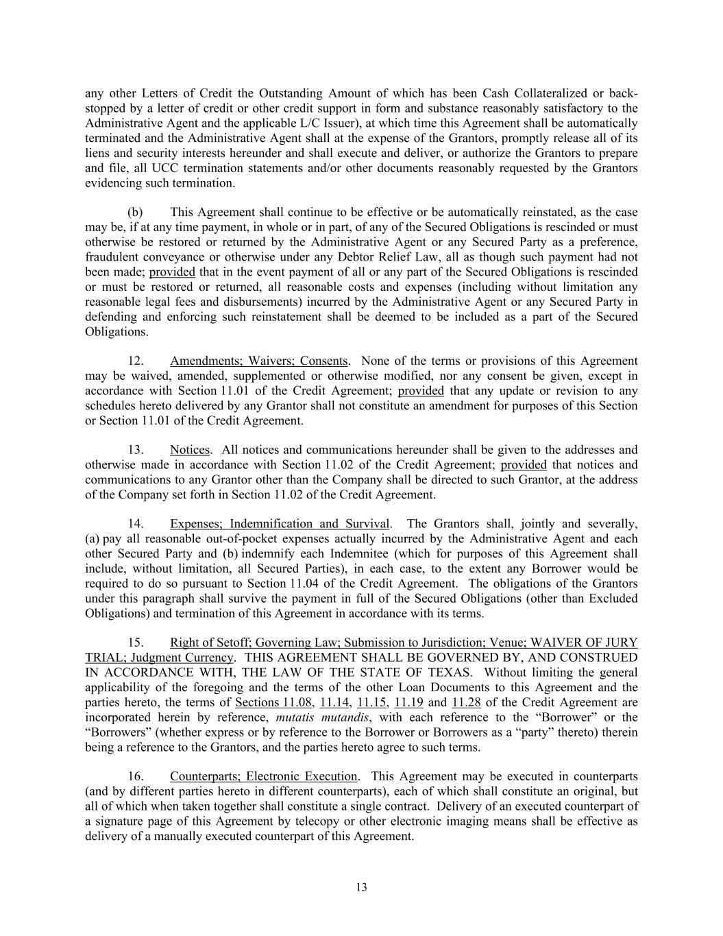 13 any other Letters of Credit the Outstanding Amount of which has been Cash Collateralized or back- stopped by a letter of credit or other credit support in form and substance reasonably satisfactory to the Administrative Agent and the applicable L/C Issuer), at which time this Agreement shall be automatically terminated and the Administrative Agent shall at the expense of the Grantors, promptly release all of its liens and security interests hereunder and shall execute and deliver, or authorize the Grantors to prepare and file, all UCC termination statements and/or other documents reasonably requested by the Grantors evidencing such termination. (b) This Agreement shall continue to be effective or be automatically reinstated, as the case may be, if at any time payment, in whole or in part, of any of the Secured Obligations is rescinded or must otherwise be restored or returned by the Administrative Agent or any Secured Party as a preference, fraudulent conveyance or otherwise under any Debtor Relief Law, all as though such payment had not been made; provided that in the event payment of all or any part of the Secured Obligations is rescinded or must be restored or returned, all reasonable costs and expenses (including without limitation any reasonable legal fees and disbursements) incurred by the Administrative Agent or any Secured Party in defending and enforcing such reinstatement shall be deemed to be included as a part of the Secured Obligations. 12. Amendments; Waivers; Consents. None of the terms or provisions of this Agreement may be waived, amended, supplemented or otherwise modified, nor any consent be given, except in accordance with Section 11.01 of the Credit Agreement; provided that any update or revision to any schedules hereto delivered by any Grantor shall not constitute an amendment for purposes of this Section or Section 11.01 of the Credit Agreement. 13. Notices. All notices and communications hereunder shall be given to the addresses and otherwise made in accordance with Section 11.02 of the Credit Agreement; provided that notices and communications to any Grantor other than the Company shall be directed to such Grantor, at the address of the Company set forth in Section 11.02 of the Credit Agreement. 14. Expenses; Indemnification and Survival. The Grantors shall, jointly and severally, (a) pay all reasonable out-of-pocket expenses actually incurred by the Administrative Agent and each other Secured Party and (b) indemnify each Indemnitee (which for purposes of this Agreement shall include, without limitation, all Secured Parties), in each case, to the extent any Borrower would be required to do so pursuant to Section 11.04 of the Credit Agreement. The obligations of the Grantors under this paragraph shall survive the payment in full of the Secured Obligations (other than Excluded Obligations) and termination of this Agreement in accordance with its terms. 15. Right of Setoff; Governing Law; Submission to Jurisdiction; Venue; WAIVER OF JURY TRIAL; Judgment Currency. THIS AGREEMENT SHALL BE GOVERNED BY, AND CONSTRUED IN ACCORDANCE WITH, THE LAW OF THE STATE OF TEXAS. Without limiting the general applicability of the foregoing and the terms of the other Loan Documents to this Agreement and the parties hereto, the terms of Sections 11.08, 11.14, 11.15, 11.19 and 11.28 of the Credit Agreement are incorporated herein by reference, mutatis mutandis, with each reference to the “Borrower” or the “Borrowers” (whether express or by reference to the Borrower or Borrowers as a “party” thereto) therein being a reference to the Grantors, and the parties hereto agree to such terms. 16. Counterparts; Electronic Execution. This Agreement may be executed in counterparts (and by different parties hereto in different counterparts), each of which shall constitute an original, but all of which when taken together shall constitute a single contract. Delivery of an executed counterpart of a signature page of this Agreement by telecopy or other electronic imaging means shall be effective as delivery of a manually executed counterpart of this Agreement.