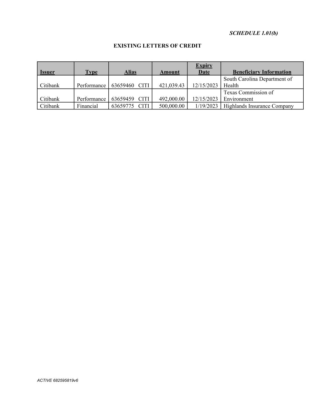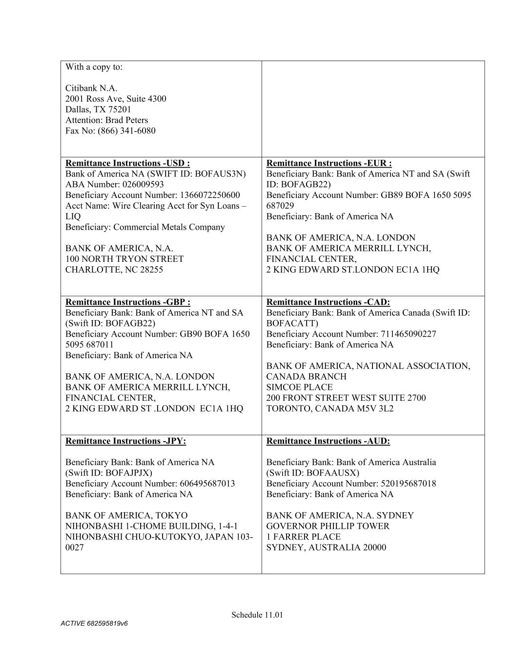 Schedule 11.01 ACTIVE 682595819v6 With a copy to: Citibank N.A. 2001 Ross Ave, Suite 4300 Dallas, TX 75201 Attention: Brad Peters Fax No: (866) 341-6080 Remittance Instructions -USD : Bank of America NA (SWIFT ID: BOFAUS3N) ABA Number: 026009593 Beneficiary Account Number: 1366072250600 Acct Name: Wire Clearing Acct for Syn Loans – LIQ Beneficiary: Commercial Metals Company BANK OF AMERICA, N.A. 100 NORTH TRYON STREET CHARLOTTE, NC 28255 Remittance Instructions -EUR : Beneficiary Bank: Bank of America NT and SA (Swift ID: BOFAGB22) Beneficiary Account Number: GB89 BOFA 1650 5095 687029 Beneficiary: Bank of America NA BANK OF AMERICA, N.A. LONDON BANK OF AMERICA MERRILL LYNCH, FINANCIAL CENTER, 2 KING EDWARD ST.LONDON EC1A 1HQ Remittance Instructions -GBP : Beneficiary Bank: Bank of America NT and SA (Swift ID: BOFAGB22) Beneficiary Account Number: GB90 BOFA 1650 5095 687011 Beneficiary: Bank of America NA BANK OF AMERICA, N.A. LONDON BANK OF AMERICA MERRILL LYNCH, FINANCIAL CENTER, 2 KING EDWARD ST .LONDON EC1A 1HQ Remittance Instructions -CAD: Beneficiary Bank: Bank of America Canada (Swift ID: BOFACATT) Beneficiary Account Number: 711465090227 Beneficiary: Bank of America NA BANK OF AMERICA, NATIONAL ASSOCIATION, CANADA BRANCH SIMCOE PLACE 200 FRONT STREET WEST SUITE 2700 TORONTO, CANADA M5V 3L2 Remittance Instructions -JPY: Beneficiary Bank: Bank of America NA (Swift ID: BOFAJPJX) Beneficiary Account Number: 606495687013 Beneficiary: Bank of America NA BANK OF AMERICA, TOKYO NIHONBASHI 1-CHOME BUILDING, 1-4-1 NIHONBASHI CHUO-KUTOKYO, JAPAN 103- 0027 Remittance Instructions -AUD: Beneficiary Bank: Bank of America Australia (Swift ID: BOFAAUSX) Beneficiary Account Number: 520195687018 Beneficiary: Bank of America NA BANK OF AMERICA, N.A. SYDNEY GOVERNOR PHILLIP TOWER 1 FARRER PLACE SYDNEY, AUSTRALIA 20000