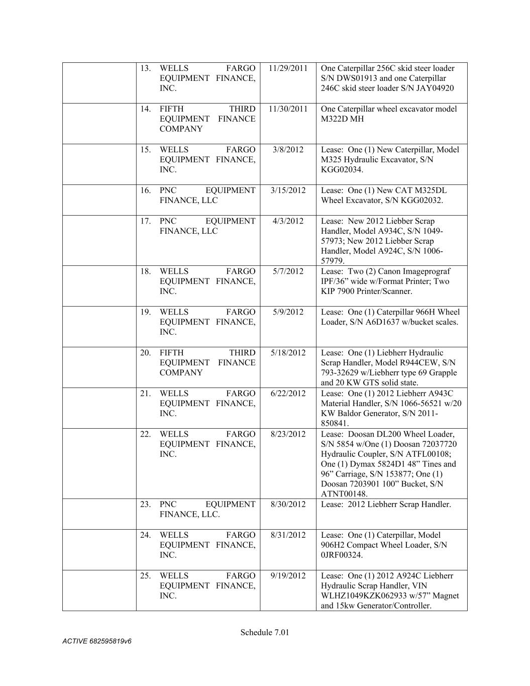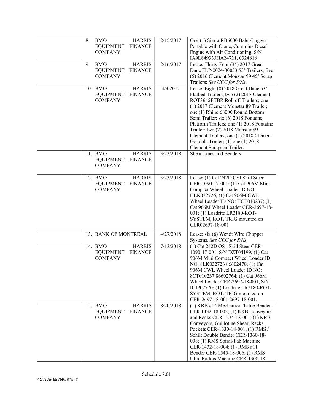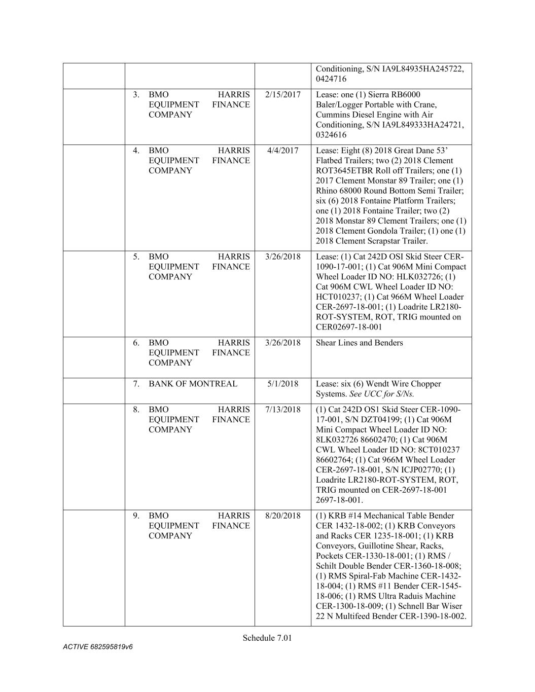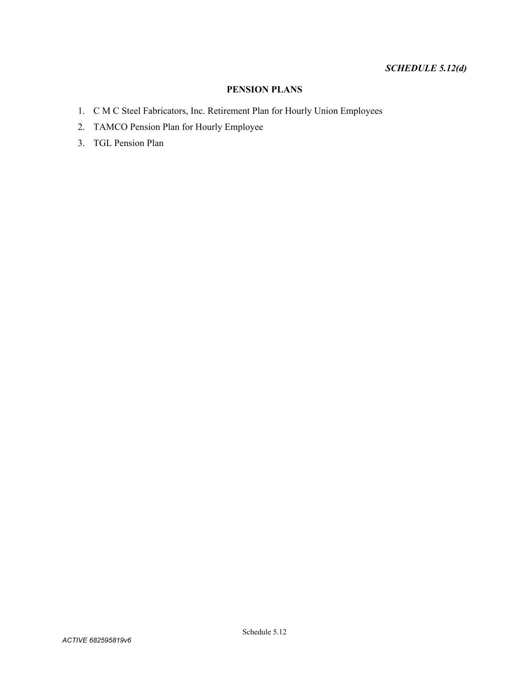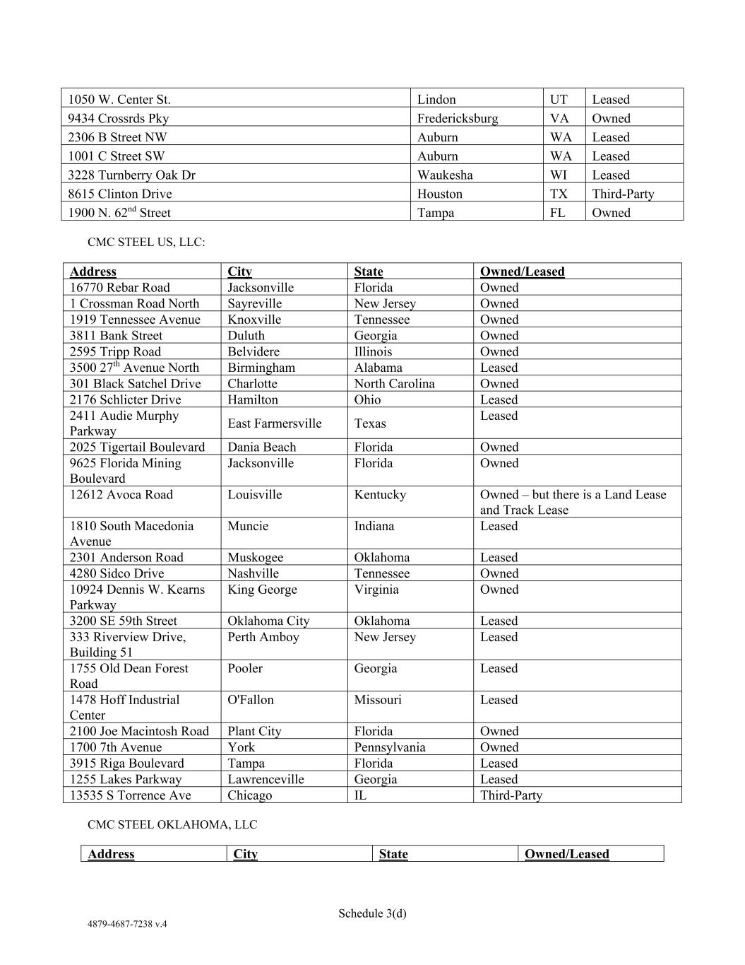 4879-4687-7238 v.4 Schedule 3(d) 1050 W. Center St. Lindon UT Leased 9434 Crossrds Pky Fredericksburg VA Owned 2306 B Street NW Auburn WA Leased 1001 C Street SW Auburn WA Leased 3228 Turnberry Oak Dr Waukesha WI Leased 8615 Clinton Drive Houston TX Third-Party 1900 N. 62nd Street Tampa FL Owned CMC STEEL US, LLC: Address City State Owned/Leased 16770 Rebar Road Jacksonville Florida Owned 1 Crossman Road North Sayreville New Jersey Owned 1919 Tennessee Avenue Knoxville Tennessee Owned 3811 Bank Street Duluth Georgia Owned 2595 Tripp Road Belvidere Illinois Owned 3500 27th Avenue North Birmingham Alabama Leased 301 Black Satchel Drive Charlotte North Carolina Owned 2176 Schlicter Drive Hamilton Ohio Leased 2411 Audie Murphy Parkway East Farmersville Texas Leased 2025 Tigertail Boulevard Dania Beach Florida Owned 9625 Florida Mining Boulevard Jacksonville Florida Owned 12612 Avoca Road Louisville Kentucky Owned – but there is a Land Lease and Track Lease 1810 South Macedonia Avenue Muncie Indiana Leased 2301 Anderson Road Muskogee Oklahoma Leased 4280 Sidco Drive Nashville Tennessee Owned 10924 Dennis W. Kearns Parkway King George Virginia Owned 3200 SE 59th Street Oklahoma City Oklahoma Leased 333 Riverview Drive, Building 51 Perth Amboy New Jersey Leased 1755 Old Dean Forest Road Pooler Georgia Leased 1478 Hoff Industrial Center O'Fallon Missouri Leased 2100 Joe Macintosh Road Plant City Florida Owned 1700 7th Avenue York Pennsylvania Owned 3915 Riga Boulevard Tampa Florida Leased 1255 Lakes Parkway Lawrenceville Georgia Leased 13535 S Torrence Ave Chicago IL Third-Party CMC STEEL OKLAHOMA, LLC Address City State Owned/Leased