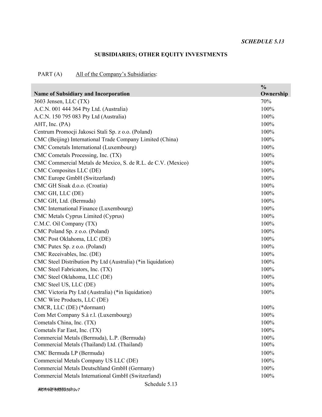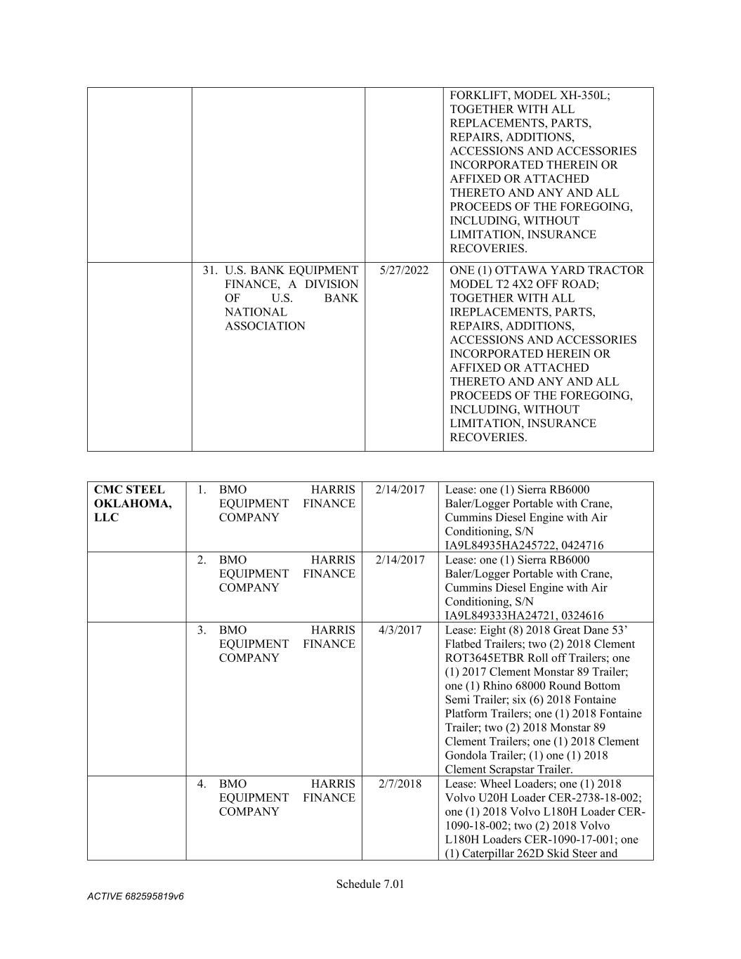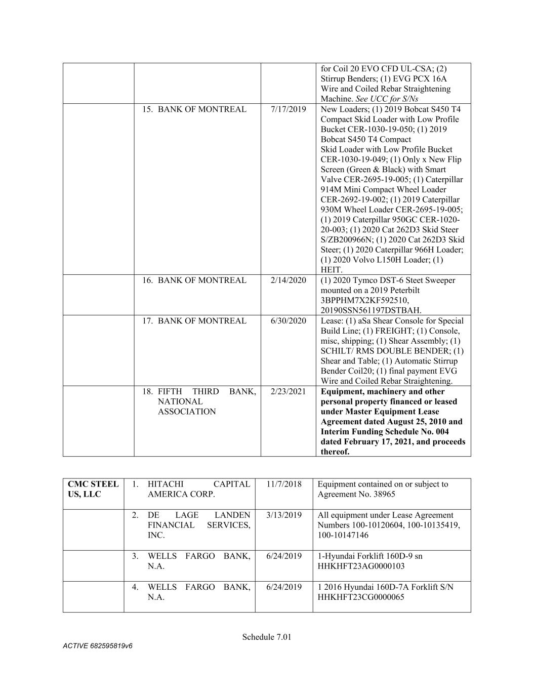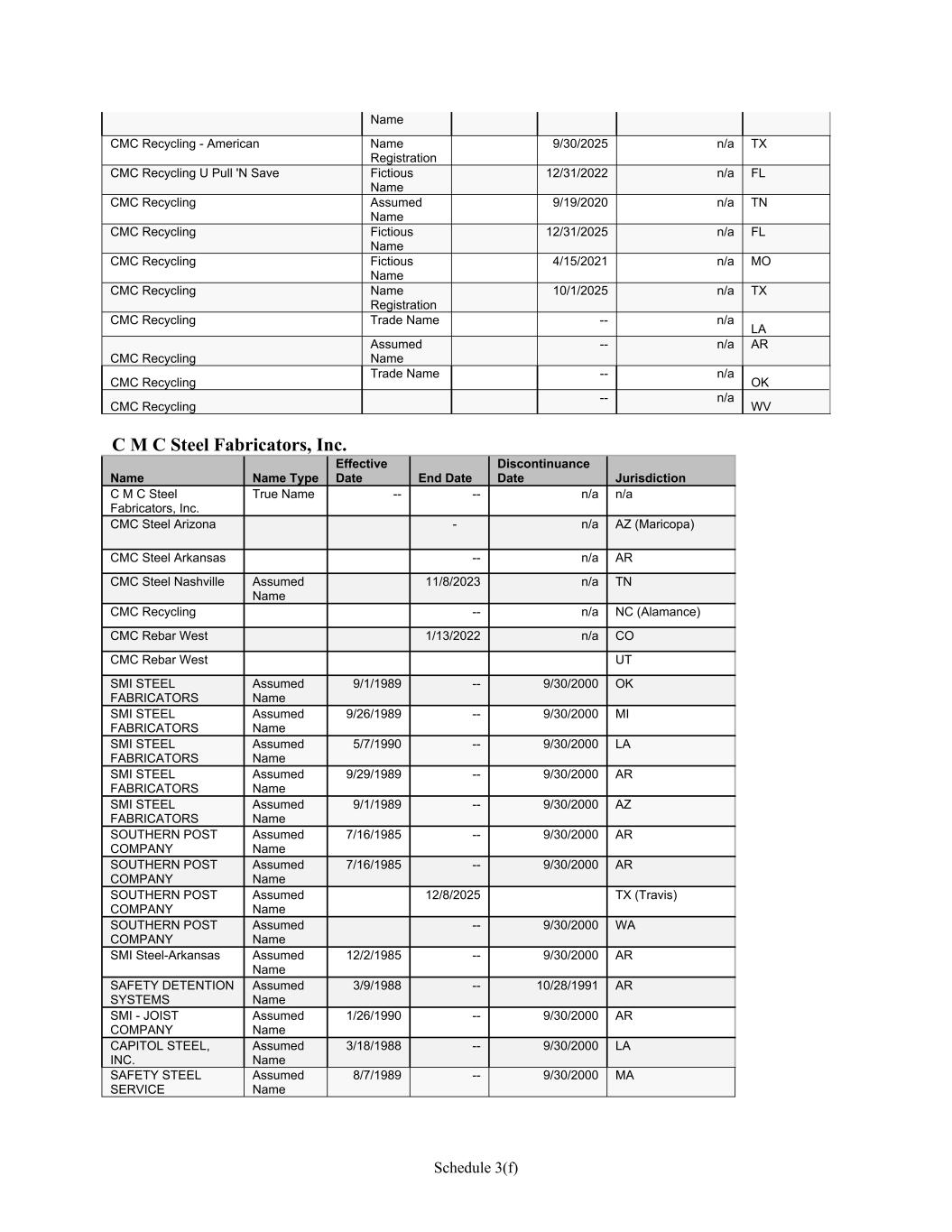 Schedule 3(f) Name CMC Recycling - American Name Registration 9/30/2025 n/a TX CMC Recycling U Pull 'N Save Fictious Name 12/31/2022 n/a FL CMC Recycling Assumed Name 9/19/2020 n/a TN CMC Recycling Fictious Name 12/31/2025 n/a FL CMC Recycling Fictious Name 4/15/2021 n/a MO CMC Recycling Name Registration 10/1/2025 n/a TX CMC Recycling Trade Name -- n/a LA CMC Recycling Assumed Name -- n/a AR CMC Recycling Trade Name -- n/a OK CMC Recycling -- n/a WV   C M C Steel Fabricators, Inc. Name Name Type Effective Date End Date Discontinuance Date Jurisdiction C M C Steel Fabricators, Inc. True Name -- -- n/a n/a CMC Steel Arizona - n/a AZ (Maricopa) CMC Steel Arkansas -- n/a AR CMC Steel Nashville Assumed Name 11/8/2023 n/a TN CMC Recycling -- n/a NC (Alamance) CMC Rebar West 1/13/2022 n/a CO CMC Rebar West UT SMI STEEL FABRICATORS Assumed Name 9/1/1989 -- 9/30/2000 OK SMI STEEL FABRICATORS Assumed Name 9/26/1989 -- 9/30/2000 MI SMI STEEL FABRICATORS Assumed Name 5/7/1990 -- 9/30/2000 LA SMI STEEL FABRICATORS Assumed Name 9/29/1989 -- 9/30/2000 AR SMI STEEL FABRICATORS Assumed Name 9/1/1989 -- 9/30/2000 AZ SOUTHERN POST COMPANY Assumed Name 7/16/1985 -- 9/30/2000 AR SOUTHERN POST COMPANY Assumed Name 7/16/1985 -- 9/30/2000 AR SOUTHERN POST COMPANY Assumed Name 12/8/2025 TX (Travis) SOUTHERN POST COMPANY Assumed Name -- 9/30/2000 WA SMI Steel-Arkansas Assumed Name 12/2/1985 -- 9/30/2000 AR SAFETY DETENTION SYSTEMS Assumed Name 3/9/1988 -- 10/28/1991 AR SMI - JOIST COMPANY Assumed Name 1/26/1990 -- 9/30/2000 AR CAPITOL STEEL, INC. Assumed Name 3/18/1988 -- 9/30/2000 LA SAFETY STEEL SERVICE Assumed Name 8/7/1989 -- 9/30/2000 MA