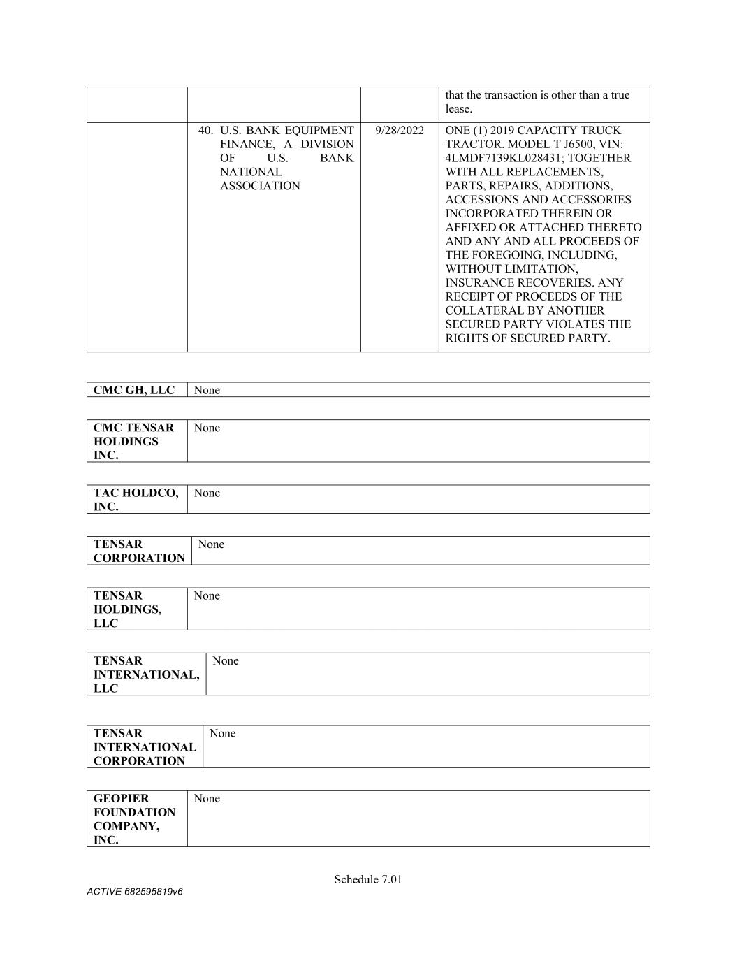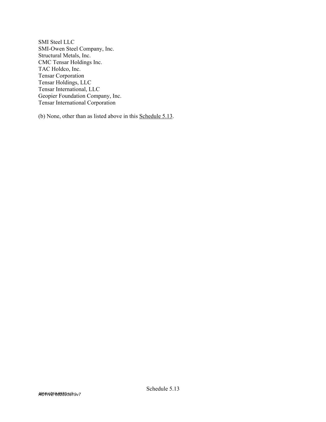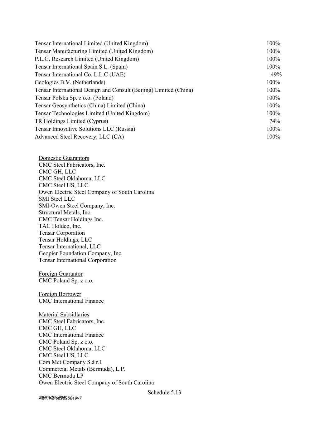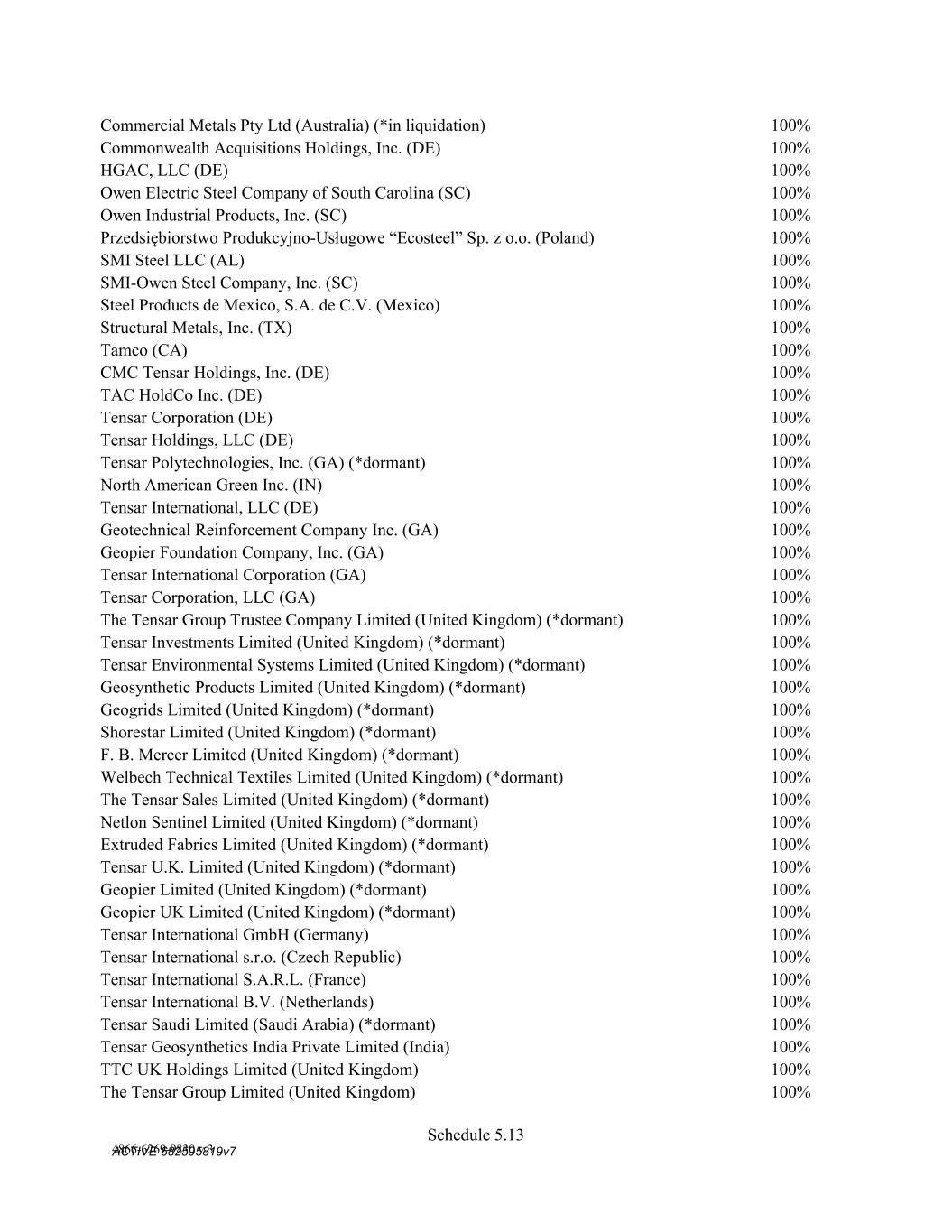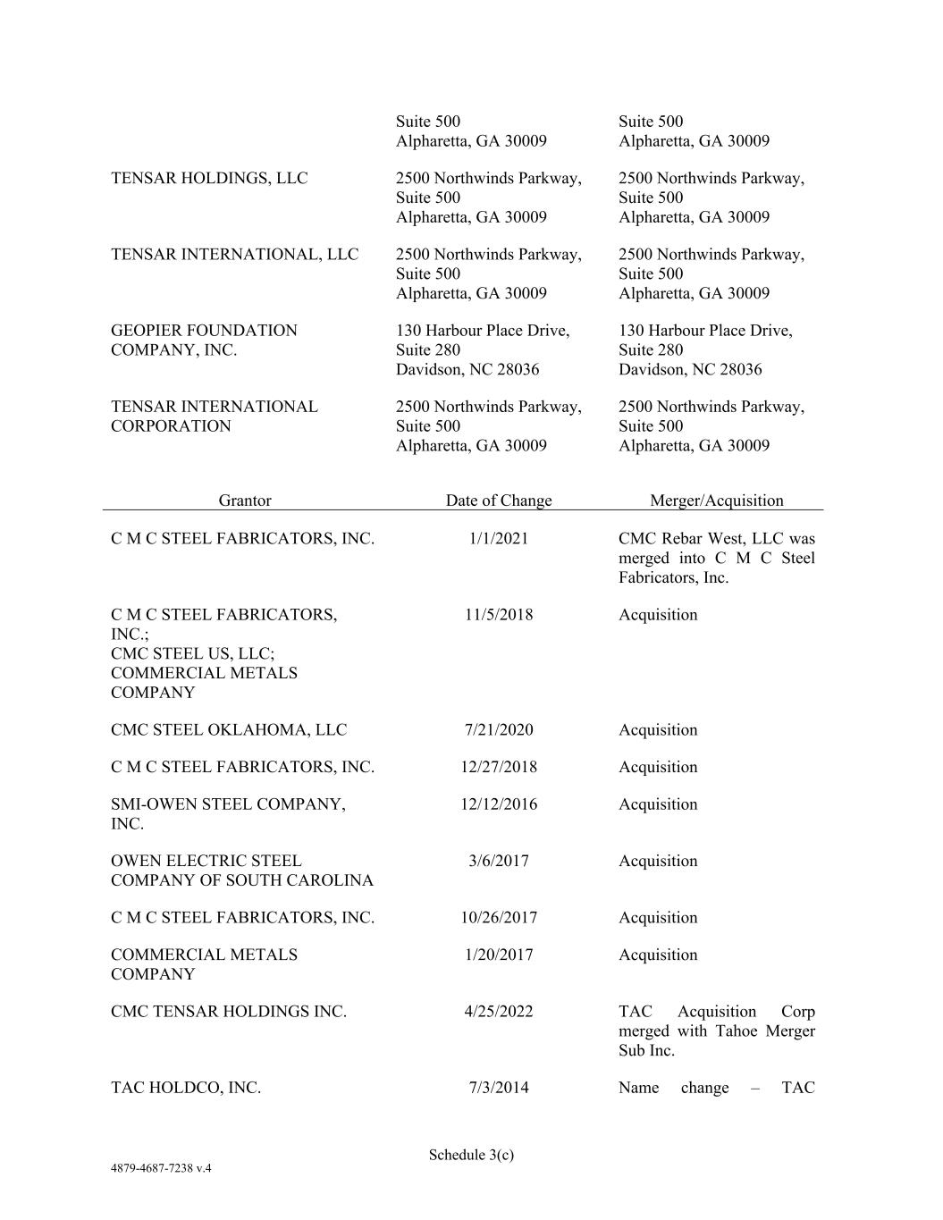 4879-4687-7238 v.4 Schedule 3(c) Suite 500 Alpharetta, GA 30009 Suite 500 Alpharetta, GA 30009 TENSAR HOLDINGS, LLC 2500 Northwinds Parkway, Suite 500 Alpharetta, GA 30009 2500 Northwinds Parkway, Suite 500 Alpharetta, GA 30009 TENSAR INTERNATIONAL, LLC 2500 Northwinds Parkway, Suite 500 Alpharetta, GA 30009 2500 Northwinds Parkway, Suite 500 Alpharetta, GA 30009 GEOPIER FOUNDATION COMPANY, INC. 130 Harbour Place Drive, Suite 280 Davidson, NC 28036 130 Harbour Place Drive, Suite 280 Davidson, NC 28036 TENSAR INTERNATIONAL CORPORATION 2500 Northwinds Parkway, Suite 500 Alpharetta, GA 30009 2500 Northwinds Parkway, Suite 500 Alpharetta, GA 30009 Grantor Date of Change Merger/Acquisition C M C STEEL FABRICATORS, INC. 1/1/2021 CMC Rebar West, LLC was merged into C M C Steel Fabricators, Inc. C M C STEEL FABRICATORS, INC.; CMC STEEL US, LLC; COMMERCIAL METALS COMPANY 11/5/2018 Acquisition CMC STEEL OKLAHOMA, LLC 7/21/2020 Acquisition C M C STEEL FABRICATORS, INC. 12/27/2018 Acquisition SMI-OWEN STEEL COMPANY, INC. 12/12/2016 Acquisition OWEN ELECTRIC STEEL COMPANY OF SOUTH CAROLINA 3/6/2017 Acquisition C M C STEEL FABRICATORS, INC. 10/26/2017 Acquisition COMMERCIAL METALS COMPANY 1/20/2017 Acquisition CMC TENSAR HOLDINGS INC. 4/25/2022 TAC Acquisition Corp merged with Tahoe Merger Sub Inc. TAC HOLDCO, INC. 7/3/2014 Name change – TAC
