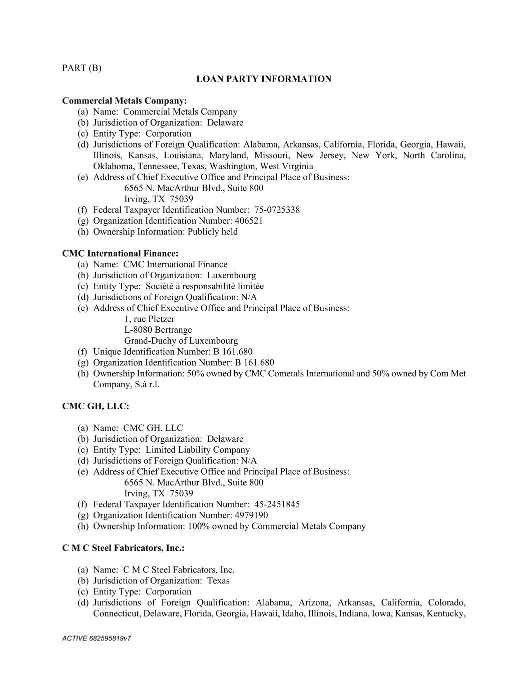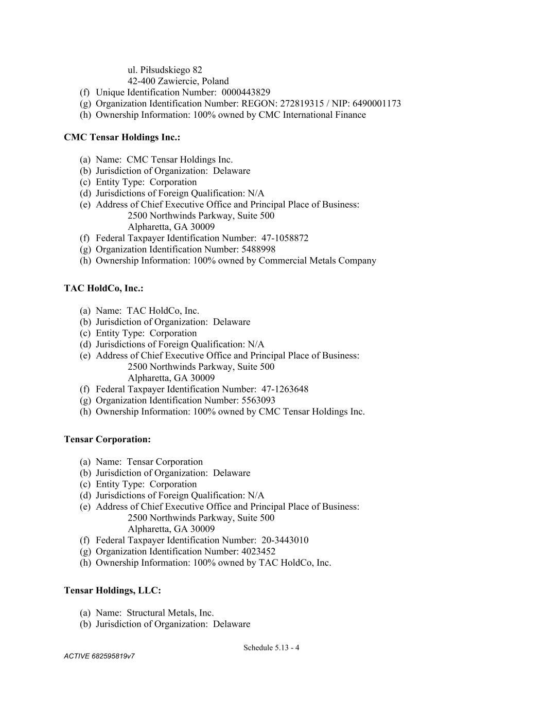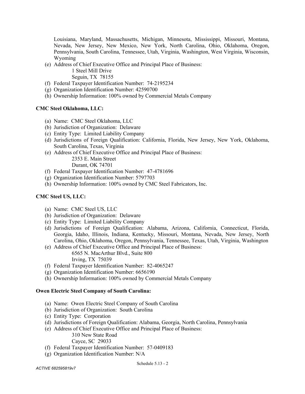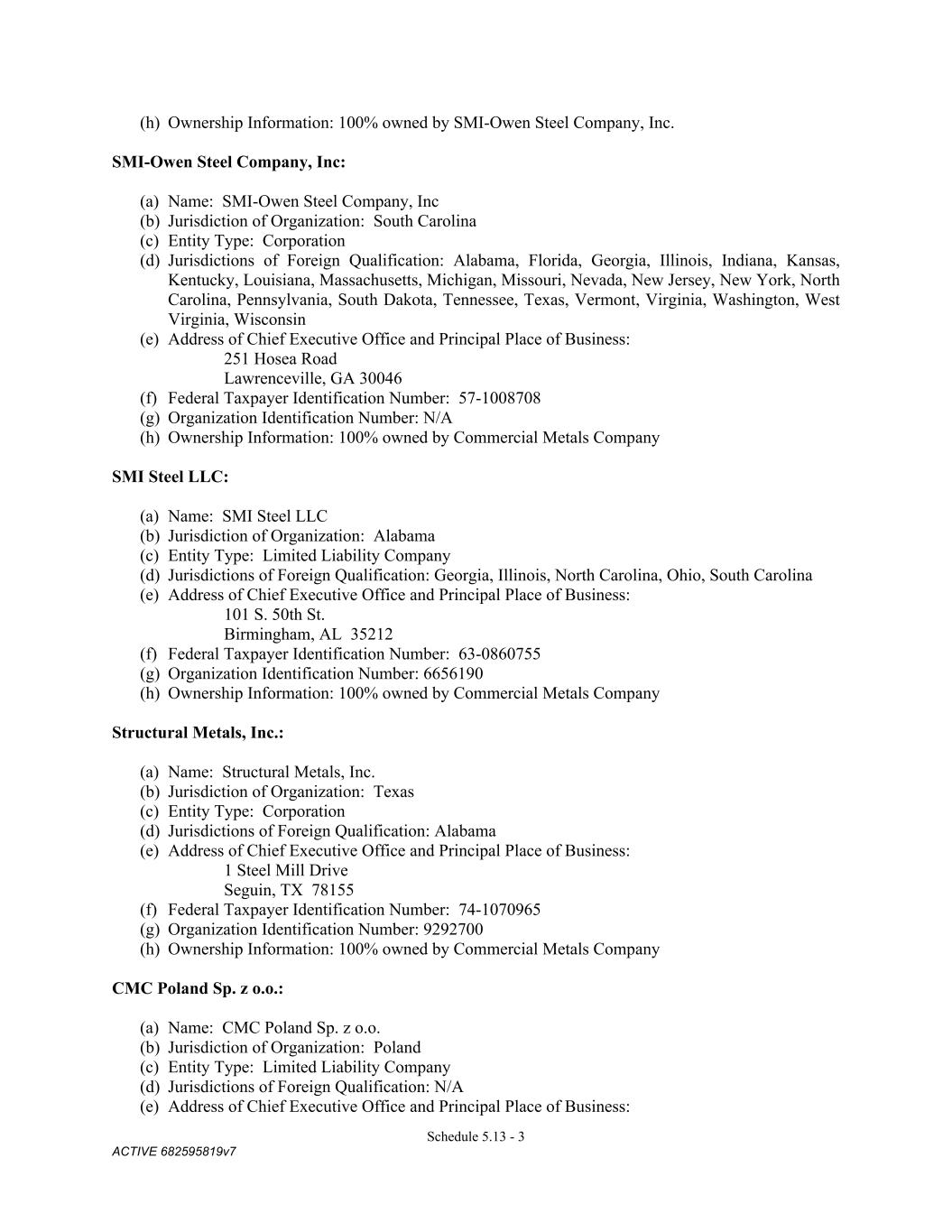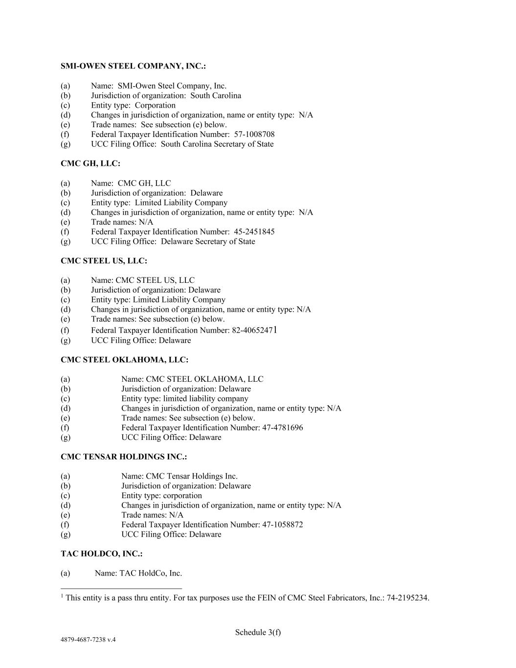 4879-4687-7238 v.4 Schedule 3(f) SMI-OWEN STEEL COMPANY, INC.: (a) Name: SMI-Owen Steel Company, Inc. (b) Jurisdiction of organization: South Carolina (c) Entity type: Corporation (d) Changes in jurisdiction of organization, name or entity type: N/A (e) Trade names: See subsection (e) below. (f) Federal Taxpayer Identification Number: 57-1008708 (g) UCC Filing Office: South Carolina Secretary of State CMC GH, LLC: (a) Name: CMC GH, LLC (b) Jurisdiction of organization: Delaware (c) Entity type: Limited Liability Company (d) Changes in jurisdiction of organization, name or entity type: N/A (e) Trade names: N/A (f) Federal Taxpayer Identification Number: 45-2451845 (g) UCC Filing Office: Delaware Secretary of State CMC STEEL US, LLC: (a) Name: CMC STEEL US, LLC (b) Jurisdiction of organization: Delaware (c) Entity type: Limited Liability Company (d) Changes in jurisdiction of organization, name or entity type: N/A (e) Trade names: See subsection (e) below. (f) Federal Taxpayer Identification Number: 82-40652471 (g) UCC Filing Office: Delaware CMC STEEL OKLAHOMA, LLC: (a) Name: CMC STEEL OKLAHOMA, LLC (b) Jurisdiction of organization: Delaware (c) Entity type: limited liability company (d) Changes in jurisdiction of organization, name or entity type: N/A (e) Trade names: See subsection (e) below. (f) Federal Taxpayer Identification Number: 47-4781696 (g) UCC Filing Office: Delaware CMC TENSAR HOLDINGS INC.: (a) Name: CMC Tensar Holdings Inc. (b) Jurisdiction of organization: Delaware (c) Entity type: corporation (d) Changes in jurisdiction of organization, name or entity type: N/A (e) Trade names: N/A (f) Federal Taxpayer Identification Number: 47-1058872 (g) UCC Filing Office: Delaware TAC HOLDCO, INC.: (a) Name: TAC HoldCo, Inc. 1 This entity is a pass thru entity. For tax purposes use the FEIN of CMC Steel Fabricators, Inc.: 74-2195234.