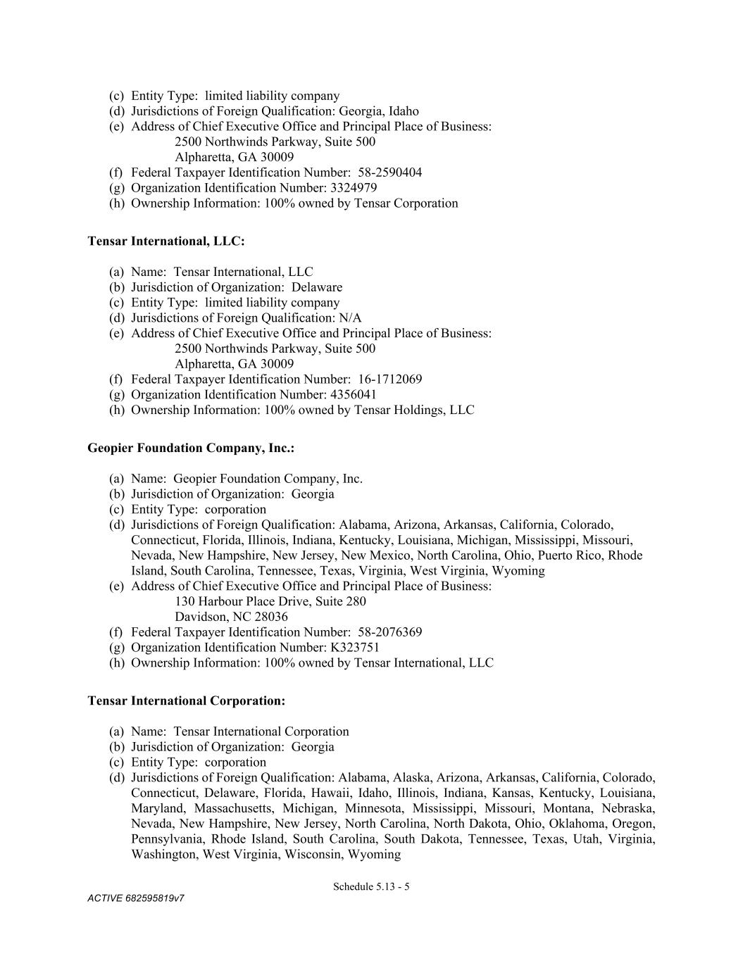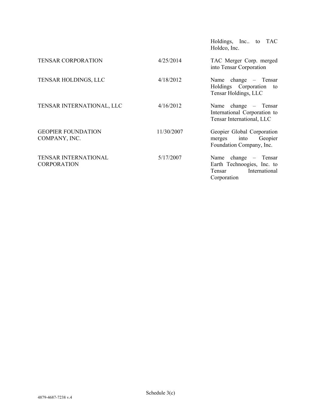 4879-4687-7238 v.4 Schedule 3(c) Holdings, Inc.. to TAC Holdco, Inc. TENSAR CORPORATION 4/25/2014 TAC Merger Corp. merged into Tensar Corporation TENSAR HOLDINGS, LLC 4/18/2012 Name change – Tensar Holdings Corporation to Tensar Holdings, LLC TENSAR INTERNATIONAL, LLC 4/16/2012 Name change – Tensar International Corporation to Tensar International, LLC GEOPIER FOUNDATION COMPANY, INC. 11/30/2007 Geopier Global Corporation merges into Geopier Foundation Company, Inc. TENSAR INTERNATIONAL CORPORATION 5/17/2007 Name change – Tensar Earth Technoogies, Inc. to Tensar International Corporation