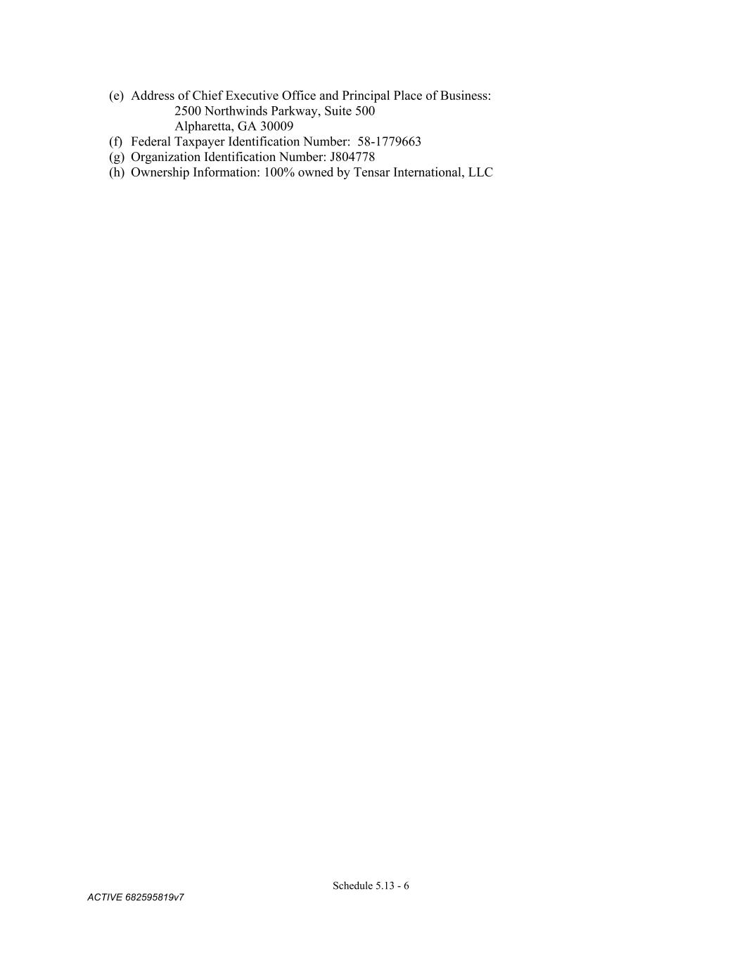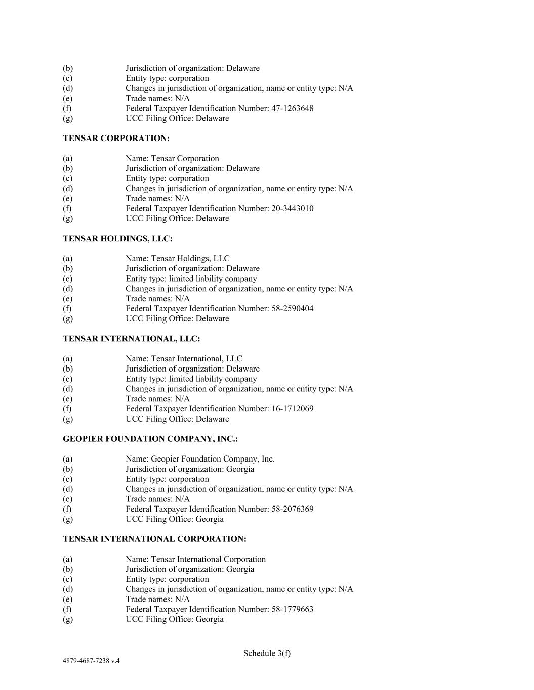 4879-4687-7238 v.4 Schedule 3(f) (b) Jurisdiction of organization: Delaware (c) Entity type: corporation (d) Changes in jurisdiction of organization, name or entity type: N/A (e) Trade names: N/A (f) Federal Taxpayer Identification Number: 47-1263648 (g) UCC Filing Office: Delaware TENSAR CORPORATION: (a) Name: Tensar Corporation (b) Jurisdiction of organization: Delaware (c) Entity type: corporation (d) Changes in jurisdiction of organization, name or entity type: N/A (e) Trade names: N/A (f) Federal Taxpayer Identification Number: 20-3443010 (g) UCC Filing Office: Delaware TENSAR HOLDINGS, LLC: (a) Name: Tensar Holdings, LLC (b) Jurisdiction of organization: Delaware (c) Entity type: limited liability company (d) Changes in jurisdiction of organization, name or entity type: N/A (e) Trade names: N/A (f) Federal Taxpayer Identification Number: 58-2590404 (g) UCC Filing Office: Delaware TENSAR INTERNATIONAL, LLC: (a) Name: Tensar International, LLC (b) Jurisdiction of organization: Delaware (c) Entity type: limited liability company (d) Changes in jurisdiction of organization, name or entity type: N/A (e) Trade names: N/A (f) Federal Taxpayer Identification Number: 16-1712069 (g) UCC Filing Office: Delaware GEOPIER FOUNDATION COMPANY, INC.: (a) Name: Geopier Foundation Company, Inc. (b) Jurisdiction of organization: Georgia (c) Entity type: corporation (d) Changes in jurisdiction of organization, name or entity type: N/A (e) Trade names: N/A (f) Federal Taxpayer Identification Number: 58-2076369 (g) UCC Filing Office: Georgia TENSAR INTERNATIONAL CORPORATION: (a) Name: Tensar International Corporation (b) Jurisdiction of organization: Georgia (c) Entity type: corporation (d) Changes in jurisdiction of organization, name or entity type: N/A (e) Trade names: N/A (f) Federal Taxpayer Identification Number: 58-1779663 (g) UCC Filing Office: Georgia