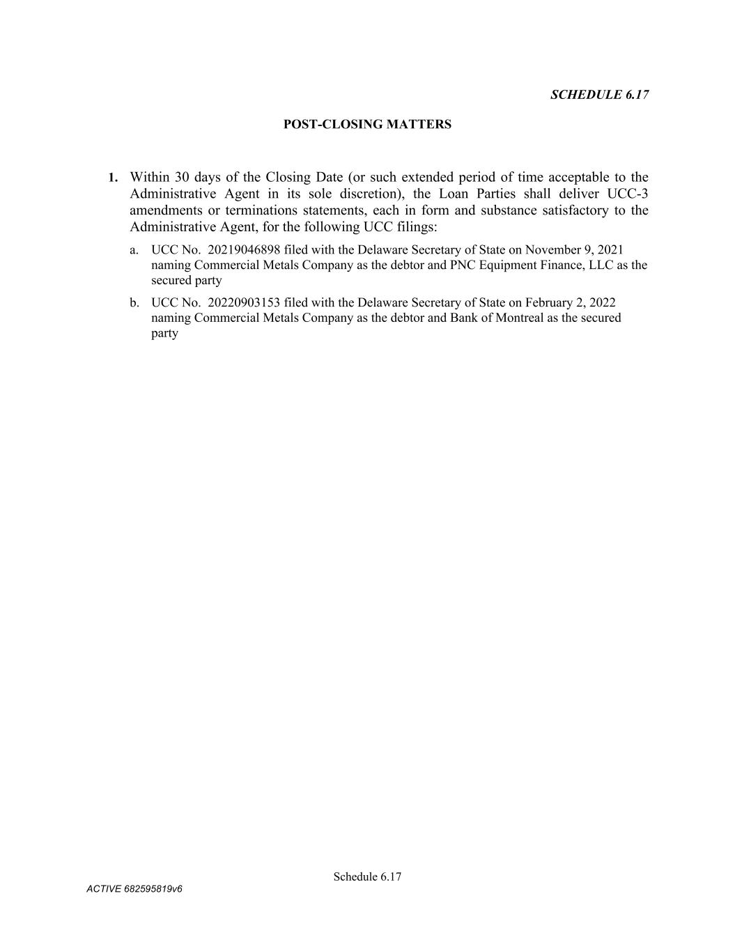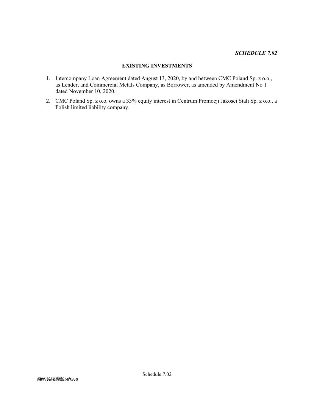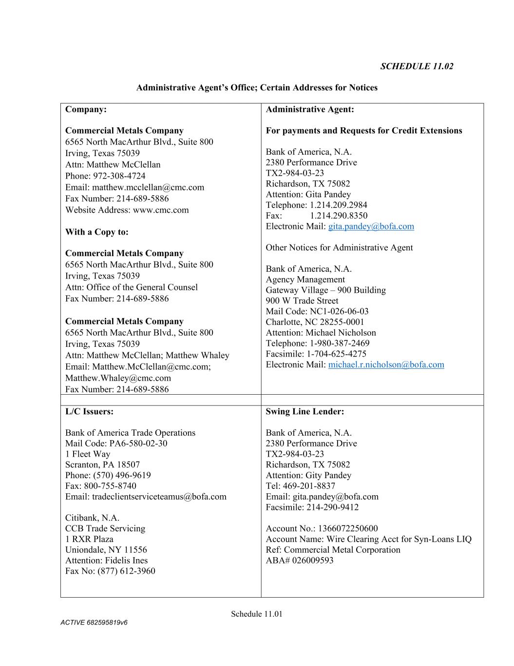 Schedule 11.01 ACTIVE 682595819v6 SCHEDULE 11.02 Administrative Agent’s Office; Certain Addresses for Notices Company: Commercial Metals Company 6565 North MacArthur Blvd., Suite 800 Irving, Texas 75039 Attn: Matthew McClellan Phone: 972-308-4724 Email: matthew.mcclellan@cmc.com Fax Number: 214-689-5886 Website Address: www.cmc.com With a Copy to: Commercial Metals Company 6565 North MacArthur Blvd., Suite 800 Irving, Texas 75039 Attn: Office of the General Counsel Fax Number: 214-689-5886 Commercial Metals Company 6565 North MacArthur Blvd., Suite 800 Irving, Texas 75039 Attn: Matthew McClellan; Matthew Whaley Email: Matthew.McClellan@cmc.com; Matthew.Whaley@cmc.com Fax Number: 214-689-5886 Administrative Agent: For payments and Requests for Credit Extensions Bank of America, N.A. 2380 Performance Drive TX2-984-03-23 Richardson, TX 75082 Attention: Gita Pandey Telephone: 1.214.209.2984 Fax: 1.214.290.8350 Electronic Mail: gita.pandey@bofa.com Other Notices for Administrative Agent Bank of America, N.A. Agency Management Gateway Village – 900 Building 900 W Trade Street Mail Code: NC1-026-06-03 Charlotte, NC 28255-0001 Attention: Michael Nicholson Telephone: 1-980-387-2469 Facsimile: 1-704-625-4275 Electronic Mail: michael.r.nicholson@bofa.com L/C Issuers: Bank of America Trade Operations Mail Code: PA6-580-02-30 1 Fleet Way Scranton, PA 18507 Phone: (570) 496-9619 Fax: 800-755-8740 Email: tradeclientserviceteamus@bofa.com Citibank, N.A. CCB Trade Servicing 1 RXR Plaza Uniondale, NY 11556 Attention: Fidelis Ines Fax No: (877) 612-3960 Swing Line Lender: Bank of America, N.A. 2380 Performance Drive TX2-984-03-23 Richardson, TX 75082 Attention: Gity Pandey Tel: 469-201-8837 Email: gita.pandey@bofa.com Facsimile: 214-290-9412 Account No.: 1366072250600 Account Name: Wire Clearing Acct for Syn-Loans LIQ Ref: Commercial Metal Corporation ABA# 026009593