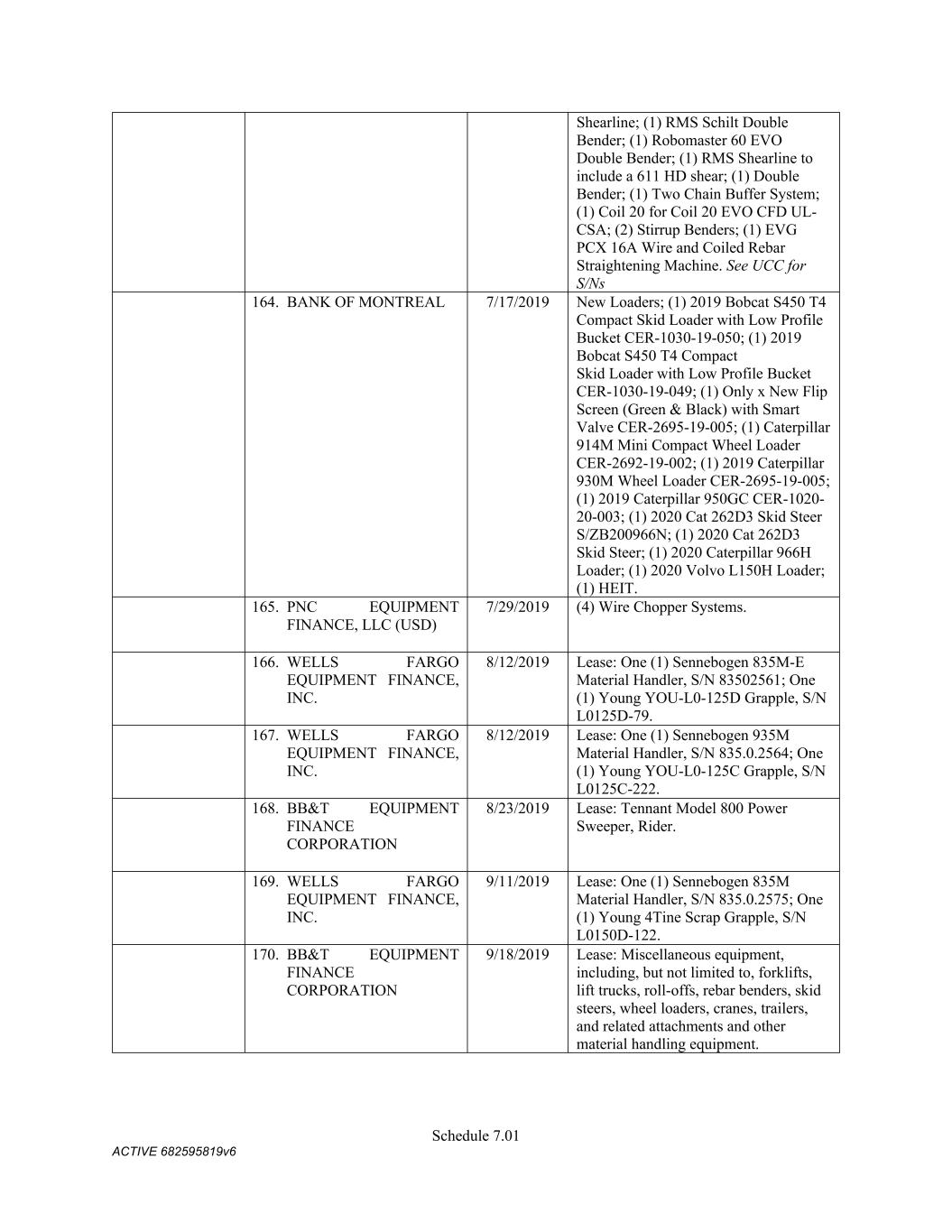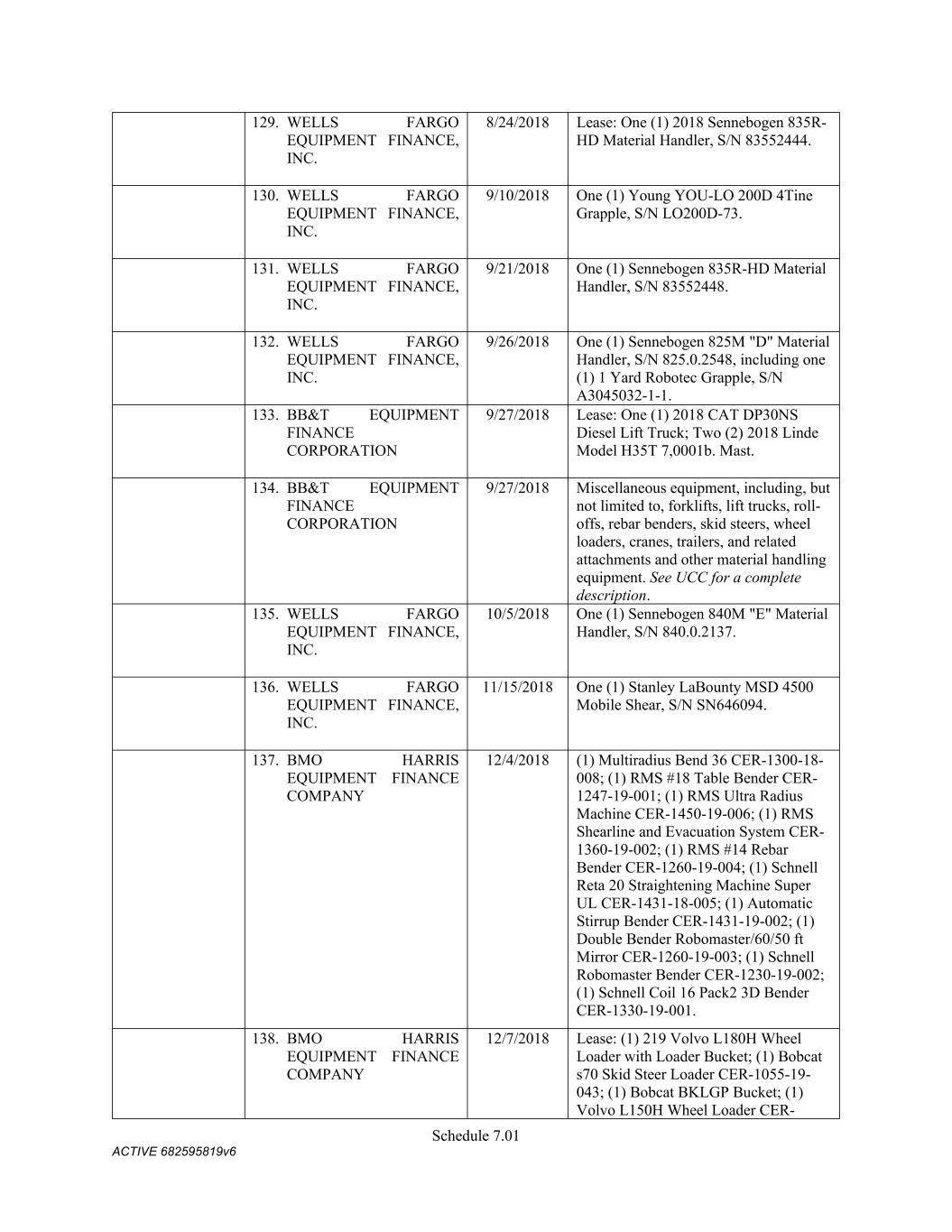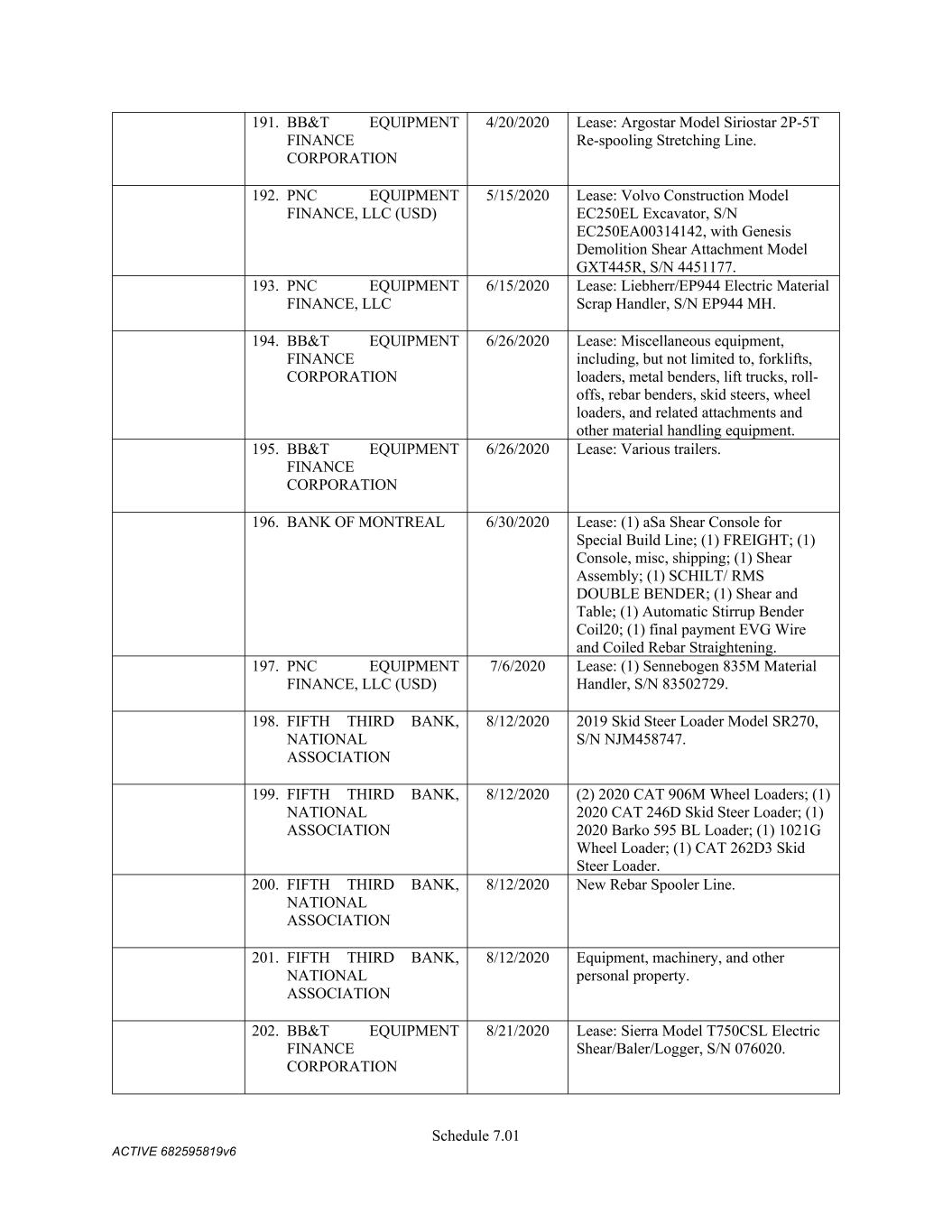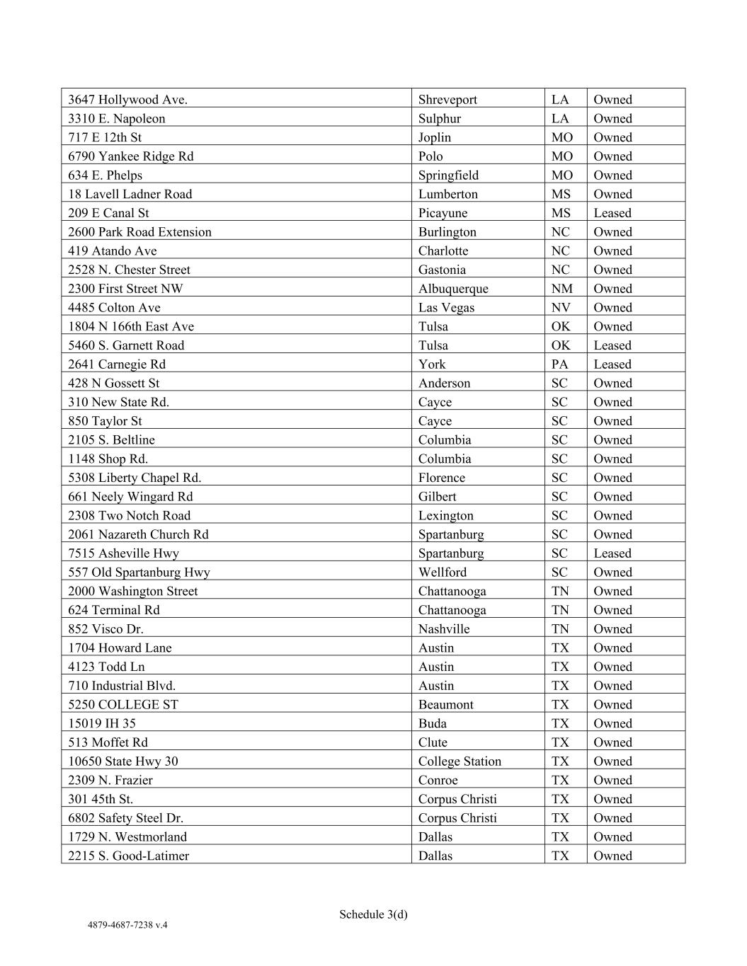 4879-4687-7238 v.4 Schedule 3(d) 3647 Hollywood Ave. Shreveport LA Owned 3310 E. Napoleon Sulphur LA Owned 717 E 12th St Joplin MO Owned 6790 Yankee Ridge Rd Polo MO Owned 634 E. Phelps Springfield MO Owned 18 Lavell Ladner Road Lumberton MS Owned 209 E Canal St Picayune MS Leased 2600 Park Road Extension Burlington NC Owned 419 Atando Ave Charlotte NC Owned 2528 N. Chester Street Gastonia NC Owned 2300 First Street NW Albuquerque NM Owned 4485 Colton Ave Las Vegas NV Owned 1804 N 166th East Ave Tulsa OK Owned 5460 S. Garnett Road Tulsa OK Leased 2641 Carnegie Rd York PA Leased 428 N Gossett St Anderson SC Owned 310 New State Rd. Cayce SC Owned 850 Taylor St Cayce SC Owned 2105 S. Beltline Columbia SC Owned 1148 Shop Rd. Columbia SC Owned 5308 Liberty Chapel Rd. Florence SC Owned 661 Neely Wingard Rd Gilbert SC Owned 2308 Two Notch Road Lexington SC Owned 2061 Nazareth Church Rd Spartanburg SC Owned 7515 Asheville Hwy Spartanburg SC Leased 557 Old Spartanburg Hwy Wellford SC Owned 2000 Washington Street Chattanooga TN Owned 624 Terminal Rd Chattanooga TN Owned 852 Visco Dr. Nashville TN Owned 1704 Howard Lane Austin TX Owned 4123 Todd Ln Austin TX Owned 710 Industrial Blvd. Austin TX Owned 5250 COLLEGE ST Beaumont TX Owned 15019 IH 35 Buda TX Owned 513 Moffet Rd Clute TX Owned 10650 State Hwy 30 College Station TX Owned 2309 N. Frazier Conroe TX Owned 301 45th St. Corpus Christi TX Owned 6802 Safety Steel Dr. Corpus Christi TX Owned 1729 N. Westmorland Dallas TX Owned 2215 S. Good-Latimer Dallas TX Owned