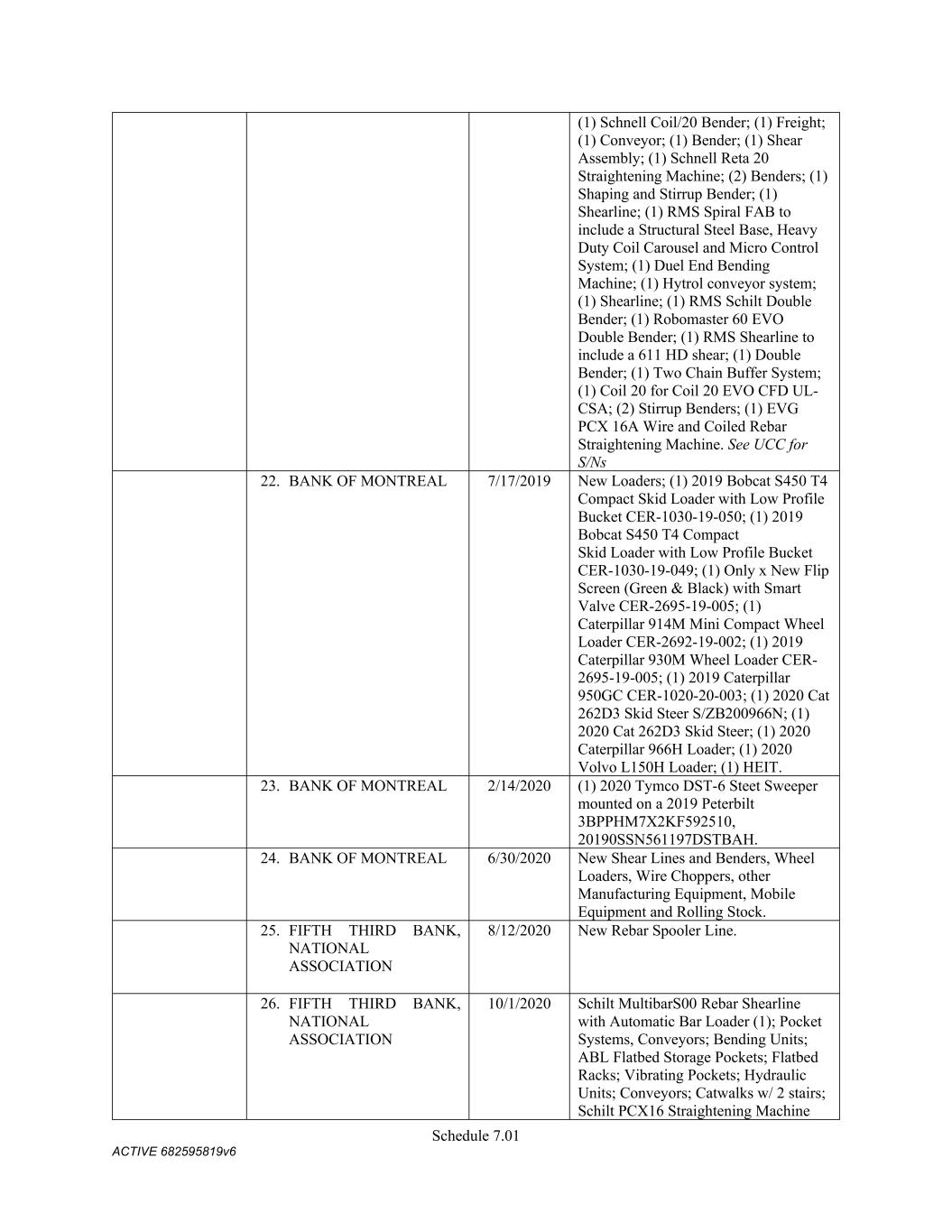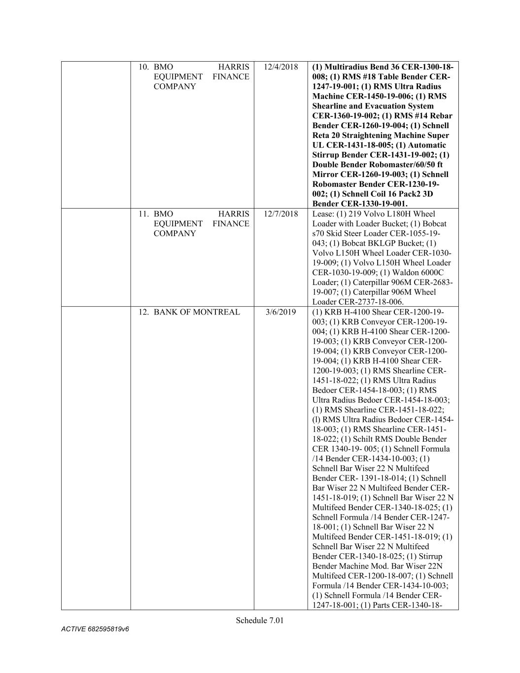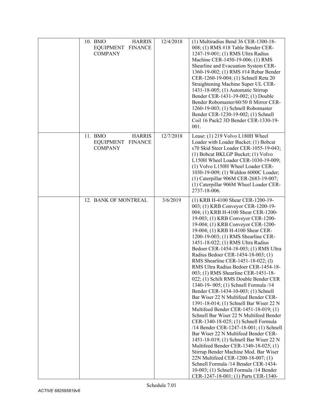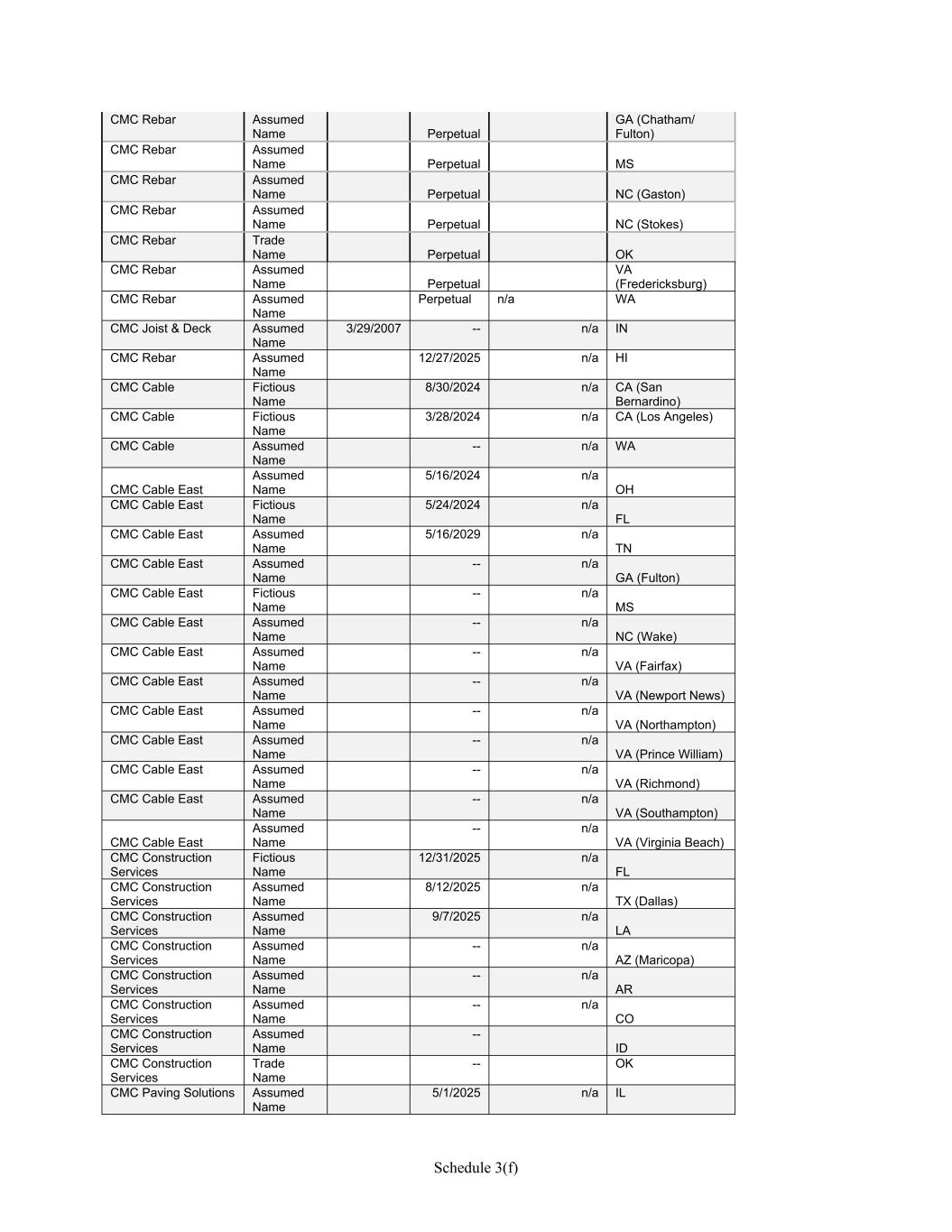 Schedule 3(f) CMC Rebar Assumed Name Perpetual GA (Chatham/ Fulton) CMC Rebar Assumed Name Perpetual MS CMC Rebar Assumed Name Perpetual NC (Gaston) CMC Rebar Assumed Name Perpetual NC (Stokes) CMC Rebar Trade Name Perpetual OK CMC Rebar Assumed Name Perpetual VA (Fredericksburg) CMC Rebar Assumed Name Perpetual n/a WA CMC Joist & Deck Assumed Name 3/29/2007 -- n/a IN CMC Rebar Assumed Name 12/27/2025 n/a HI CMC Cable Fictious Name 8/30/2024 n/a CA (San Bernardino) CMC Cable Fictious Name 3/28/2024 n/a CA (Los Angeles) CMC Cable Assumed Name -- n/a WA CMC Cable East Assumed Name 5/16/2024 n/a OH CMC Cable East Fictious Name 5/24/2024 n/a FL CMC Cable East Assumed Name 5/16/2029 n/a TN CMC Cable East Assumed Name -- n/a GA (Fulton) CMC Cable East Fictious Name -- n/a MS CMC Cable East Assumed Name -- n/a NC (Wake) CMC Cable East Assumed Name -- n/a VA (Fairfax) CMC Cable East Assumed Name -- n/a VA (Newport News) CMC Cable East Assumed Name -- n/a VA (Northampton) CMC Cable East Assumed Name -- n/a VA (Prince William) CMC Cable East Assumed Name -- n/a VA (Richmond) CMC Cable East Assumed Name -- n/a VA (Southampton) CMC Cable East Assumed Name -- n/a VA (Virginia Beach) CMC Construction Services Fictious Name 12/31/2025 n/a FL CMC Construction Services Assumed Name 8/12/2025 n/a TX (Dallas) CMC Construction Services Assumed Name 9/7/2025 n/a LA CMC Construction Services Assumed Name -- n/a AZ (Maricopa) CMC Construction Services Assumed Name -- n/a AR CMC Construction Services Assumed Name -- n/a CO CMC Construction Services Assumed Name -- ID CMC Construction Services Trade Name -- OK CMC Paving Solutions Assumed Name 5/1/2025 n/a IL