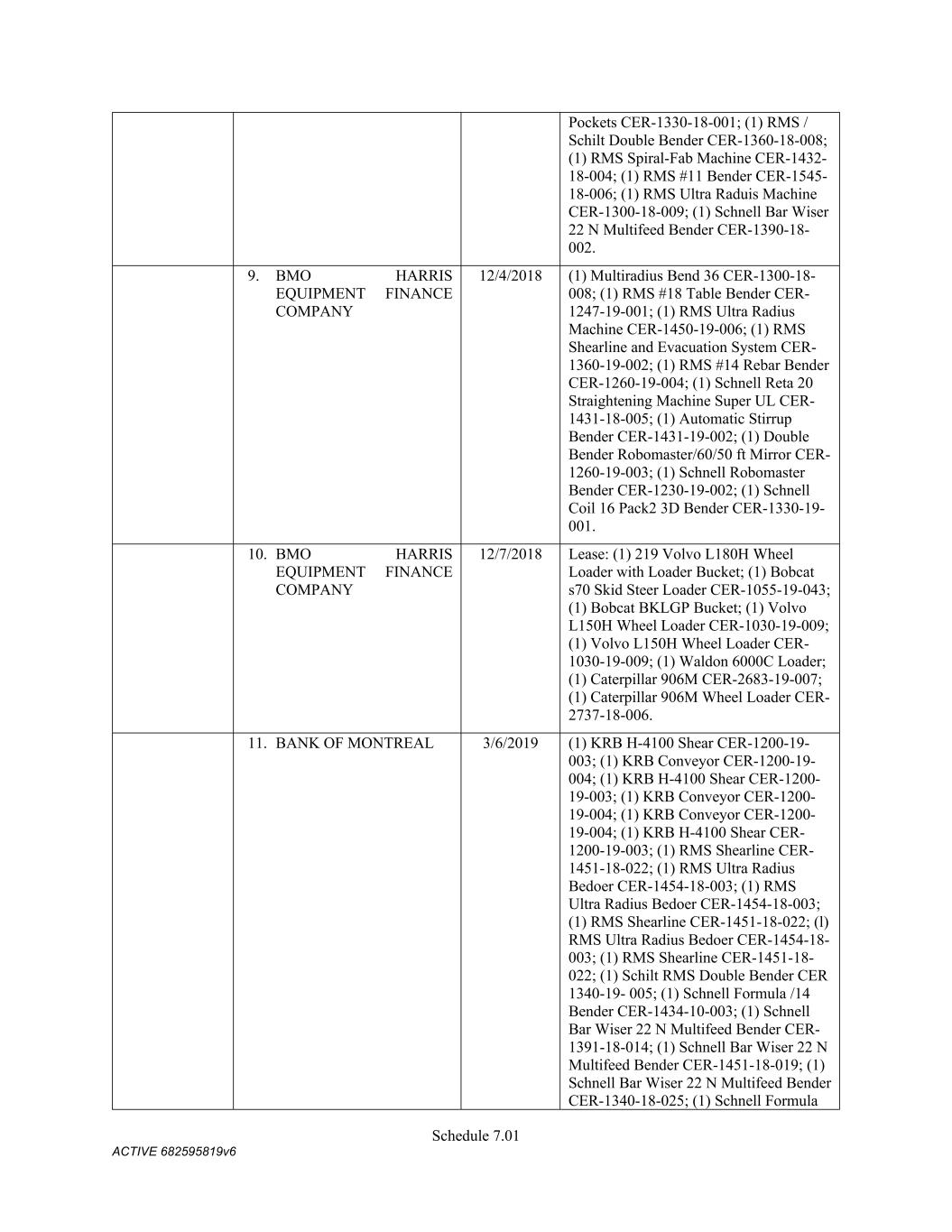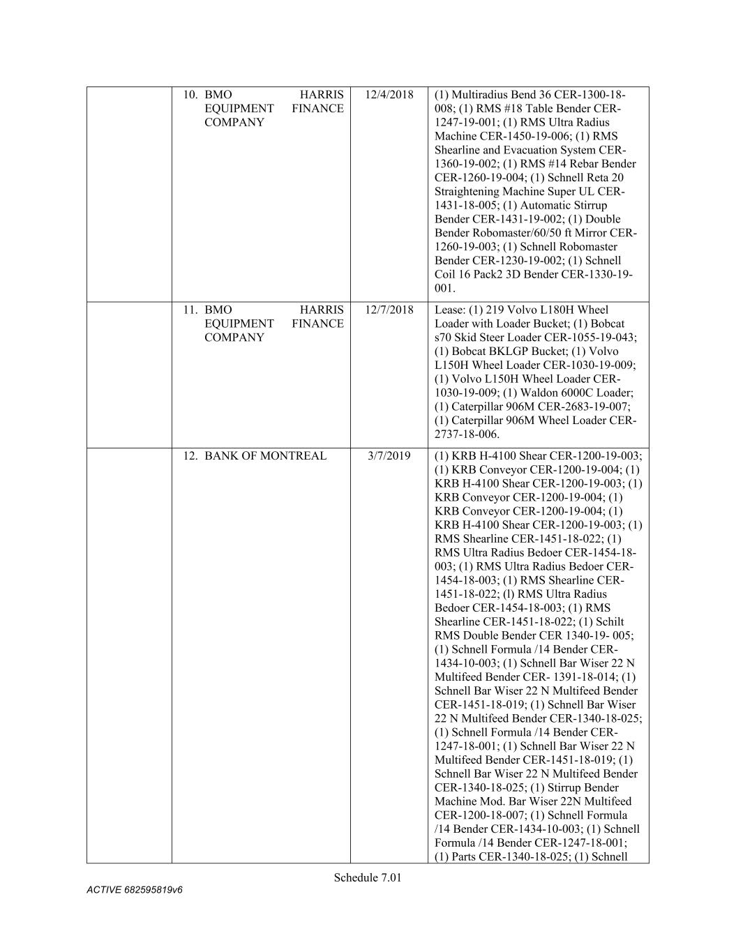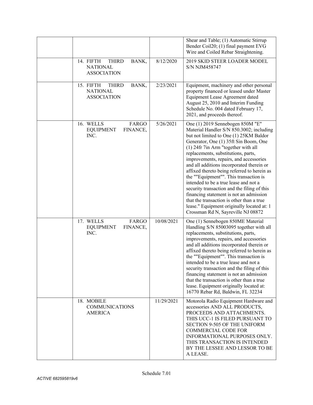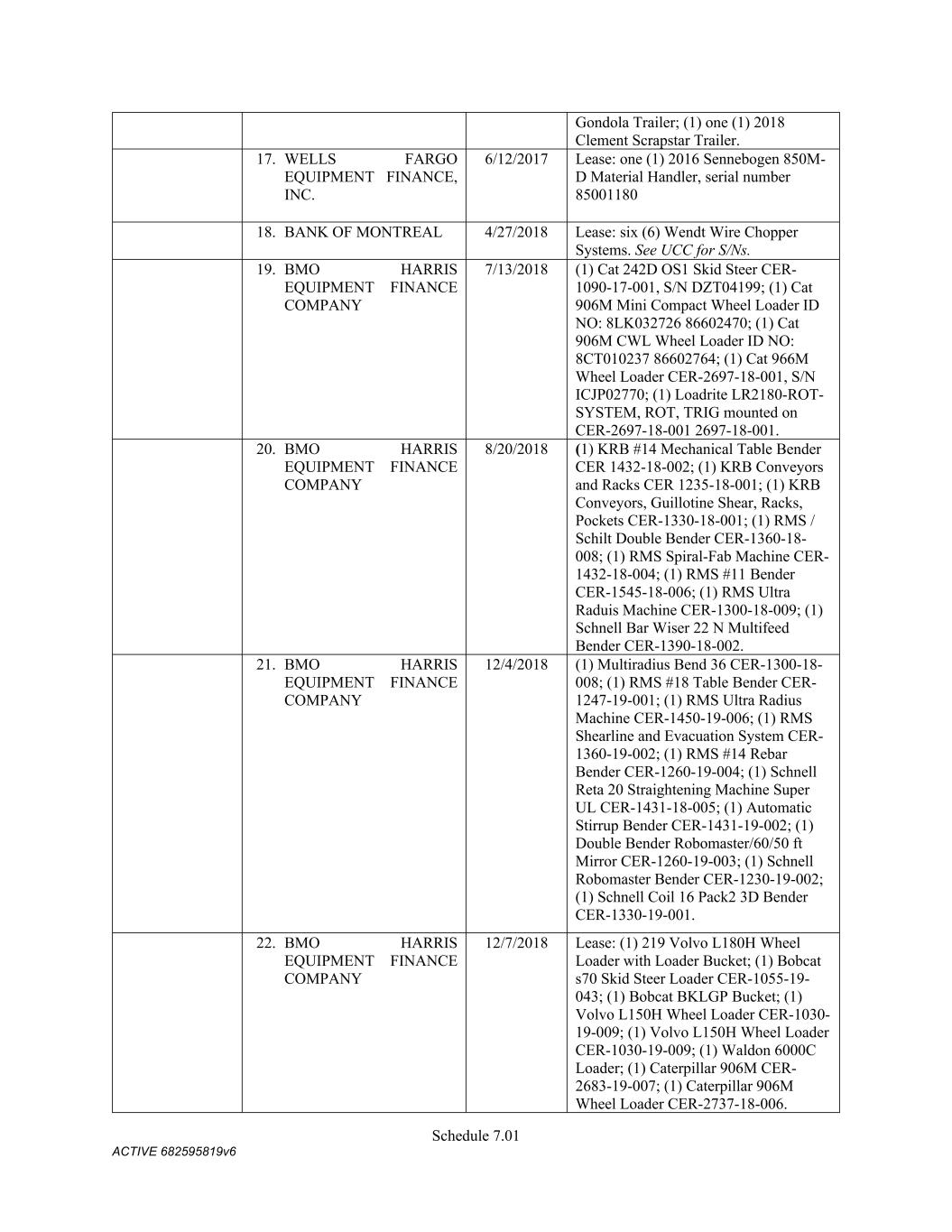 Schedule 3(f) CMC Rebar Assumed Name Perpetual GA (Chatham/ Fulton) CMC Rebar Assumed Name Perpetual MS CMC Rebar Assumed Name Perpetual NC (Gaston) CMC Rebar Assumed Name Perpetual NC (Stokes) CMC Rebar Trade Name Perpetual OK CMC Rebar Assumed Name Perpetual VA (Fredericksburg) CMC Rebar Assumed Name Perpetual n/a WA CMC Joist & Deck Assumed Name 3/29/2007 -- n/a IN CMC Rebar Assumed Name 12/27/2025 n/a HI CMC Cable Fictious Name 8/30/2024 n/a CA (San Bernardino) CMC Cable Fictious Name 3/28/2024 n/a CA (Los Angeles) CMC Cable Assumed Name -- n/a WA CMC Cable East Assumed Name 5/16/2024 n/a OH CMC Cable East Fictious Name 5/24/2024 n/a FL CMC Cable East Assumed Name 5/16/2029 n/a TN CMC Cable East Assumed Name -- n/a GA (Fulton) CMC Cable East Fictious Name -- n/a MS CMC Cable East Assumed Name -- n/a NC (Wake) CMC Cable East Assumed Name -- n/a VA (Fairfax) CMC Cable East Assumed Name -- n/a VA (Newport News) CMC Cable East Assumed Name -- n/a VA (Northampton) CMC Cable East Assumed Name -- n/a VA (Prince William) CMC Cable East Assumed Name -- n/a VA (Richmond) CMC Cable East Assumed Name -- n/a VA (Southampton) CMC Cable East Assumed Name -- n/a VA (Virginia Beach) CMC Construction Services Fictious Name 12/31/2025 n/a FL CMC Construction Services Assumed Name 8/12/2025 n/a TX (Dallas) CMC Construction Services Assumed Name 9/7/2025 n/a LA CMC Construction Services Assumed Name -- n/a AZ (Maricopa) CMC Construction Services Assumed Name -- n/a AR CMC Construction Services Assumed Name -- n/a CO CMC Construction Services Assumed Name -- ID CMC Construction Services Trade Name -- OK CMC Paving Solutions Assumed Name 5/1/2025 n/a IL