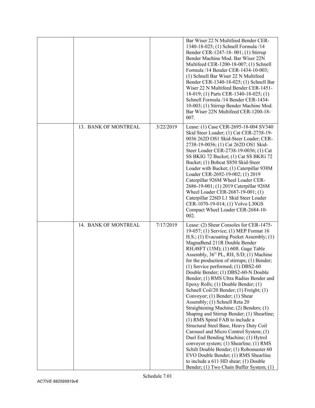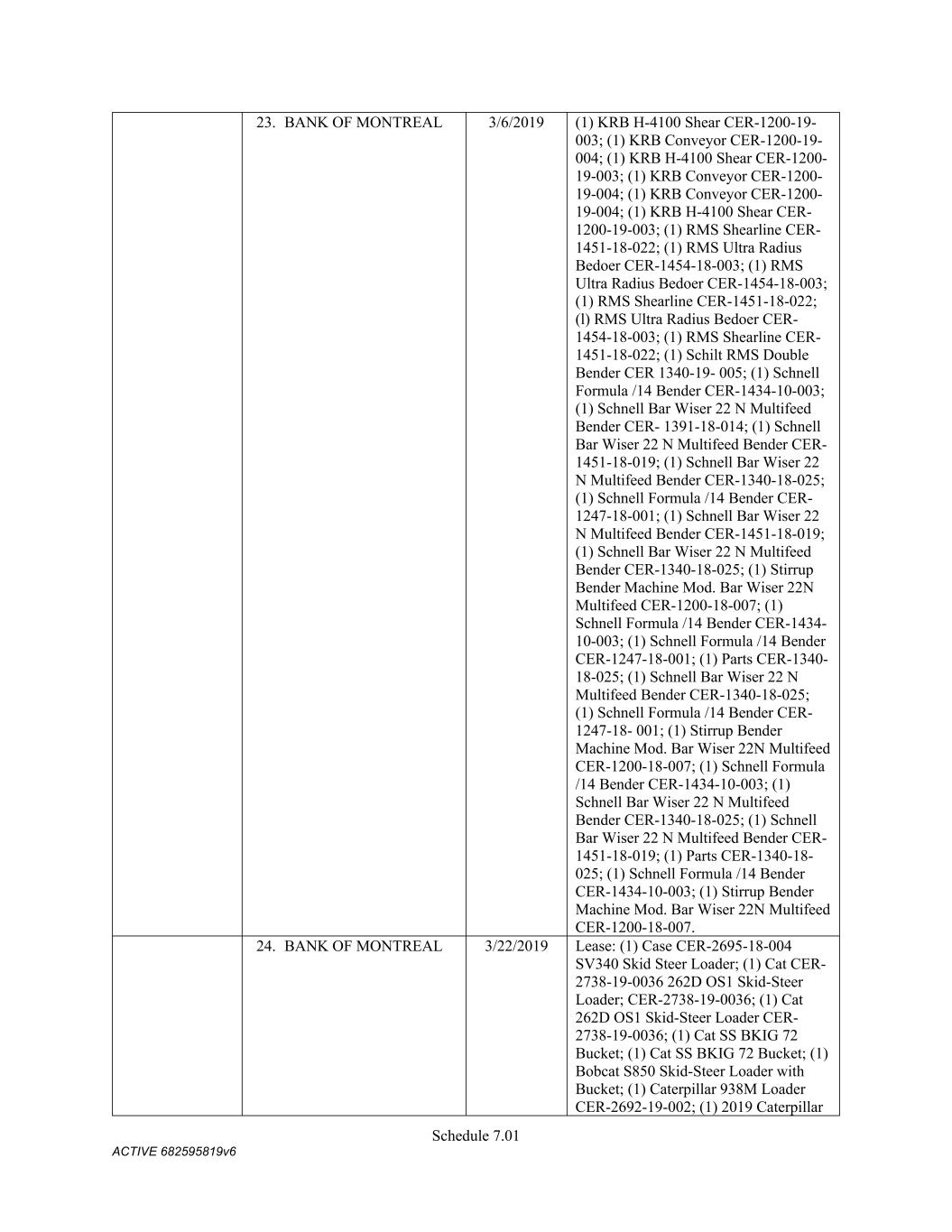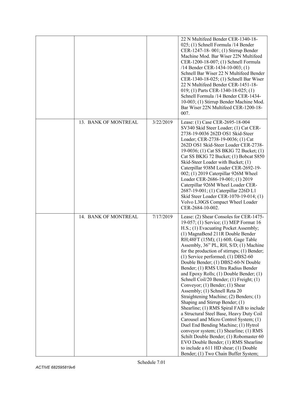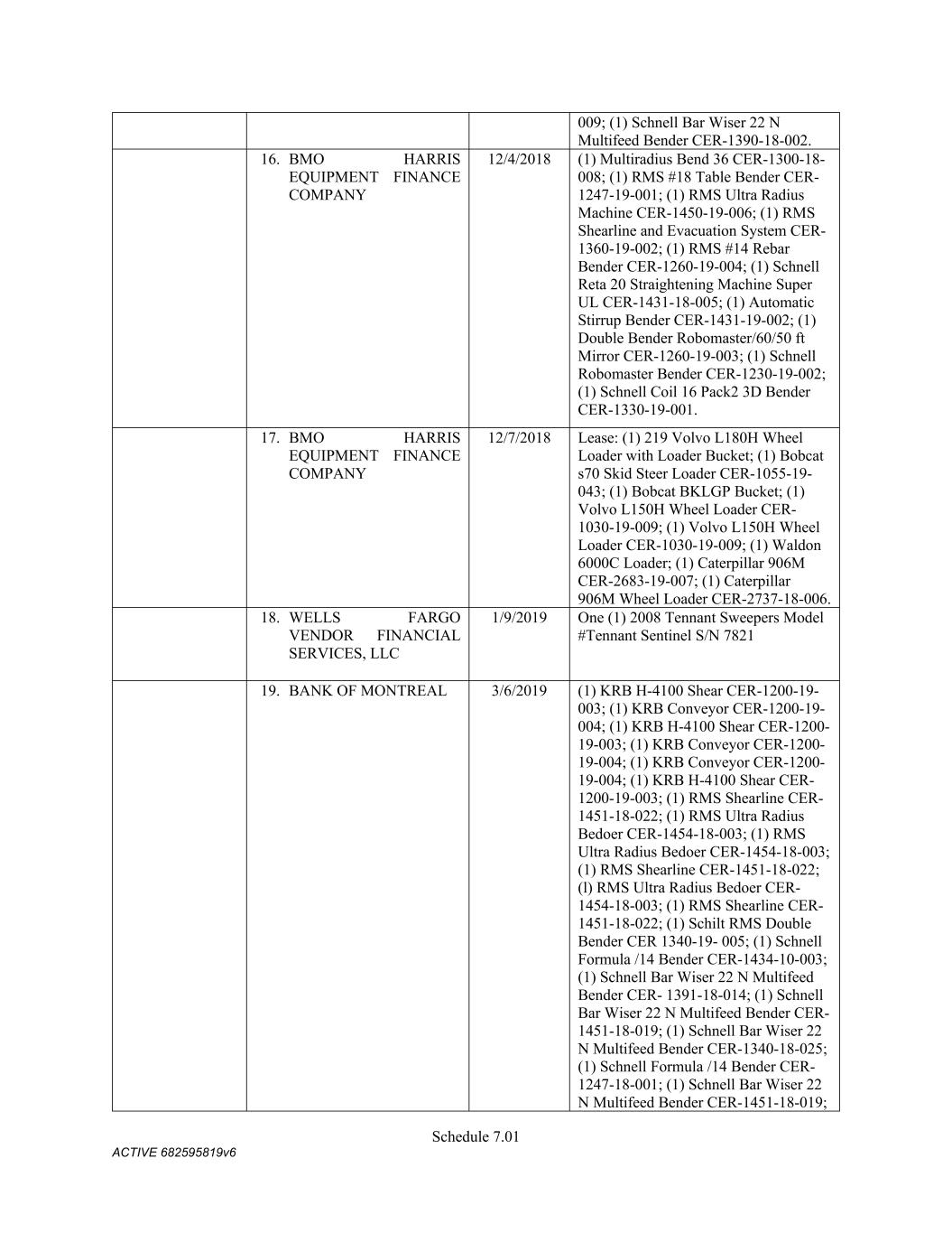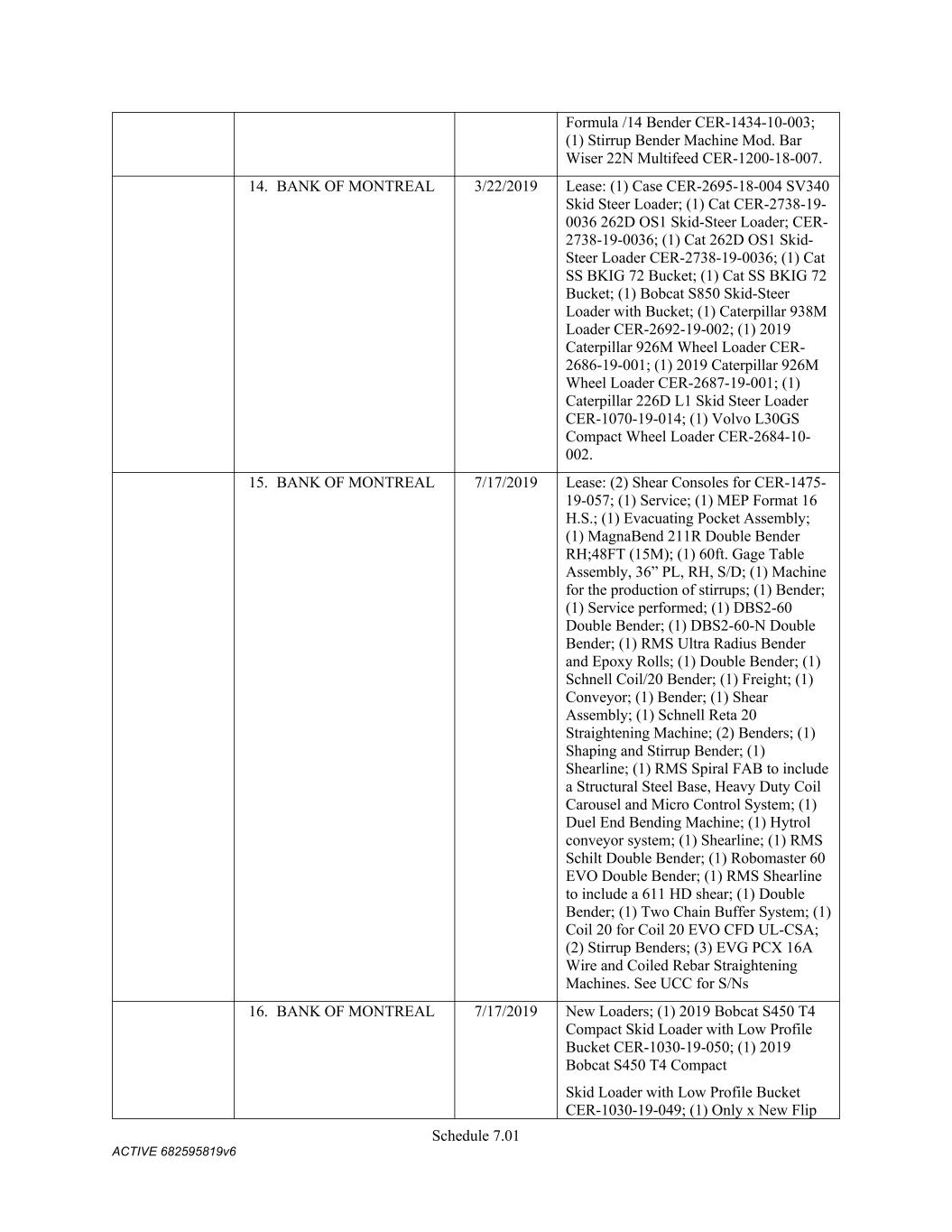 Schedule 3(f) CMC Rebar Assumed Name Perpetual GA (Chatham/ Fulton) CMC Rebar Assumed Name Perpetual MS CMC Rebar Assumed Name Perpetual NC (Gaston) CMC Rebar Assumed Name Perpetual NC (Stokes) CMC Rebar Trade Name Perpetual OK CMC Rebar Assumed Name Perpetual VA (Fredericksburg) CMC Rebar Assumed Name Perpetual n/a WA CMC Joist & Deck Assumed Name 3/29/2007 -- n/a IN CMC Rebar Assumed Name 12/27/2025 n/a HI CMC Cable Fictious Name 8/30/2024 n/a CA (San Bernardino) CMC Cable Fictious Name 3/28/2024 n/a CA (Los Angeles) CMC Cable Assumed Name -- n/a WA CMC Cable East Assumed Name 5/16/2024 n/a OH CMC Cable East Fictious Name 5/24/2024 n/a FL CMC Cable East Assumed Name 5/16/2029 n/a TN CMC Cable East Assumed Name -- n/a GA (Fulton) CMC Cable East Fictious Name -- n/a MS CMC Cable East Assumed Name -- n/a NC (Wake) CMC Cable East Assumed Name -- n/a VA (Fairfax) CMC Cable East Assumed Name -- n/a VA (Newport News) CMC Cable East Assumed Name -- n/a VA (Northampton) CMC Cable East Assumed Name -- n/a VA (Prince William) CMC Cable East Assumed Name -- n/a VA (Richmond) CMC Cable East Assumed Name -- n/a VA (Southampton) CMC Cable East Assumed Name -- n/a VA (Virginia Beach) CMC Construction Services Fictious Name 12/31/2025 n/a FL CMC Construction Services Assumed Name 8/12/2025 n/a TX (Dallas) CMC Construction Services Assumed Name 9/7/2025 n/a LA CMC Construction Services Assumed Name -- n/a AZ (Maricopa) CMC Construction Services Assumed Name -- n/a AR CMC Construction Services Assumed Name -- n/a CO CMC Construction Services Assumed Name -- ID CMC Construction Services Trade Name -- OK CMC Paving Solutions Assumed Name 5/1/2025 n/a IL