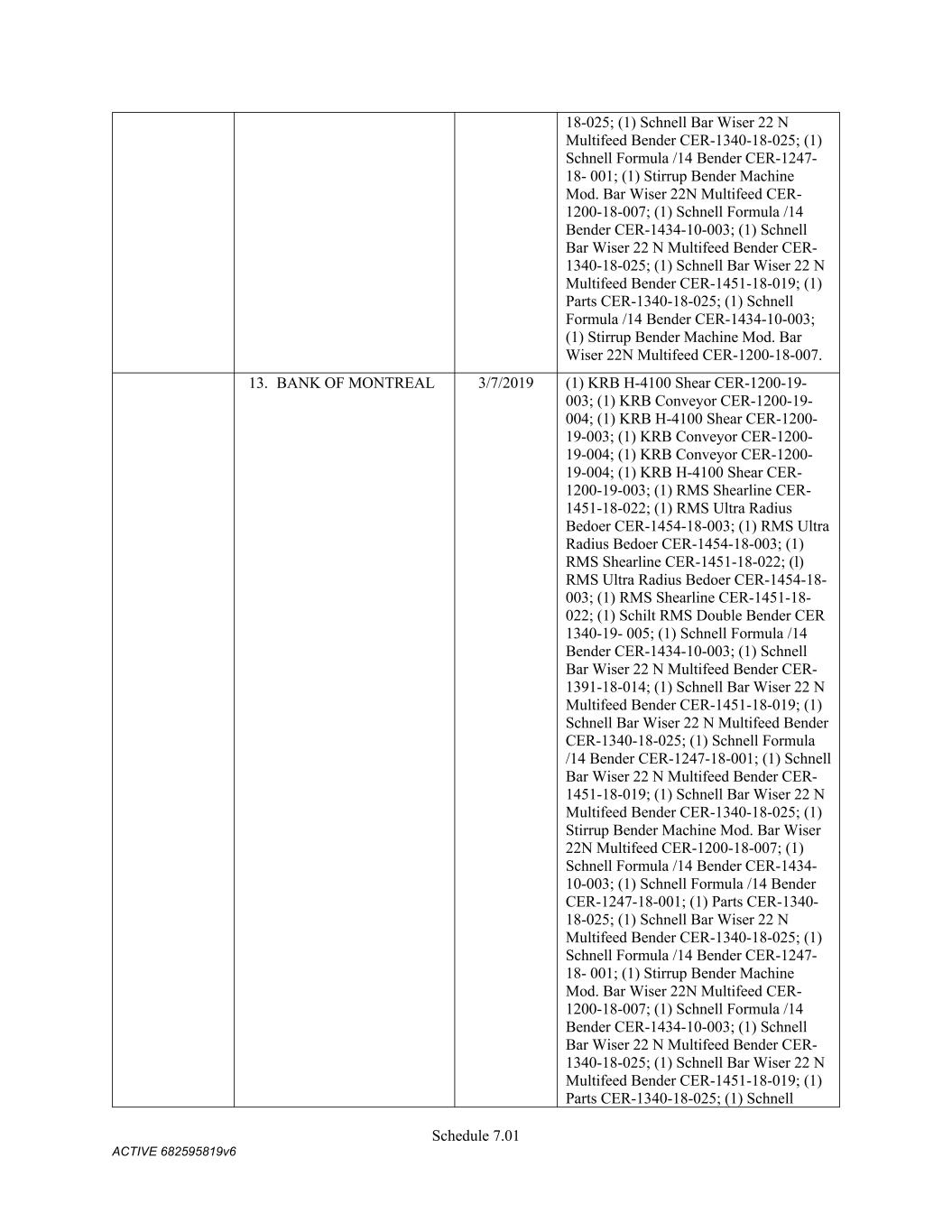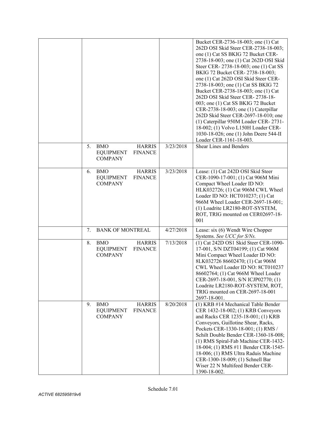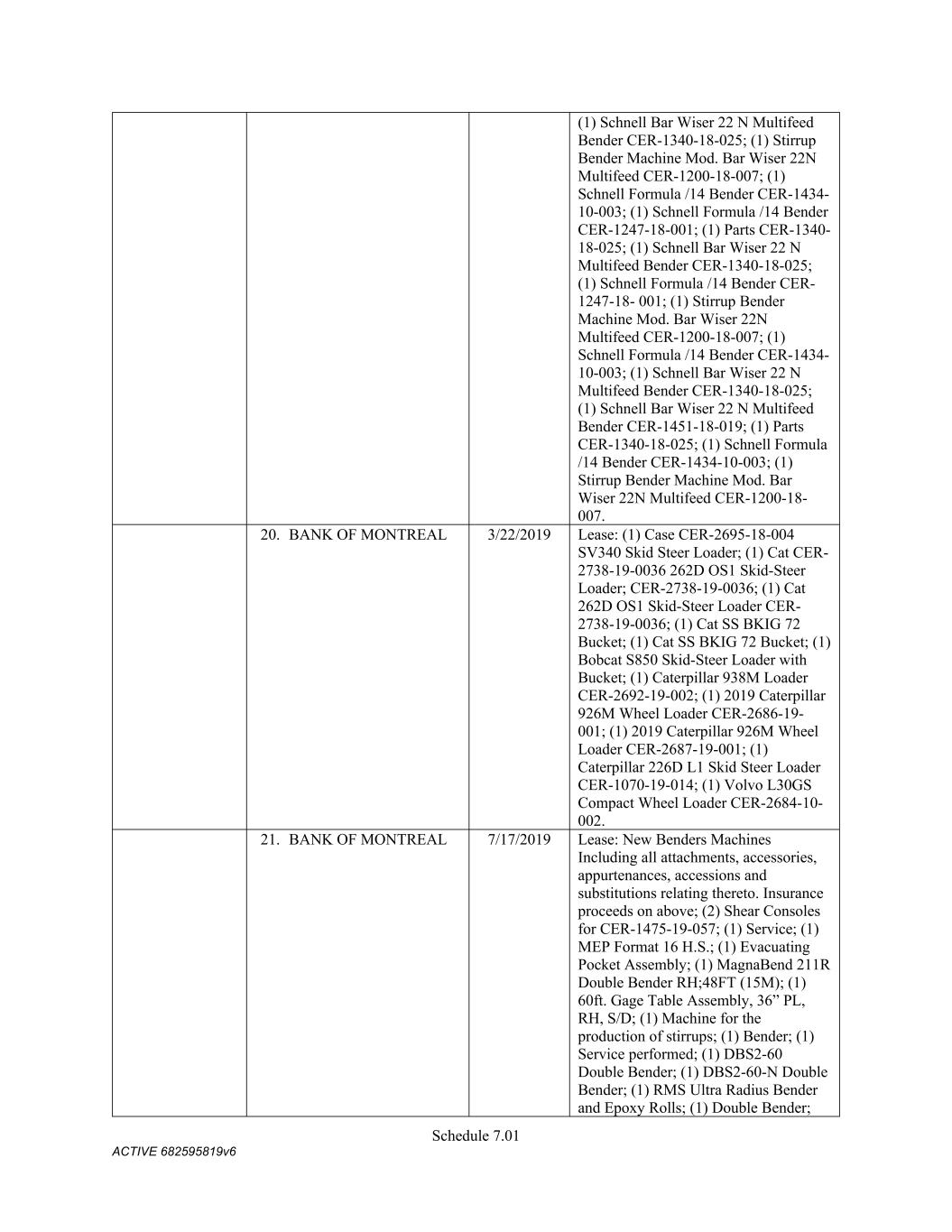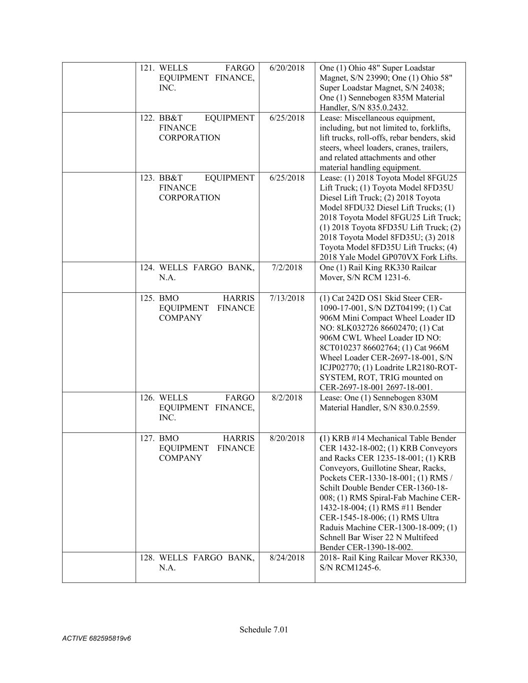 Schedule 3(f) CMC Rebar Assumed Name Perpetual GA (Chatham/ Fulton) CMC Rebar Assumed Name Perpetual MS CMC Rebar Assumed Name Perpetual NC (Gaston) CMC Rebar Assumed Name Perpetual NC (Stokes) CMC Rebar Trade Name Perpetual OK CMC Rebar Assumed Name Perpetual VA (Fredericksburg) CMC Rebar Assumed Name Perpetual n/a WA CMC Joist & Deck Assumed Name 3/29/2007 -- n/a IN CMC Rebar Assumed Name 12/27/2025 n/a HI CMC Cable Fictious Name 8/30/2024 n/a CA (San Bernardino) CMC Cable Fictious Name 3/28/2024 n/a CA (Los Angeles) CMC Cable Assumed Name -- n/a WA CMC Cable East Assumed Name 5/16/2024 n/a OH CMC Cable East Fictious Name 5/24/2024 n/a FL CMC Cable East Assumed Name 5/16/2029 n/a TN CMC Cable East Assumed Name -- n/a GA (Fulton) CMC Cable East Fictious Name -- n/a MS CMC Cable East Assumed Name -- n/a NC (Wake) CMC Cable East Assumed Name -- n/a VA (Fairfax) CMC Cable East Assumed Name -- n/a VA (Newport News) CMC Cable East Assumed Name -- n/a VA (Northampton) CMC Cable East Assumed Name -- n/a VA (Prince William) CMC Cable East Assumed Name -- n/a VA (Richmond) CMC Cable East Assumed Name -- n/a VA (Southampton) CMC Cable East Assumed Name -- n/a VA (Virginia Beach) CMC Construction Services Fictious Name 12/31/2025 n/a FL CMC Construction Services Assumed Name 8/12/2025 n/a TX (Dallas) CMC Construction Services Assumed Name 9/7/2025 n/a LA CMC Construction Services Assumed Name -- n/a AZ (Maricopa) CMC Construction Services Assumed Name -- n/a AR CMC Construction Services Assumed Name -- n/a CO CMC Construction Services Assumed Name -- ID CMC Construction Services Trade Name -- OK CMC Paving Solutions Assumed Name 5/1/2025 n/a IL