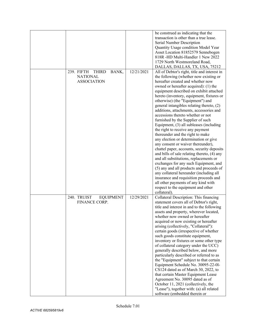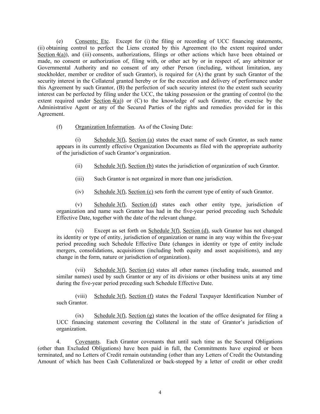 4 (e) Consents; Etc. Except for (i) the filing or recording of UCC financing statements, (ii) obtaining control to perfect the Liens created by this Agreement (to the extent required under Section 4(a)), and (iii) consents, authorizations, filings or other actions which have been obtained or made, no consent or authorization of, filing with, or other act by or in respect of, any arbitrator or Governmental Authority and no consent of any other Person (including, without limitation, any stockholder, member or creditor of such Grantor), is required for (A) the grant by such Grantor of the security interest in the Collateral granted hereby or for the execution and delivery of performance under this Agreement by such Grantor, (B) the perfection of such security interest (to the extent such security interest can be perfected by filing under the UCC, the taking possession or the granting of control (to the extent required under Section 4(a)) or (C) to the knowledge of such Grantor, the exercise by the Administrative Agent or any of the Secured Parties of the rights and remedies provided for in this Agreement. (f) Organization Information. As of the Closing Date: (i) Schedule 3(f), Section (a) states the exact name of such Grantor, as such name appears in its currently effective Organization Documents as filed with the appropriate authority of the jurisdiction of such Grantor’s organization. (ii) Schedule 3(f), Section (b) states the jurisdiction of organization of such Grantor. (iii) Such Grantor is not organized in more than one jurisdiction. (iv) Schedule 3(f), Section (c) sets forth the current type of entity of such Grantor. (v) Schedule 3(f), Section (d) states each other entity type, jurisdiction of organization and name such Grantor has had in the five-year period preceding such Schedule Effective Date, together with the date of the relevant change. (vi) Except as set forth on Schedule 3(f), Section (d), such Grantor has not changed its identity or type of entity, jurisdiction of organization or name in any way within the five-year period preceding such Schedule Effective Date (changes in identity or type of entity include mergers, consolidations, acquisitions (including both equity and asset acquisitions), and any change in the form, nature or jurisdiction of organization). (vii) Schedule 3(f), Section (e) states all other names (including trade, assumed and similar names) used by such Grantor or any of its divisions or other business units at any time during the five-year period preceding such Schedule Effective Date. (viii) Schedule 3(f), Section (f) states the Federal Taxpayer Identification Number of such Grantor. (ix) Schedule 3(f), Section (g) states the location of the office designated for filing a UCC financing statement covering the Collateral in the state of Grantor’s jurisdiction of organization. 4. Covenants. Each Grantor covenants that until such time as the Secured Obligations (other than Excluded Obligations) have been paid in full, the Commitments have expired or been terminated, and no Letters of Credit remain outstanding (other than any Letters of Credit the Outstanding Amount of which has been Cash Collateralized or back-stopped by a letter of credit or other credit