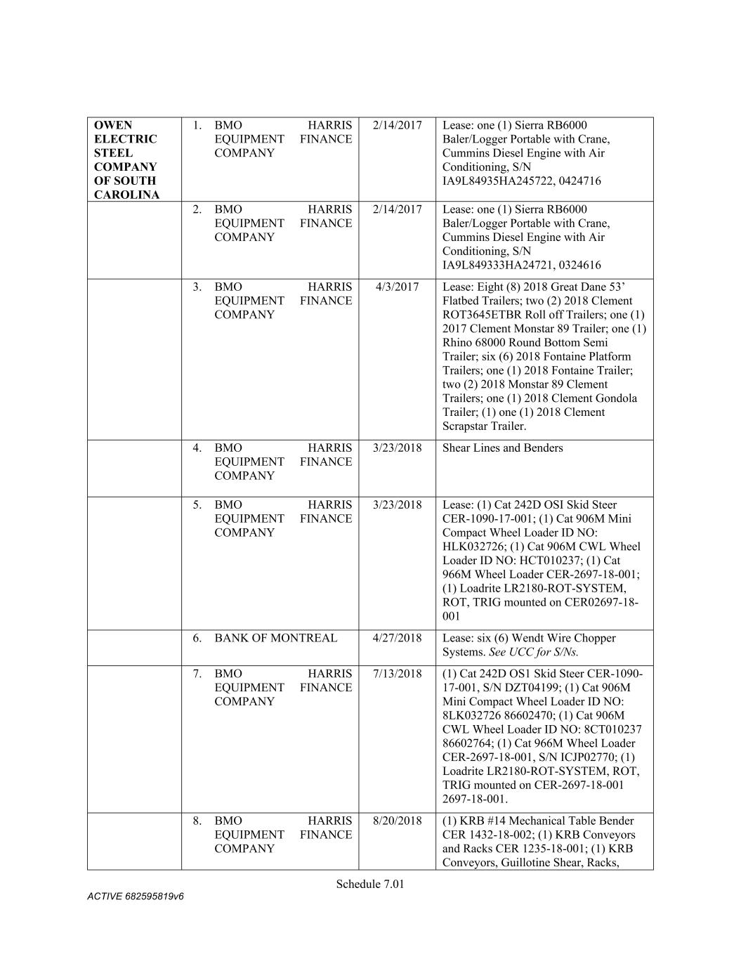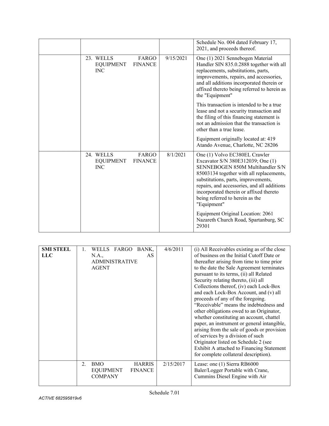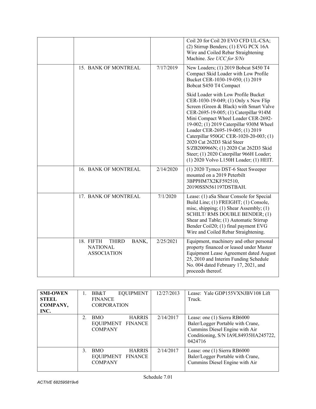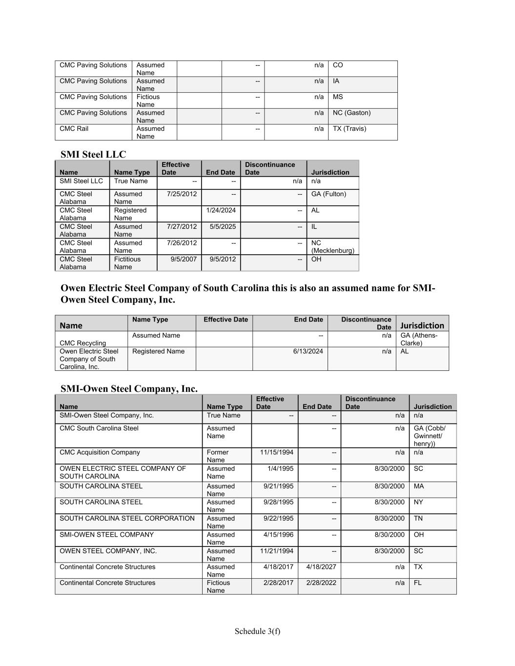 Schedule 3(f) CMC Paving Solutions Assumed Name -- n/a CO CMC Paving Solutions Assumed Name -- n/a IA CMC Paving Solutions Fictious Name -- n/a MS CMC Paving Solutions Assumed Name -- n/a NC (Gaston) CMC Rail Assumed Name -- n/a TX (Travis) SMI Steel LLC Name Name Type Effective Date End Date Discontinuance Date Jurisdiction SMI Steel LLC True Name -- -- n/a n/a CMC Steel Alabama Assumed Name 7/25/2012 -- -- GA (Fulton) CMC Steel Alabama Registered Name 1/24/2024 -- AL CMC Steel Alabama Assumed Name 7/27/2012 5/5/2025 -- IL CMC Steel Alabama Assumed Name 7/26/2012 -- -- NC (Mecklenburg) CMC Steel Alabama Fictitious Name 9/5/2007 9/5/2012 -- OH   Owen Electric Steel Company of South Carolina this is also an assumed name for SMI- Owen Steel Company, Inc. Name  Name Type Effective Date End Date Discontinuance Date Jurisdiction  CMC Recycling Assumed Name -- n/a GA (Athens- Clarke) Owen Electric Steel Company of South Carolina, Inc. Registered Name 6/13/2024 n/a AL SMI-Owen Steel Company, Inc. Name Name Type Effective Date End Date Discontinuance Date Jurisdiction SMI-Owen Steel Company, Inc. True Name -- -- n/a n/a CMC South Carolina Steel Assumed Name -- n/a GA (Cobb/ Gwinnett/ henry)) CMC Acquisition Company Former Name 11/15/1994 -- n/a n/a OWEN ELECTRIC STEEL COMPANY OF SOUTH CAROLINA Assumed Name 1/4/1995 -- 8/30/2000 SC SOUTH CAROLINA STEEL Assumed Name 9/21/1995 -- 8/30/2000 MA SOUTH CAROLINA STEEL Assumed Name 9/28/1995 -- 8/30/2000 NY SOUTH CAROLINA STEEL CORPORATION Assumed Name 9/22/1995 -- 8/30/2000 TN SMI-OWEN STEEL COMPANY Assumed Name 4/15/1996 -- 8/30/2000 OH OWEN STEEL COMPANY, INC. Assumed Name 11/21/1994 -- 8/30/2000 SC Continental Concrete Structures Assumed Name 4/18/2017 4/18/2027 n/a TX Continental Concrete Structures Fictious Name 2/28/2017 2/28/2022 n/a FL