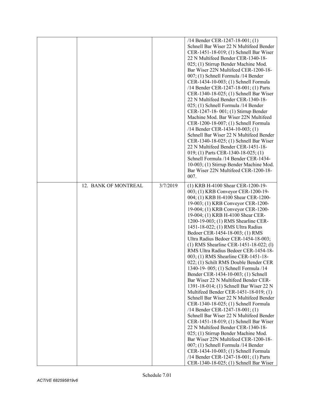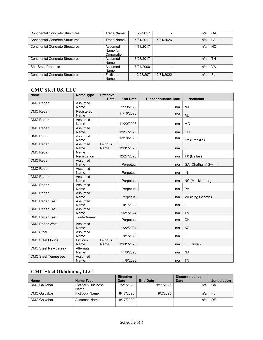 Schedule 3(f) Continental Concrete Structures Trade Name 3/29/2017 - n/a GA Continental Concrete Structures Trade Name 5/31/2017 5/31/2026 n/a LA Continental Concrete Structures Assumed Name for Corporation 4/18/2017 - n/a NC Continental Concrete Structures Assumed Name 3/23/2017 - n/a TN SMI Steel Products Assumed Name 8/24/2000 - n/a VA Continental Concrete Structures Fictitious Name 2/28/207 12/31/2022 n/a FL CMC Steel US, LLC Name Name Type Effective Date End Date Discontinuance Date Jurisdiction CMC Rebar Assumed Name 11/9/2023 n/a NJ CMC Rebar Registered Name 11/16/2023 n/a AL CMC Rebar Assumed Name 11/20/2023 n/a MO CMC Rebar Assumed Name 12/17/2023 n/a OH CMC Rebar Assumed Name 12/18/2023 n/a KY (Franklin) CMC Rebar Assumed Name Fictious Name 12/31/2023 n/a FL CMC Rebar Name Registration 12/27/2028 n/a TX (Dallas) CMC Rebar Assumed Name Perpetual n/a GA (Chatham/ Gwinn) CMC Rebar Assumed Name Perpetual n/a IN CMC Rebar Assumed Name Perpetual n/a NC (Mecklenburg) CMC Rebar Assumed Name Perpetual n/a PA CMC Rebar Assumed Name Perpetual n/a VA (King George) CMC Rebar East Assumed Name 9/1/2020 n/a IL CMC Rebar East Assumed Name 1/21/2024 n/a TN CMC Rebar East Trade Name Perpetual n/a OK CMC Rebar West Assumed Name 1/22/2024 n/a AZ CMC Steel Assumed Name 9/1/2020 n/a IL CMC Steel Florida Fictious Name Fictious Name 12/31/2023 n/a FL (Duval) CMC Steel New Jersey Alternate Name 11/8/2023 n/a NJ CMC Steel Tennessee Assumed Name 11/8/2023 n/a TN CMC Steel Oklahoma, LLC Name Name Type Effective Date End Date Discontinuance Date Jurisdiction CMC Galvabar Fictitious Business Name 7/21/2020 9/11/2025 n/a CA CMC Galvabar Fictitious Name 8/17/2020 9/2/2025 n/a FL CMC Galvabar Assumed Name 8/17/2020 -- n/a DE