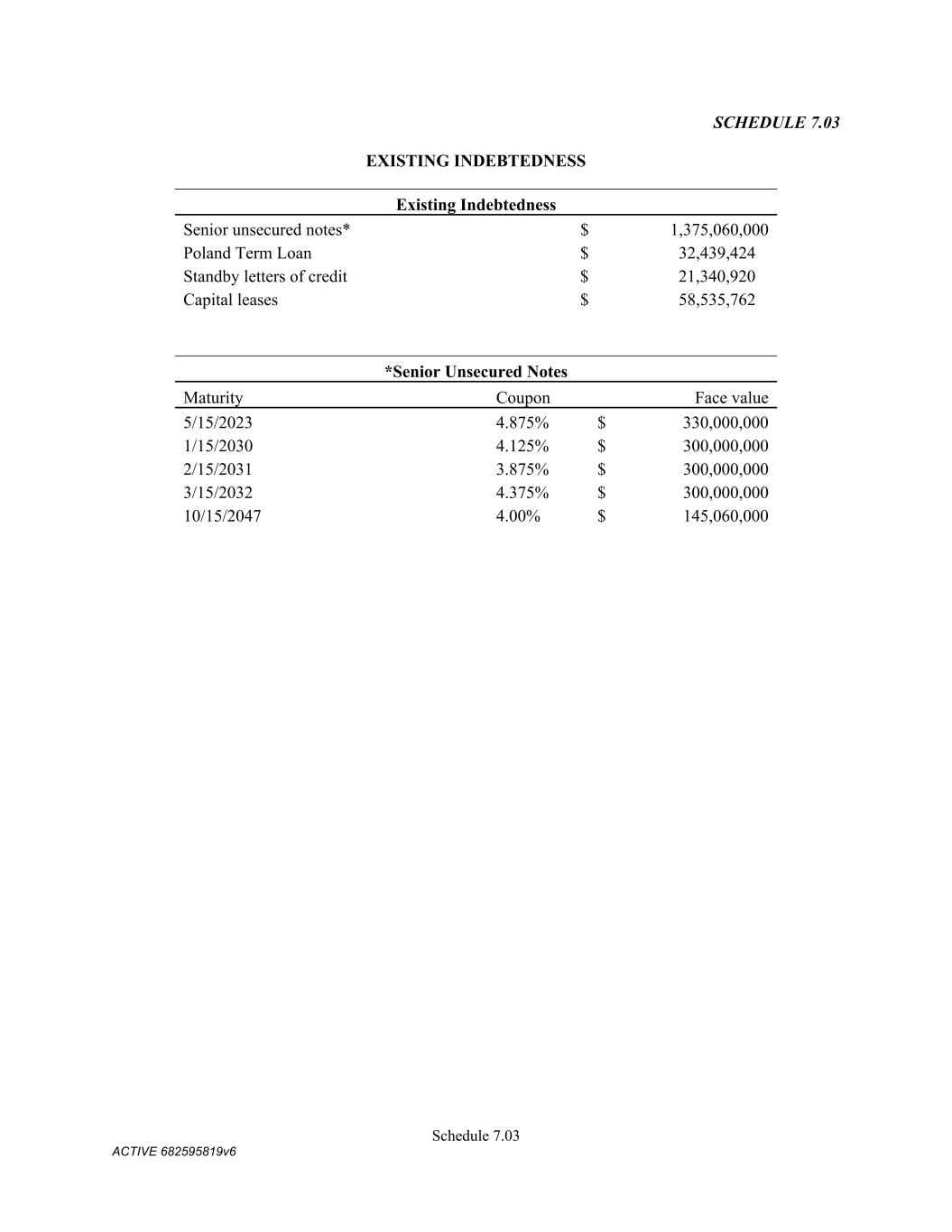 Schedule 7.03 ACTIVE 682595819v6 SCHEDULE 7.03 EXISTING INDEBTEDNESS Existing Indebtedness Senior unsecured notes* $ 1,375,060,000 Poland Term Loan $ 32,439,424 Standby letters of credit $ 21,340,920 Capital leases $ 58,535,762 *Senior Unsecured Notes Maturity Coupon Face value 5/15/2023 4.875% $ 330,000,000 1/15/2030 4.125% $ 300,000,000 2/15/2031 3.875% $ 300,000,000 3/15/2032 4.375% $ 300,000,000 10/15/2047 4.00% $ 145,060,000