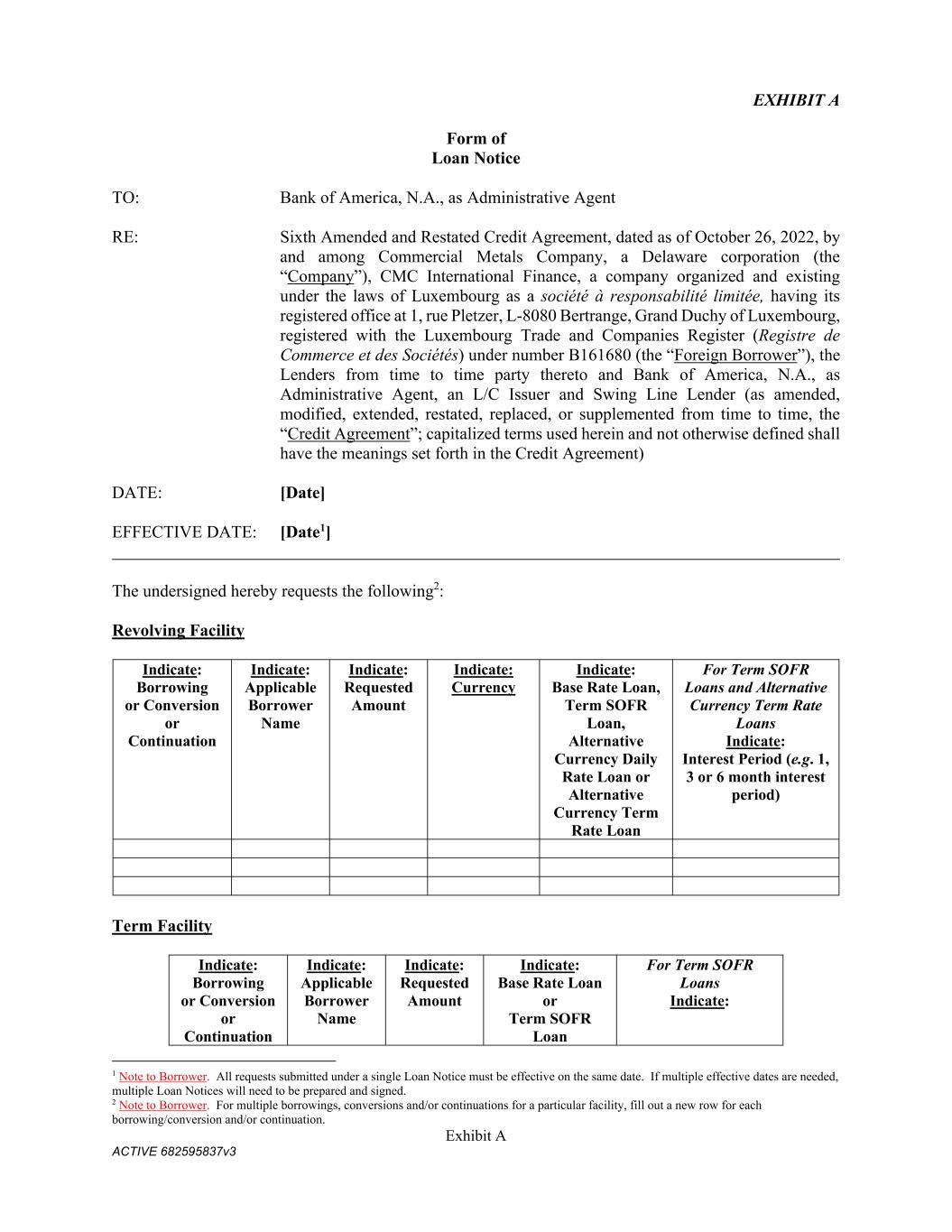 Exhibit A ACTIVE 682595837v3 EXHIBIT A Form of Loan Notice TO: Bank of America, N.A., as Administrative Agent RE: Sixth Amended and Restated Credit Agreement, dated as of October 26, 2022, by and among Commercial Metals Company, a Delaware corporation (the “Company”), CMC International Finance, a company organized and existing under the laws of Luxembourg as a société à responsabilité limitée, having its registered office at 1, rue Pletzer, L-8080 Bertrange, Grand Duchy of Luxembourg, registered with the Luxembourg Trade and Companies Register (Registre de Commerce et des Sociétés) under number B161680 (the “Foreign Borrower”), the Lenders from time to time party thereto and Bank of America, N.A., as Administrative Agent, an L/C Issuer and Swing Line Lender (as amended, modified, extended, restated, replaced, or supplemented from time to time, the “Credit Agreement”; capitalized terms used herein and not otherwise defined shall have the meanings set forth in the Credit Agreement) DATE: [Date] EFFECTIVE DATE: [Date1] The undersigned hereby requests the following2: Revolving Facility Indicate: Borrowing or Conversion or Continuation Indicate: Applicable Borrower Name Indicate: Requested Amount Indicate: Currency Indicate: Base Rate Loan, Term SOFR Loan, Alternative Currency Daily Rate Loan or Alternative Currency Term Rate Loan For Term SOFR Loans and Alternative Currency Term Rate Loans Indicate: Interest Period (e.g. 1, 3 or 6 month interest period) Term Facility Indicate: Borrowing or Conversion or Continuation Indicate: Applicable Borrower Name Indicate: Requested Amount Indicate: Base Rate Loan or Term SOFR Loan For Term SOFR Loans Indicate: 1 Note to Borrower. All requests submitted under a single Loan Notice must be effective on the same date. If multiple effective dates are needed, multiple Loan Notices will need to be prepared and signed. 2 Note to Borrower. For multiple borrowings, conversions and/or continuations for a particular facility, fill out a new row for each borrowing/conversion and/or continuation.