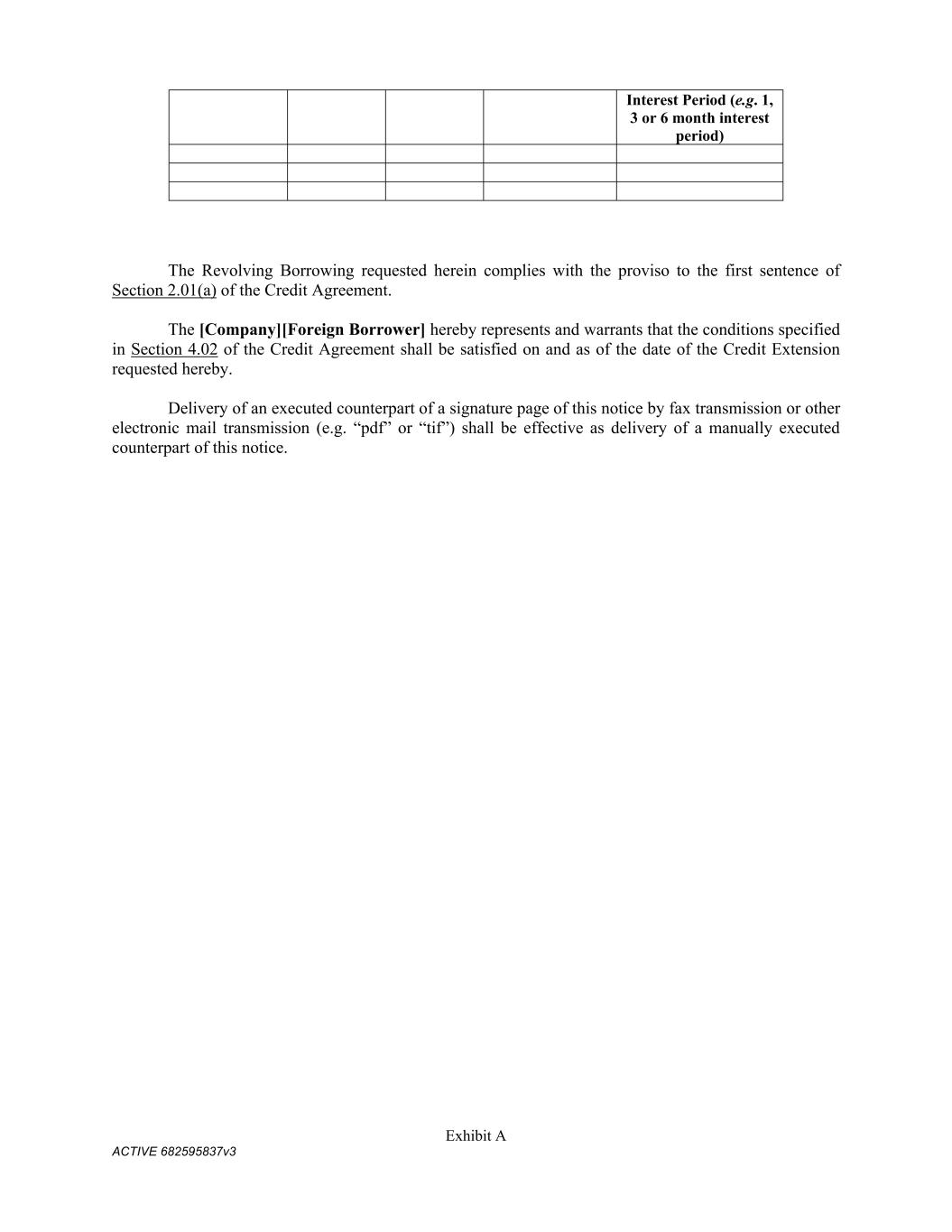 Exhibit A ACTIVE 682595837v3 Interest Period (e.g. 1, 3 or 6 month interest period) The Revolving Borrowing requested herein complies with the proviso to the first sentence of Section 2.01(a) of the Credit Agreement. The [Company][Foreign Borrower] hereby represents and warrants that the conditions specified in Section 4.02 of the Credit Agreement shall be satisfied on and as of the date of the Credit Extension requested hereby. Delivery of an executed counterpart of a signature page of this notice by fax transmission or other electronic mail transmission (e.g. “pdf” or “tif”) shall be effective as delivery of a manually executed counterpart of this notice.