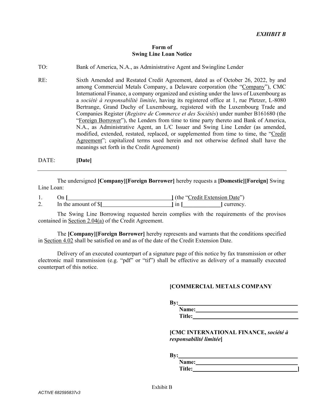 Exhibit B ACTIVE 682595837v3 EXHIBIT B Form of Swing Line Loan Notice TO: Bank of America, N.A., as Administrative Agent and Swingline Lender RE: Sixth Amended and Restated Credit Agreement, dated as of October 26, 2022, by and among Commercial Metals Company, a Delaware corporation (the “Company”), CMC International Finance, a company organized and existing under the laws of Luxembourg as a société à responsabilité limitée, having its registered office at 1, rue Pletzer, L-8080 Bertrange, Grand Duchy of Luxembourg, registered with the Luxembourg Trade and Companies Register (Registre de Commerce et des Sociétés) under number B161680 (the “Foreign Borrower”), the Lenders from time to time party thereto and Bank of America, N.A., as Administrative Agent, an L/C Issuer and Swing Line Lender (as amended, modified, extended, restated, replaced, or supplemented from time to time, the “Credit Agreement”; capitalized terms used herein and not otherwise defined shall have the meanings set forth in the Credit Agreement) DATE: [Date] The undersigned [Company][Foreign Borrower] hereby requests a [Domestic][Foreign] Swing Line Loan: 1. On [ ] (the “Credit Extension Date”) 2. In the amount of $[ ] in [_____________] currency. The Swing Line Borrowing requested herein complies with the requirements of the provisos contained in Section 2.04(a) of the Credit Agreement. The [Company][Foreign Borrower] hereby represents and warrants that the conditions specified in Section 4.02 shall be satisfied on and as of the date of the Credit Extension Date. Delivery of an executed counterpart of a signature page of this notice by fax transmission or other electronic mail transmission (e.g. “pdf” or “tif”) shall be effective as delivery of a manually executed counterpart of this notice. [COMMERCIAL METALS COMPANY By: Name: Title: [CMC INTERNATIONAL FINANCE, société à responsabilité limitée] By: Name: Title: ]