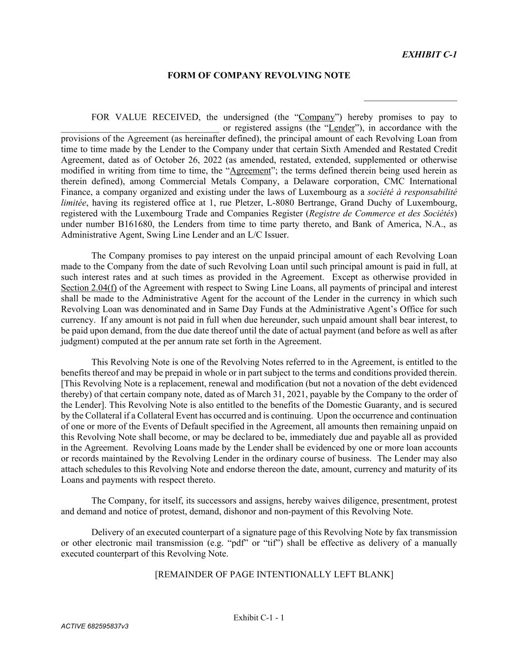 Exhibit C-1 - 1 ACTIVE 682595837v3 EXHIBIT C-1 FORM OF COMPANY REVOLVING NOTE ____________________ FOR VALUE RECEIVED, the undersigned (the “Company”) hereby promises to pay to __________________________________ or registered assigns (the “Lender”), in accordance with the provisions of the Agreement (as hereinafter defined), the principal amount of each Revolving Loan from time to time made by the Lender to the Company under that certain Sixth Amended and Restated Credit Agreement, dated as of October 26, 2022 (as amended, restated, extended, supplemented or otherwise modified in writing from time to time, the “Agreement”; the terms defined therein being used herein as therein defined), among Commercial Metals Company, a Delaware corporation, CMC International Finance, a company organized and existing under the laws of Luxembourg as a société à responsabilité limitée, having its registered office at 1, rue Pletzer, L-8080 Bertrange, Grand Duchy of Luxembourg, registered with the Luxembourg Trade and Companies Register (Registre de Commerce et des Sociétés) under number B161680, the Lenders from time to time party thereto, and Bank of America, N.A., as Administrative Agent, Swing Line Lender and an L/C Issuer. The Company promises to pay interest on the unpaid principal amount of each Revolving Loan made to the Company from the date of such Revolving Loan until such principal amount is paid in full, at such interest rates and at such times as provided in the Agreement. Except as otherwise provided in Section 2.04(f) of the Agreement with respect to Swing Line Loans, all payments of principal and interest shall be made to the Administrative Agent for the account of the Lender in the currency in which such Revolving Loan was denominated and in Same Day Funds at the Administrative Agent’s Office for such currency. If any amount is not paid in full when due hereunder, such unpaid amount shall bear interest, to be paid upon demand, from the due date thereof until the date of actual payment (and before as well as after judgment) computed at the per annum rate set forth in the Agreement. This Revolving Note is one of the Revolving Notes referred to in the Agreement, is entitled to the benefits thereof and may be prepaid in whole or in part subject to the terms and conditions provided therein. [This Revolving Note is a replacement, renewal and modification (but not a novation of the debt evidenced thereby) of that certain company note, dated as of March 31, 2021, payable by the Company to the order of the Lender]. This Revolving Note is also entitled to the benefits of the Domestic Guaranty, and is secured by the Collateral if a Collateral Event has occurred and is continuing. Upon the occurrence and continuation of one or more of the Events of Default specified in the Agreement, all amounts then remaining unpaid on this Revolving Note shall become, or may be declared to be, immediately due and payable all as provided in the Agreement. Revolving Loans made by the Lender shall be evidenced by one or more loan accounts or records maintained by the Revolving Lender in the ordinary course of business. The Lender may also attach schedules to this Revolving Note and endorse thereon the date, amount, currency and maturity of its Loans and payments with respect thereto. The Company, for itself, its successors and assigns, hereby waives diligence, presentment, protest and demand and notice of protest, demand, dishonor and non-payment of this Revolving Note. Delivery of an executed counterpart of a signature page of this Revolving Note by fax transmission or other electronic mail transmission (e.g. “pdf” or “tif”) shall be effective as delivery of a manually executed counterpart of this Revolving Note. [REMAINDER OF PAGE INTENTIONALLY LEFT BLANK]