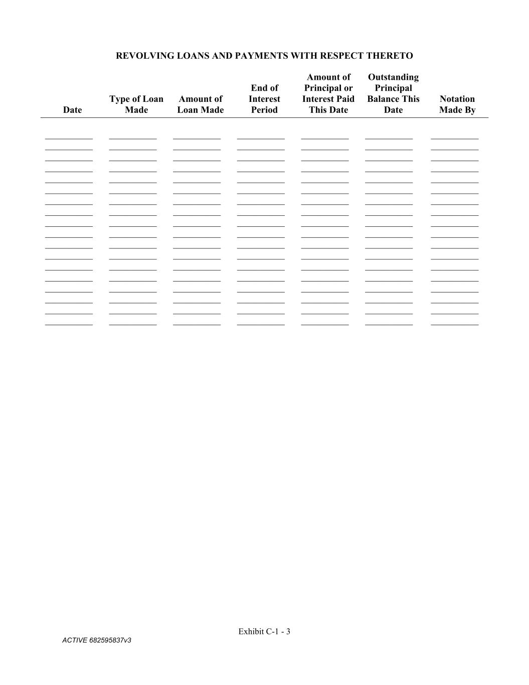 Exhibit C-1 - 3 ACTIVE 682595837v3 REVOLVING LOANS AND PAYMENTS WITH RESPECT THERETO Date Type of Loan Made Amount of Loan Made End of Interest Period Amount of Principal or Interest Paid This Date Outstanding Principal Balance This Date Notation Made By __________ __________ __________ __________ __________ __________ __________ __________ __________ __________ __________ __________ __________ __________ __________ __________ __________ __________ __________ __________ __________ __________ __________ __________ __________ __________ __________ __________ __________ __________ __________ __________ __________ __________ __________ __________ __________ __________ __________ __________ __________ __________ __________ __________ __________ __________ __________ __________ __________ __________ __________ __________ __________ __________ __________ __________ __________ __________ __________ __________ __________ __________ __________ __________ __________ __________ __________ __________ __________ __________ __________ __________ __________ __________ __________ __________ __________ __________ __________ __________ __________ __________ __________ __________ __________ __________ __________ __________ __________ __________ __________ __________ __________ __________ __________ __________ __________ __________ __________ __________ __________ __________ __________ __________ __________ __________ __________ __________ __________ __________ __________ __________ __________ __________ __________ __________ __________ __________ __________ __________ __________ __________ __________ __________ __________ __________