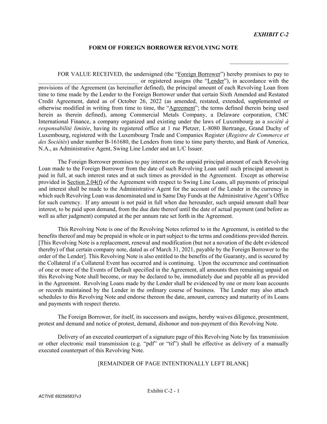 Exhibit C-2 - 1 ACTIVE 682595837v3 EXHIBIT C-2 FORM OF FOREIGN BORROWER REVOLVING NOTE ____________________ FOR VALUE RECEIVED, the undersigned (the “Foreign Borrower”) hereby promises to pay to __________________________________ or registered assigns (the “Lender”), in accordance with the provisions of the Agreement (as hereinafter defined), the principal amount of each Revolving Loan from time to time made by the Lender to the Foreign Borrower under that certain Sixth Amended and Restated Credit Agreement, dated as of October 26, 2022 (as amended, restated, extended, supplemented or otherwise modified in writing from time to time, the “Agreement”; the terms defined therein being used herein as therein defined), among Commercial Metals Company, a Delaware corporation, CMC International Finance, a company organized and existing under the laws of Luxembourg as a société à responsabilité limitée, having its registered office at 1 rue Pletzer, L-8080 Bertrange, Grand Duchy of Luxembourg, registered with the Luxembourg Trade and Companies Register (Registre de Commerce et des Sociétés) under number B-161680, the Lenders from time to time party thereto, and Bank of America, N.A., as Administrative Agent, Swing Line Lender and an L/C Issuer. The Foreign Borrower promises to pay interest on the unpaid principal amount of each Revolving Loan made to the Foreign Borrower from the date of such Revolving Loan until such principal amount is paid in full, at such interest rates and at such times as provided in the Agreement. Except as otherwise provided in Section 2.04(f) of the Agreement with respect to Swing Line Loans, all payments of principal and interest shall be made to the Administrative Agent for the account of the Lender in the currency in which such Revolving Loan was denominated and in Same Day Funds at the Administrative Agent’s Office for such currency. If any amount is not paid in full when due hereunder, such unpaid amount shall bear interest, to be paid upon demand, from the due date thereof until the date of actual payment (and before as well as after judgment) computed at the per annum rate set forth in the Agreement. This Revolving Note is one of the Revolving Notes referred to in the Agreement, is entitled to the benefits thereof and may be prepaid in whole or in part subject to the terms and conditions provided therein. [This Revolving Note is a replacement, renewal and modification (but not a novation of the debt evidenced thereby) of that certain company note, dated as of March 31, 2021, payable by the Foreign Borrower to the order of the Lender]. This Revolving Note is also entitled to the benefits of the Guaranty, and is secured by the Collateral if a Collateral Event has occurred and is continuing. Upon the occurrence and continuation of one or more of the Events of Default specified in the Agreement, all amounts then remaining unpaid on this Revolving Note shall become, or may be declared to be, immediately due and payable all as provided in the Agreement. Revolving Loans made by the Lender shall be evidenced by one or more loan accounts or records maintained by the Lender in the ordinary course of business. The Lender may also attach schedules to this Revolving Note and endorse thereon the date, amount, currency and maturity of its Loans and payments with respect thereto. The Foreign Borrower, for itself, its successors and assigns, hereby waives diligence, presentment, protest and demand and notice of protest, demand, dishonor and non-payment of this Revolving Note. Delivery of an executed counterpart of a signature page of this Revolving Note by fax transmission or other electronic mail transmission (e.g. “pdf” or “tif”) shall be effective as delivery of a manually executed counterpart of this Revolving Note. [REMAINDER OF PAGE INTENTIONALLY LEFT BLANK]