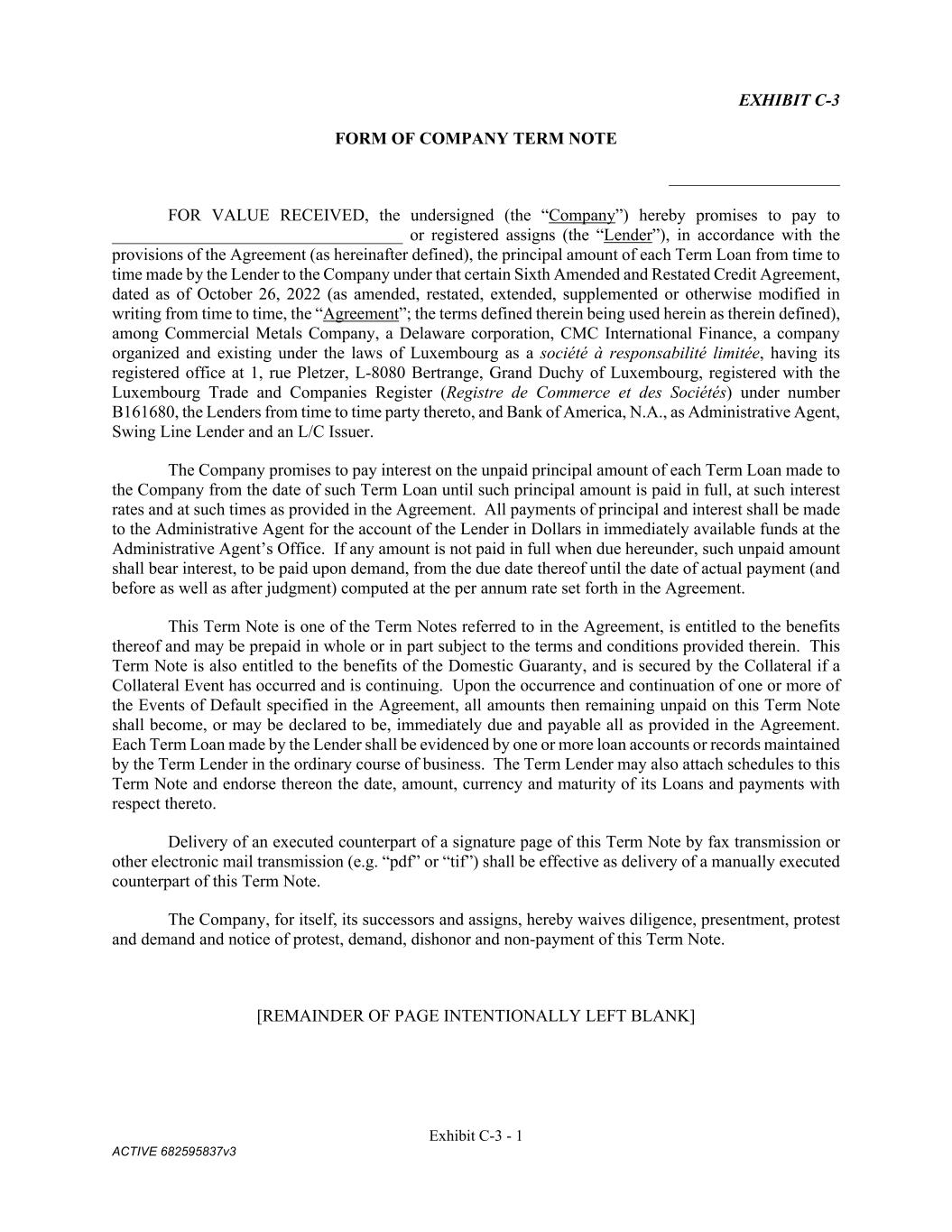 Exhibit C-3 - 1 ACTIVE 682595837v3 EXHIBIT C-3 FORM OF COMPANY TERM NOTE ____________________ FOR VALUE RECEIVED, the undersigned (the “Company”) hereby promises to pay to __________________________________ or registered assigns (the “Lender”), in accordance with the provisions of the Agreement (as hereinafter defined), the principal amount of each Term Loan from time to time made by the Lender to the Company under that certain Sixth Amended and Restated Credit Agreement, dated as of October 26, 2022 (as amended, restated, extended, supplemented or otherwise modified in writing from time to time, the “Agreement”; the terms defined therein being used herein as therein defined), among Commercial Metals Company, a Delaware corporation, CMC International Finance, a company organized and existing under the laws of Luxembourg as a société à responsabilité limitée, having its registered office at 1, rue Pletzer, L-8080 Bertrange, Grand Duchy of Luxembourg, registered with the Luxembourg Trade and Companies Register (Registre de Commerce et des Sociétés) under number B161680, the Lenders from time to time party thereto, and Bank of America, N.A., as Administrative Agent, Swing Line Lender and an L/C Issuer. The Company promises to pay interest on the unpaid principal amount of each Term Loan made to the Company from the date of such Term Loan until such principal amount is paid in full, at such interest rates and at such times as provided in the Agreement. All payments of principal and interest shall be made to the Administrative Agent for the account of the Lender in Dollars in immediately available funds at the Administrative Agent’s Office. If any amount is not paid in full when due hereunder, such unpaid amount shall bear interest, to be paid upon demand, from the due date thereof until the date of actual payment (and before as well as after judgment) computed at the per annum rate set forth in the Agreement. This Term Note is one of the Term Notes referred to in the Agreement, is entitled to the benefits thereof and may be prepaid in whole or in part subject to the terms and conditions provided therein. This Term Note is also entitled to the benefits of the Domestic Guaranty, and is secured by the Collateral if a Collateral Event has occurred and is continuing. Upon the occurrence and continuation of one or more of the Events of Default specified in the Agreement, all amounts then remaining unpaid on this Term Note shall become, or may be declared to be, immediately due and payable all as provided in the Agreement. Each Term Loan made by the Lender shall be evidenced by one or more loan accounts or records maintained by the Term Lender in the ordinary course of business. The Term Lender may also attach schedules to this Term Note and endorse thereon the date, amount, currency and maturity of its Loans and payments with respect thereto. Delivery of an executed counterpart of a signature page of this Term Note by fax transmission or other electronic mail transmission (e.g. “pdf” or “tif”) shall be effective as delivery of a manually executed counterpart of this Term Note. The Company, for itself, its successors and assigns, hereby waives diligence, presentment, protest and demand and notice of protest, demand, dishonor and non-payment of this Term Note. [REMAINDER OF PAGE INTENTIONALLY LEFT BLANK]
