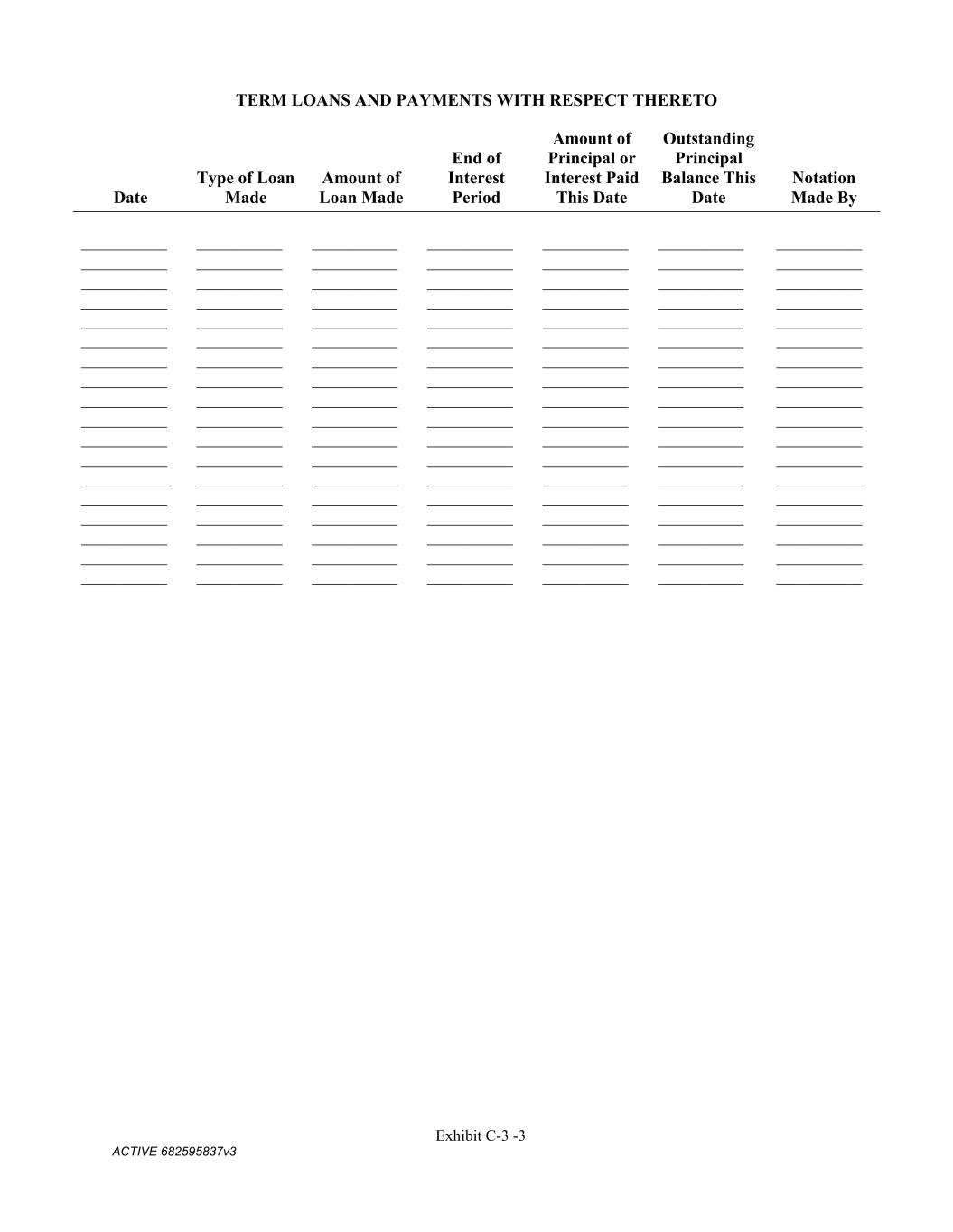 Exhibit C-3 -3 ACTIVE 682595837v3 TERM LOANS AND PAYMENTS WITH RESPECT THERETO Date Type of Loan Made Amount of Loan Made End of Interest Period Amount of Principal or Interest Paid This Date Outstanding Principal Balance This Date Notation Made By __________ __________ __________ __________ __________ __________ __________ __________ __________ __________ __________ __________ __________ __________ __________ __________ __________ __________ __________ __________ __________ __________ __________ __________ __________ __________ __________ __________ __________ __________ __________ __________ __________ __________ __________ __________ __________ __________ __________ __________ __________ __________ __________ __________ __________ __________ __________ __________ __________ __________ __________ __________ __________ __________ __________ __________ __________ __________ __________ __________ __________ __________ __________ __________ __________ __________ __________ __________ __________ __________ __________ __________ __________ __________ __________ __________ __________ __________ __________ __________ __________ __________ __________ __________ __________ __________ __________ __________ __________ __________ __________ __________ __________ __________ __________ __________ __________ __________ __________ __________ __________ __________ __________ __________ __________ __________ __________ __________ __________ __________ __________ __________ __________ __________ __________ __________ __________ __________ __________ __________ __________ __________ __________ __________ __________ __________