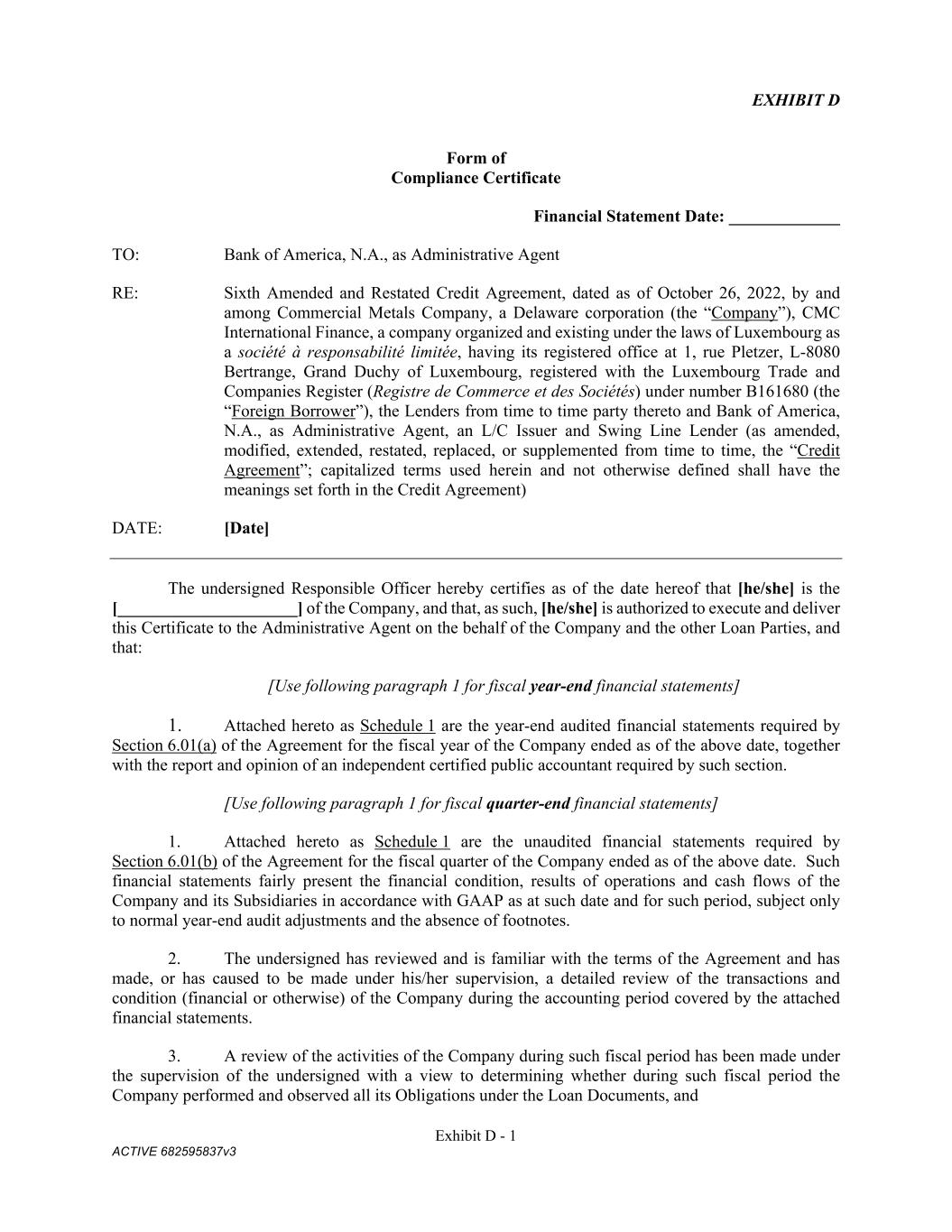 Exhibit D - 1 ACTIVE 682595837v3 EXHIBIT D Form of Compliance Certificate Financial Statement Date: _____________ TO: Bank of America, N.A., as Administrative Agent RE: Sixth Amended and Restated Credit Agreement, dated as of October 26, 2022, by and among Commercial Metals Company, a Delaware corporation (the “Company”), CMC International Finance, a company organized and existing under the laws of Luxembourg as a société à responsabilité limitée, having its registered office at 1, rue Pletzer, L-8080 Bertrange, Grand Duchy of Luxembourg, registered with the Luxembourg Trade and Companies Register (Registre de Commerce et des Sociétés) under number B161680 (the “Foreign Borrower”), the Lenders from time to time party thereto and Bank of America, N.A., as Administrative Agent, an L/C Issuer and Swing Line Lender (as amended, modified, extended, restated, replaced, or supplemented from time to time, the “Credit Agreement”; capitalized terms used herein and not otherwise defined shall have the meanings set forth in the Credit Agreement) DATE: [Date] The undersigned Responsible Officer hereby certifies as of the date hereof that [he/she] is the [_____________________] of the Company, and that, as such, [he/she] is authorized to execute and deliver this Certificate to the Administrative Agent on the behalf of the Company and the other Loan Parties, and that: [Use following paragraph 1 for fiscal year-end financial statements] 1. Attached hereto as Schedule 1 are the year-end audited financial statements required by Section 6.01(a) of the Agreement for the fiscal year of the Company ended as of the above date, together with the report and opinion of an independent certified public accountant required by such section. [Use following paragraph 1 for fiscal quarter-end financial statements] 1. Attached hereto as Schedule 1 are the unaudited financial statements required by Section 6.01(b) of the Agreement for the fiscal quarter of the Company ended as of the above date. Such financial statements fairly present the financial condition, results of operations and cash flows of the Company and its Subsidiaries in accordance with GAAP as at such date and for such period, subject only to normal year-end audit adjustments and the absence of footnotes. 2. The undersigned has reviewed and is familiar with the terms of the Agreement and has made, or has caused to be made under his/her supervision, a detailed review of the transactions and condition (financial or otherwise) of the Company during the accounting period covered by the attached financial statements. 3. A review of the activities of the Company during such fiscal period has been made under the supervision of the undersigned with a view to determining whether during such fiscal period the Company performed and observed all its Obligations under the Loan Documents, and