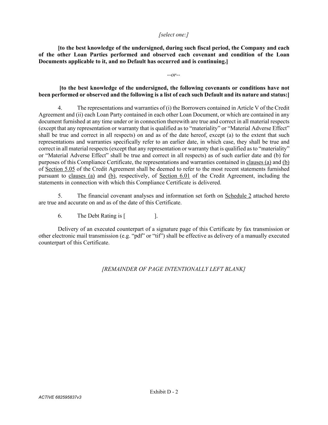 Exhibit D - 2 ACTIVE 682595837v3 [select one:] [to the best knowledge of the undersigned, during such fiscal period, the Company and each of the other Loan Parties performed and observed each covenant and condition of the Loan Documents applicable to it, and no Default has occurred and is continuing.] --or-- [to the best knowledge of the undersigned, the following covenants or conditions have not been performed or observed and the following is a list of each such Default and its nature and status:] 4. The representations and warranties of (i) the Borrowers contained in Article V of the Credit Agreement and (ii) each Loan Party contained in each other Loan Document, or which are contained in any document furnished at any time under or in connection therewith are true and correct in all material respects (except that any representation or warranty that is qualified as to “materiality” or “Material Adverse Effect” shall be true and correct in all respects) on and as of the date hereof, except (a) to the extent that such representations and warranties specifically refer to an earlier date, in which case, they shall be true and correct in all material respects (except that any representation or warranty that is qualified as to “materiality” or “Material Adverse Effect” shall be true and correct in all respects) as of such earlier date and (b) for purposes of this Compliance Certificate, the representations and warranties contained in clauses (a) and (b) of Section 5.05 of the Credit Agreement shall be deemed to refer to the most recent statements furnished pursuant to clauses (a) and (b), respectively, of Section 6.01 of the Credit Agreement, including the statements in connection with which this Compliance Certificate is delivered. 5. The financial covenant analyses and information set forth on Schedule 2 attached hereto are true and accurate on and as of the date of this Certificate. 6. The Debt Rating is [ ]. Delivery of an executed counterpart of a signature page of this Certificate by fax transmission or other electronic mail transmission (e.g. “pdf” or “tif”) shall be effective as delivery of a manually executed counterpart of this Certificate. [REMAINDER OF PAGE INTENTIONALLY LEFT BLANK]