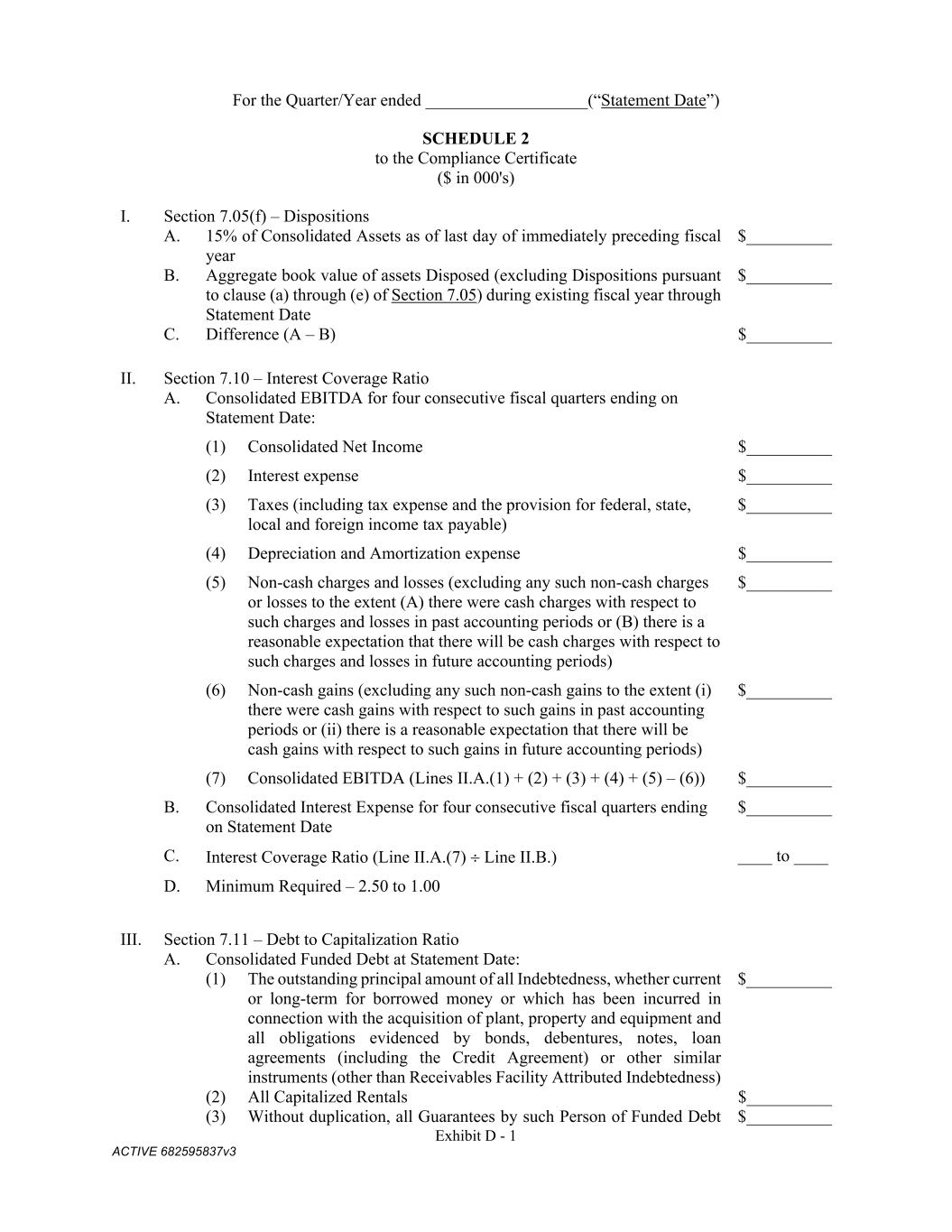 Exhibit D - 1 ACTIVE 682595837v3 For the Quarter/Year ended ___________________(“Statement Date”) SCHEDULE 2 to the Compliance Certificate ($ in 000's) I. Section 7.05(f) – Dispositions A. 15% of Consolidated Assets as of last day of immediately preceding fiscal year $__________ B. Aggregate book value of assets Disposed (excluding Dispositions pursuant to clause (a) through (e) of Section 7.05) during existing fiscal year through Statement Date $__________ C. Difference (A – B) $__________ II. Section 7.10 – Interest Coverage Ratio A. Consolidated EBITDA for four consecutive fiscal quarters ending on Statement Date: (1) Consolidated Net Income $__________ (2) Interest expense $__________ (3) Taxes (including tax expense and the provision for federal, state, local and foreign income tax payable) $__________ (4) Depreciation and Amortization expense $__________ (5) Non-cash charges and losses (excluding any such non-cash charges or losses to the extent (A) there were cash charges with respect to such charges and losses in past accounting periods or (B) there is a reasonable expectation that there will be cash charges with respect to such charges and losses in future accounting periods) $__________ (6) Non-cash gains (excluding any such non-cash gains to the extent (i) there were cash gains with respect to such gains in past accounting periods or (ii) there is a reasonable expectation that there will be cash gains with respect to such gains in future accounting periods) $__________ (7) Consolidated EBITDA (Lines II.A.(1) + (2) + (3) + (4) + (5) – (6)) $__________ B. Consolidated Interest Expense for four consecutive fiscal quarters ending on Statement Date $__________ C. Interest Coverage Ratio (Line II.A.(7)  Line II.B.) ____ to ____ D. Minimum Required – 2.50 to 1.00 III. Section 7.11 – Debt to Capitalization Ratio A. Consolidated Funded Debt at Statement Date: (1) The outstanding principal amount of all Indebtedness, whether current or long-term for borrowed money or which has been incurred in connection with the acquisition of plant, property and equipment and all obligations evidenced by bonds, debentures, notes, loan agreements (including the Credit Agreement) or other similar instruments (other than Receivables Facility Attributed Indebtedness) $__________ (2) All Capitalized Rentals $__________ (3) Without duplication, all Guarantees by such Person of Funded Debt $__________