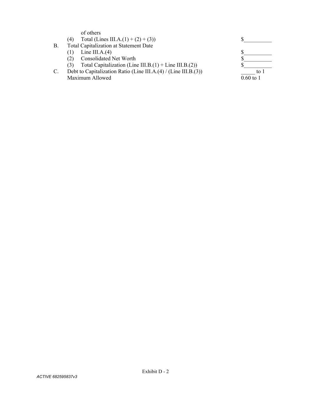 Exhibit D - 2 ACTIVE 682595837v3 of others (4) Total (Lines III.A.(1) + (2) + (3)) $__________ B. Total Capitalization at Statement Date (1) Line III.A.(4) $__________ (2) Consolidated Net Worth $__________ (3) Total Capitalization (Line III.B.(1) + Line III.B.(2)) $__________ C. Debt to Capitalization Ratio (Line III.A.(4) / (Line III.B.(3)) _____ to 1 Maximum Allowed 0.60 to 1