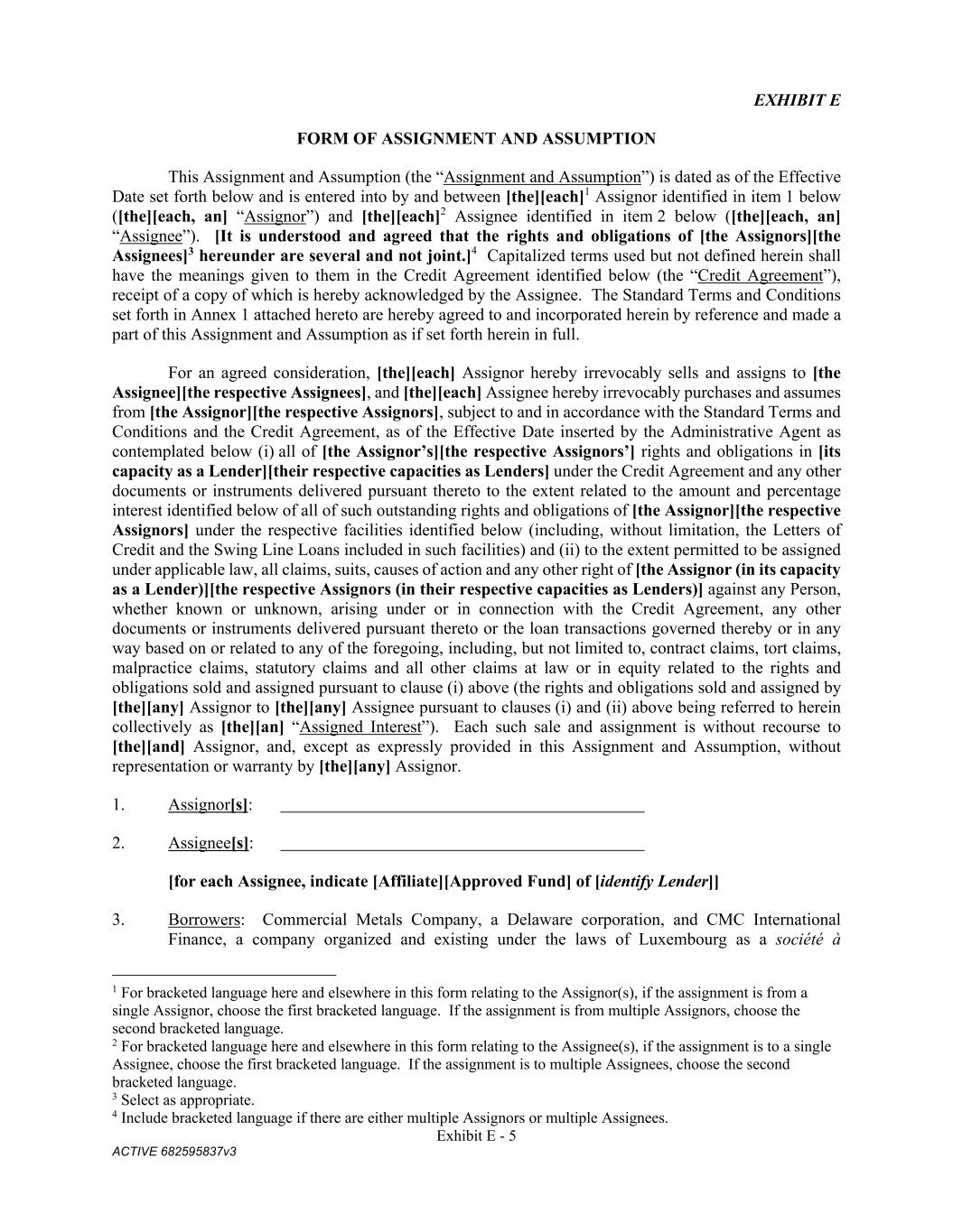 Exhibit E - 5 ACTIVE 682595837v3 EXHIBIT E FORM OF ASSIGNMENT AND ASSUMPTION This Assignment and Assumption (the “Assignment and Assumption”) is dated as of the Effective Date set forth below and is entered into by and between [the][each]1 Assignor identified in item 1 below ([the][each, an] “Assignor”) and [the][each]2 Assignee identified in item 2 below ([the][each, an] “Assignee”). [It is understood and agreed that the rights and obligations of [the Assignors][the Assignees]3 hereunder are several and not joint.]4 Capitalized terms used but not defined herein shall have the meanings given to them in the Credit Agreement identified below (the “Credit Agreement”), receipt of a copy of which is hereby acknowledged by the Assignee. The Standard Terms and Conditions set forth in Annex 1 attached hereto are hereby agreed to and incorporated herein by reference and made a part of this Assignment and Assumption as if set forth herein in full. For an agreed consideration, [the][each] Assignor hereby irrevocably sells and assigns to [the Assignee][the respective Assignees], and [the][each] Assignee hereby irrevocably purchases and assumes from [the Assignor][the respective Assignors], subject to and in accordance with the Standard Terms and Conditions and the Credit Agreement, as of the Effective Date inserted by the Administrative Agent as contemplated below (i) all of [the Assignor’s][the respective Assignors’] rights and obligations in [its capacity as a Lender][their respective capacities as Lenders] under the Credit Agreement and any other documents or instruments delivered pursuant thereto to the extent related to the amount and percentage interest identified below of all of such outstanding rights and obligations of [the Assignor][the respective Assignors] under the respective facilities identified below (including, without limitation, the Letters of Credit and the Swing Line Loans included in such facilities) and (ii) to the extent permitted to be assigned under applicable law, all claims, suits, causes of action and any other right of [the Assignor (in its capacity as a Lender)][the respective Assignors (in their respective capacities as Lenders)] against any Person, whether known or unknown, arising under or in connection with the Credit Agreement, any other documents or instruments delivered pursuant thereto or the loan transactions governed thereby or in any way based on or related to any of the foregoing, including, but not limited to, contract claims, tort claims, malpractice claims, statutory claims and all other claims at law or in equity related to the rights and obligations sold and assigned pursuant to clause (i) above (the rights and obligations sold and assigned by [the][any] Assignor to [the][any] Assignee pursuant to clauses (i) and (ii) above being referred to herein collectively as [the][an] “Assigned Interest”). Each such sale and assignment is without recourse to [the][and] Assignor, and, except as expressly provided in this Assignment and Assumption, without representation or warranty by [the][any] Assignor. 1. Assignor[s]: 2. Assignee[s]: [for each Assignee, indicate [Affiliate][Approved Fund] of [identify Lender]] 3. Borrowers: Commercial Metals Company, a Delaware corporation, and CMC International Finance, a company organized and existing under the laws of Luxembourg as a société à 1 For bracketed language here and elsewhere in this form relating to the Assignor(s), if the assignment is from a single Assignor, choose the first bracketed language. If the assignment is from multiple Assignors, choose the second bracketed language. 2 For bracketed language here and elsewhere in this form relating to the Assignee(s), if the assignment is to a single Assignee, choose the first bracketed language. If the assignment is to multiple Assignees, choose the second bracketed language. 3 Select as appropriate. 4 Include bracketed language if there are either multiple Assignors or multiple Assignees.
