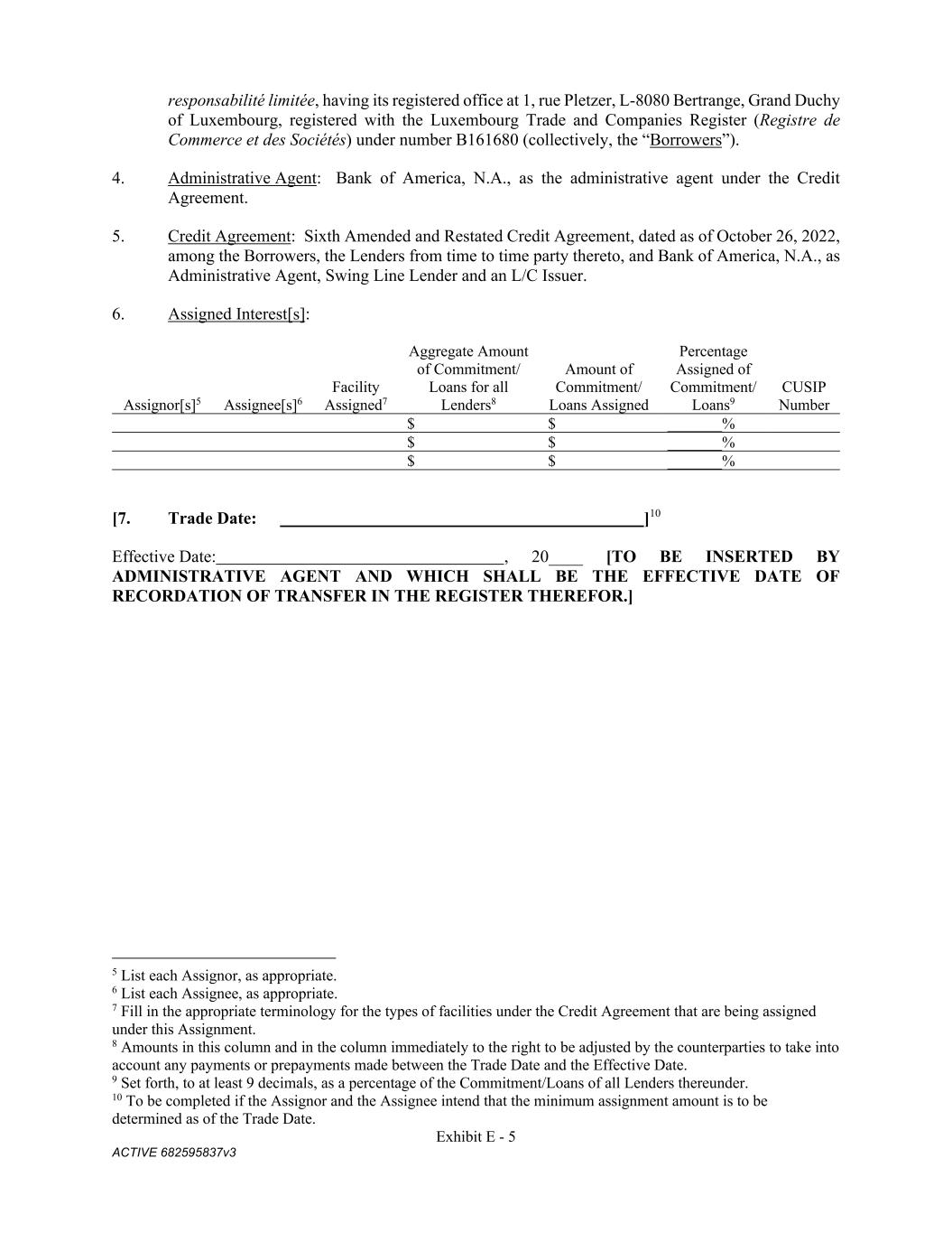 Exhibit E - 5 ACTIVE 682595837v3 responsabilité limitée, having its registered office at 1, rue Pletzer, L-8080 Bertrange, Grand Duchy of Luxembourg, registered with the Luxembourg Trade and Companies Register (Registre de Commerce et des Sociétés) under number B161680 (collectively, the “Borrowers”). 4. Administrative Agent: Bank of America, N.A., as the administrative agent under the Credit Agreement. 5. Credit Agreement: Sixth Amended and Restated Credit Agreement, dated as of October 26, 2022, among the Borrowers, the Lenders from time to time party thereto, and Bank of America, N.A., as Administrative Agent, Swing Line Lender and an L/C Issuer. 6. Assigned Interest[s]: Assignor[s]5 Assignee[s]6 Facility Assigned7 Aggregate Amount of Commitment/ Loans for all Lenders8 Amount of Commitment/ Loans Assigned Percentage Assigned of Commitment/ Loans9 CUSIP Number $ $ _______% $ $ _______% $ $ _______% [7. Trade Date: ]10 Effective Date: , 20____ [TO BE INSERTED BY ADMINISTRATIVE AGENT AND WHICH SHALL BE THE EFFECTIVE DATE OF RECORDATION OF TRANSFER IN THE REGISTER THEREFOR.] 5 List each Assignor, as appropriate. 6 List each Assignee, as appropriate. 7 Fill in the appropriate terminology for the types of facilities under the Credit Agreement that are being assigned under this Assignment. 8 Amounts in this column and in the column immediately to the right to be adjusted by the counterparties to take into account any payments or prepayments made between the Trade Date and the Effective Date. 9 Set forth, to at least 9 decimals, as a percentage of the Commitment/Loans of all Lenders thereunder. 10 To be completed if the Assignor and the Assignee intend that the minimum assignment amount is to be determined as of the Trade Date.
