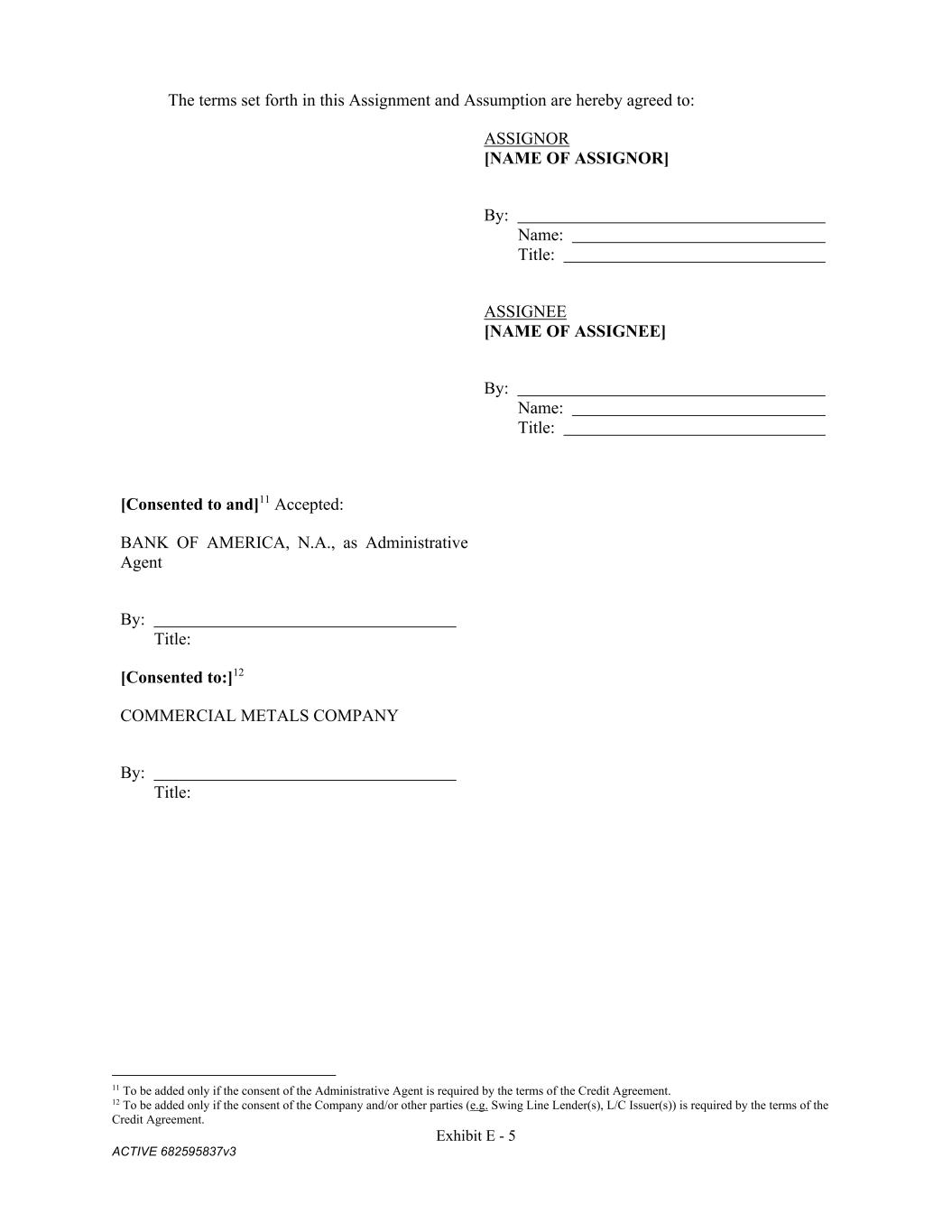Exhibit E - 5 ACTIVE 682595837v3 The terms set forth in this Assignment and Assumption are hereby agreed to: ASSIGNOR [NAME OF ASSIGNOR] By: Name: Title: ASSIGNEE [NAME OF ASSIGNEE] By: Name: Title: [Consented to and]11 Accepted: BANK OF AMERICA, N.A., as Administrative Agent By: Title: [Consented to:]12 COMMERCIAL METALS COMPANY By: Title: 11 To be added only if the consent of the Administrative Agent is required by the terms of the Credit Agreement. 12 To be added only if the consent of the Company and/or other parties (e.g. Swing Line Lender(s), L/C Issuer(s)) is required by the terms of the Credit Agreement.