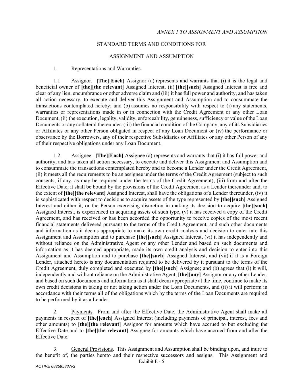 Exhibit E - 5 ACTIVE 682595837v3 ANNEX 1 TO ASSIGNMENT AND ASSUMPTION STANDARD TERMS AND CONDITIONS FOR ASSIGNMENT AND ASSUMPTION 1. Representations and Warranties. 1.1 Assignor. [The][Each] Assignor (a) represents and warrants that (i) it is the legal and beneficial owner of [the][the relevant] Assigned Interest, (ii) [the][such] Assigned Interest is free and clear of any lien, encumbrance or other adverse claim and (iii) it has full power and authority, and has taken all action necessary, to execute and deliver this Assignment and Assumption and to consummate the transactions contemplated hereby; and (b) assumes no responsibility with respect to (i) any statements, warranties or representations made in or in connection with the Credit Agreement or any other Loan Document, (ii) the execution, legality, validity, enforceability, genuineness, sufficiency or value of the Loan Documents or any collateral thereunder, (iii) the financial condition of the Company, any of its Subsidiaries or Affiliates or any other Person obligated in respect of any Loan Document or (iv) the performance or observance by the Borrowers, any of their respective Subsidiaries or Affiliates or any other Person of any of their respective obligations under any Loan Document. 1.2 Assignee. [The][Each] Assignee (a) represents and warrants that (i) it has full power and authority, and has taken all action necessary, to execute and deliver this Assignment and Assumption and to consummate the transactions contemplated hereby and to become a Lender under the Credit Agreement, (ii) it meets all the requirements to be an assignee under the terms of the Credit Agreement (subject to such consents, if any, as may be required under the terms of the Credit Agreement), (iii) from and after the Effective Date, it shall be bound by the provisions of the Credit Agreement as a Lender thereunder and, to the extent of [the][the relevant] Assigned Interest, shall have the obligations of a Lender thereunder, (iv) it is sophisticated with respect to decisions to acquire assets of the type represented by [the][such] Assigned Interest and either it, or the Person exercising discretion in making its decision to acquire [the][such] Assigned Interest, is experienced in acquiring assets of such type, (v) it has received a copy of the Credit Agreement, and has received or has been accorded the opportunity to receive copies of the most recent financial statements delivered pursuant to the terms of the Credit Agreement, and such other documents and information as it deems appropriate to make its own credit analysis and decision to enter into this Assignment and Assumption and to purchase [the][such] Assigned Interest, (vi) it has independently and without reliance on the Administrative Agent or any other Lender and based on such documents and information as it has deemed appropriate, made its own credit analysis and decision to enter into this Assignment and Assumption and to purchase [the][such] Assigned Interest, and (vii) if it is a Foreign Lender, attached hereto is any documentation required to be delivered by it pursuant to the terms of the Credit Agreement, duly completed and executed by [the][such] Assignee; and (b) agrees that (i) it will, independently and without reliance on the Administrative Agent, [the][any] Assignor or any other Lender, and based on such documents and information as it shall deem appropriate at the time, continue to make its own credit decisions in taking or not taking action under the Loan Documents, and (ii) it will perform in accordance with their terms all of the obligations which by the terms of the Loan Documents are required to be performed by it as a Lender. 2. Payments. From and after the Effective Date, the Administrative Agent shall make all payments in respect of [the][each] Assigned Interest (including payments of principal, interest, fees and other amounts) to [the][the relevant] Assignor for amounts which have accrued to but excluding the Effective Date and to [the][the relevant] Assignee for amounts which have accrued from and after the Effective Date. 3. General Provisions. This Assignment and Assumption shall be binding upon, and inure to the benefit of, the parties hereto and their respective successors and assigns. This Assignment and
