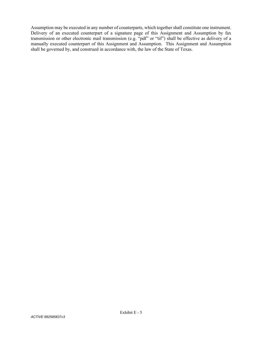 Exhibit E - 5 ACTIVE 682595837v3 Assumption may be executed in any number of counterparts, which together shall constitute one instrument. Delivery of an executed counterpart of a signature page of this Assignment and Assumption by fax transmission or other electronic mail transmission (e.g. “pdf” or “tif”) shall be effective as delivery of a manually executed counterpart of this Assignment and Assumption. This Assignment and Assumption shall be governed by, and construed in accordance with, the law of the State of Texas.