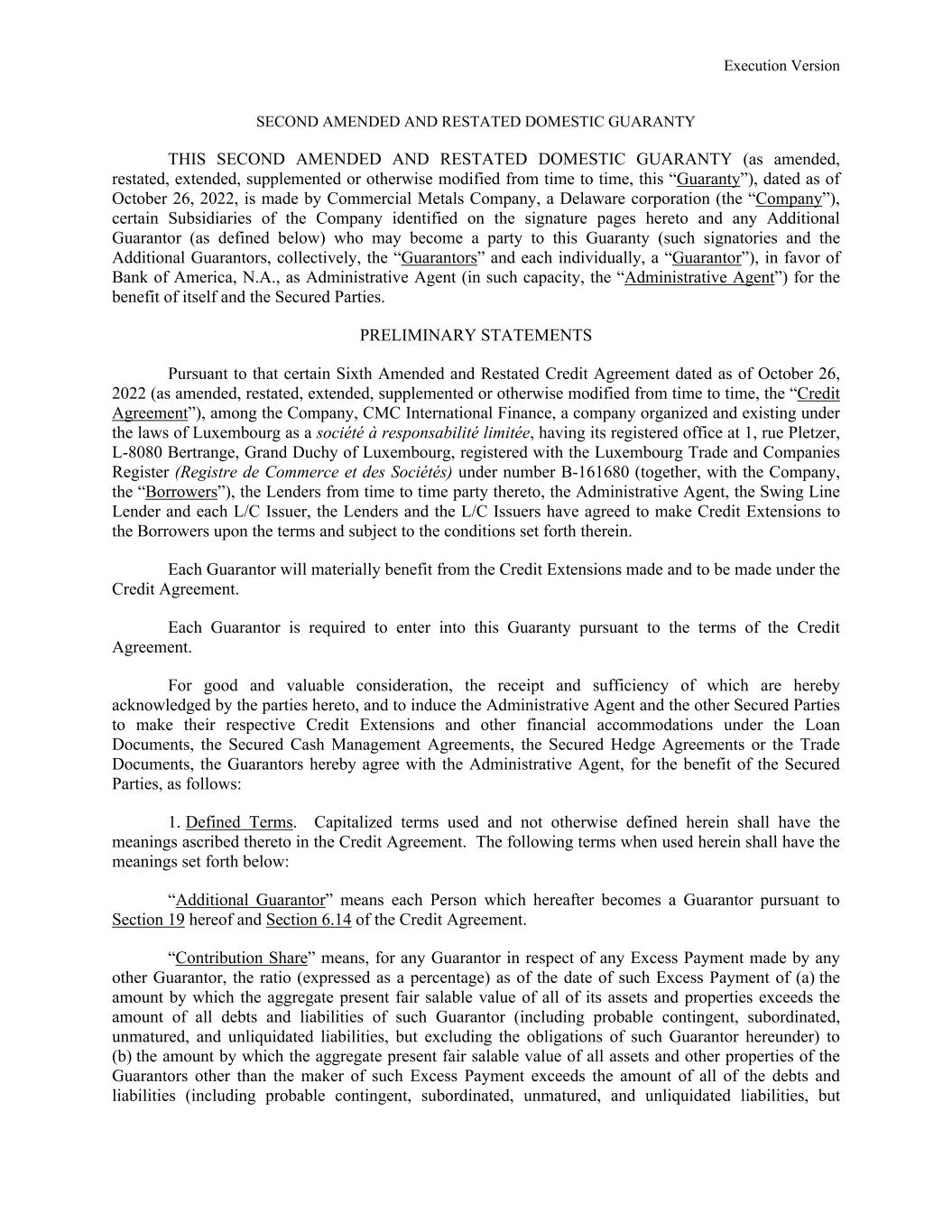 Execution Version SECOND AMENDED AND RESTATED DOMESTIC GUARANTY THIS SECOND AMENDED AND RESTATED DOMESTIC GUARANTY (as amended, restated, extended, supplemented or otherwise modified from time to time, this “Guaranty”), dated as of October 26, 2022, is made by Commercial Metals Company, a Delaware corporation (the “Company”), certain Subsidiaries of the Company identified on the signature pages hereto and any Additional Guarantor (as defined below) who may become a party to this Guaranty (such signatories and the Additional Guarantors, collectively, the “Guarantors” and each individually, a “Guarantor”), in favor of Bank of America, N.A., as Administrative Agent (in such capacity, the “Administrative Agent”) for the benefit of itself and the Secured Parties. PRELIMINARY STATEMENTS Pursuant to that certain Sixth Amended and Restated Credit Agreement dated as of October 26, 2022 (as amended, restated, extended, supplemented or otherwise modified from time to time, the “Credit Agreement”), among the Company, CMC International Finance, a company organized and existing under the laws of Luxembourg as a société à responsabilité limitée, having its registered office at 1, rue Pletzer, L-8080 Bertrange, Grand Duchy of Luxembourg, registered with the Luxembourg Trade and Companies Register (Registre de Commerce et des Sociétés) under number B-161680 (together, with the Company, the “Borrowers”), the Lenders from time to time party thereto, the Administrative Agent, the Swing Line Lender and each L/C Issuer, the Lenders and the L/C Issuers have agreed to make Credit Extensions to the Borrowers upon the terms and subject to the conditions set forth therein. Each Guarantor will materially benefit from the Credit Extensions made and to be made under the Credit Agreement. Each Guarantor is required to enter into this Guaranty pursuant to the terms of the Credit Agreement. For good and valuable consideration, the receipt and sufficiency of which are hereby acknowledged by the parties hereto, and to induce the Administrative Agent and the other Secured Parties to make their respective Credit Extensions and other financial accommodations under the Loan Documents, the Secured Cash Management Agreements, the Secured Hedge Agreements or the Trade Documents, the Guarantors hereby agree with the Administrative Agent, for the benefit of the Secured Parties, as follows: 1. Defined Terms. Capitalized terms used and not otherwise defined herein shall have the meanings ascribed thereto in the Credit Agreement. The following terms when used herein shall have the meanings set forth below: “Additional Guarantor” means each Person which hereafter becomes a Guarantor pursuant to Section 19 hereof and Section 6.14 of the Credit Agreement. “Contribution Share” means, for any Guarantor in respect of any Excess Payment made by any other Guarantor, the ratio (expressed as a percentage) as of the date of such Excess Payment of (a) the amount by which the aggregate present fair salable value of all of its assets and properties exceeds the amount of all debts and liabilities of such Guarantor (including probable contingent, subordinated, unmatured, and unliquidated liabilities, but excluding the obligations of such Guarantor hereunder) to (b) the amount by which the aggregate present fair salable value of all assets and other properties of the Guarantors other than the maker of such Excess Payment exceeds the amount of all of the debts and liabilities (including probable contingent, subordinated, unmatured, and unliquidated liabilities, but