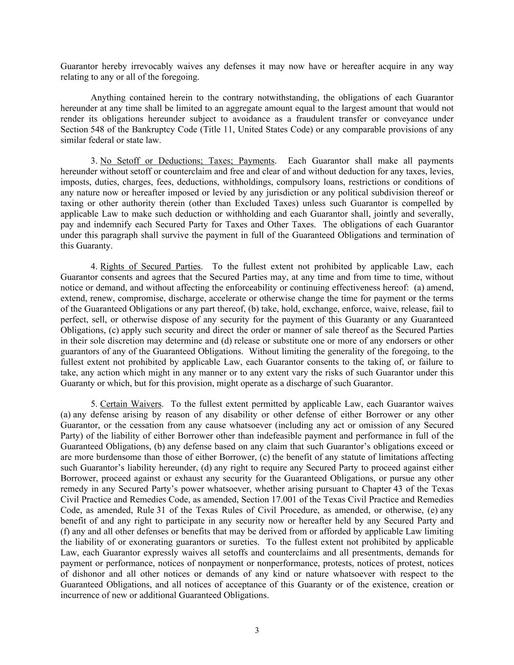 3 Guarantor hereby irrevocably waives any defenses it may now have or hereafter acquire in any way relating to any or all of the foregoing. Anything contained herein to the contrary notwithstanding, the obligations of each Guarantor hereunder at any time shall be limited to an aggregate amount equal to the largest amount that would not render its obligations hereunder subject to avoidance as a fraudulent transfer or conveyance under Section 548 of the Bankruptcy Code (Title 11, United States Code) or any comparable provisions of any similar federal or state law. 3. No Setoff or Deductions; Taxes; Payments. Each Guarantor shall make all payments hereunder without setoff or counterclaim and free and clear of and without deduction for any taxes, levies, imposts, duties, charges, fees, deductions, withholdings, compulsory loans, restrictions or conditions of any nature now or hereafter imposed or levied by any jurisdiction or any political subdivision thereof or taxing or other authority therein (other than Excluded Taxes) unless such Guarantor is compelled by applicable Law to make such deduction or withholding and each Guarantor shall, jointly and severally, pay and indemnify each Secured Party for Taxes and Other Taxes. The obligations of each Guarantor under this paragraph shall survive the payment in full of the Guaranteed Obligations and termination of this Guaranty. 4. Rights of Secured Parties. To the fullest extent not prohibited by applicable Law, each Guarantor consents and agrees that the Secured Parties may, at any time and from time to time, without notice or demand, and without affecting the enforceability or continuing effectiveness hereof: (a) amend, extend, renew, compromise, discharge, accelerate or otherwise change the time for payment or the terms of the Guaranteed Obligations or any part thereof, (b) take, hold, exchange, enforce, waive, release, fail to perfect, sell, or otherwise dispose of any security for the payment of this Guaranty or any Guaranteed Obligations, (c) apply such security and direct the order or manner of sale thereof as the Secured Parties in their sole discretion may determine and (d) release or substitute one or more of any endorsers or other guarantors of any of the Guaranteed Obligations. Without limiting the generality of the foregoing, to the fullest extent not prohibited by applicable Law, each Guarantor consents to the taking of, or failure to take, any action which might in any manner or to any extent vary the risks of such Guarantor under this Guaranty or which, but for this provision, might operate as a discharge of such Guarantor. 5. Certain Waivers. To the fullest extent permitted by applicable Law, each Guarantor waives (a) any defense arising by reason of any disability or other defense of either Borrower or any other Guarantor, or the cessation from any cause whatsoever (including any act or omission of any Secured Party) of the liability of either Borrower other than indefeasible payment and performance in full of the Guaranteed Obligations, (b) any defense based on any claim that such Guarantor’s obligations exceed or are more burdensome than those of either Borrower, (c) the benefit of any statute of limitations affecting such Guarantor’s liability hereunder, (d) any right to require any Secured Party to proceed against either Borrower, proceed against or exhaust any security for the Guaranteed Obligations, or pursue any other remedy in any Secured Party’s power whatsoever, whether arising pursuant to Chapter 43 of the Texas Civil Practice and Remedies Code, as amended, Section 17.001 of the Texas Civil Practice and Remedies Code, as amended, Rule 31 of the Texas Rules of Civil Procedure, as amended, or otherwise, (e) any benefit of and any right to participate in any security now or hereafter held by any Secured Party and (f) any and all other defenses or benefits that may be derived from or afforded by applicable Law limiting the liability of or exonerating guarantors or sureties. To the fullest extent not prohibited by applicable Law, each Guarantor expressly waives all setoffs and counterclaims and all presentments, demands for payment or performance, notices of nonpayment or nonperformance, protests, notices of protest, notices of dishonor and all other notices or demands of any kind or nature whatsoever with respect to the Guaranteed Obligations, and all notices of acceptance of this Guaranty or of the existence, creation or incurrence of new or additional Guaranteed Obligations.