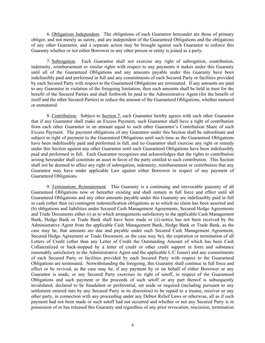 4 6. Obligations Independent. The obligations of each Guarantor hereunder are those of primary obligor, and not merely as surety, and are independent of the Guaranteed Obligations and the obligations of any other Guarantor, and a separate action may be brought against such Guarantor to enforce this Guaranty whether or not either Borrower or any other person or entity is joined as a party. 7. Subrogation. Each Guarantor shall not exercise any right of subrogation, contribution, indemnity, reimbursement or similar rights with respect to any payments it makes under this Guaranty until all of the Guaranteed Obligations and any amounts payable under this Guaranty have been indefeasibly paid and performed in full and any commitments of each Secured Party or facilities provided by each Secured Party with respect to the Guaranteed Obligations are terminated. If any amounts are paid to any Guarantor in violation of the foregoing limitation, then such amounts shall be held in trust for the benefit of the Secured Parties and shall forthwith be paid to the Administrative Agent (for the benefit of itself and the other Secured Parties) to reduce the amount of the Guaranteed Obligations, whether matured or unmatured. 8. Contribution. Subject to Section 7, each Guarantor hereby agrees with each other Guarantor that if any Guarantor shall make an Excess Payment, such Guarantor shall have a right of contribution from each other Guarantor in an amount equal to such other Guarantor’s Contribution Share of such Excess Payment. The payment obligations of any Guarantor under this Section shall be subordinate and subject in right of payment to the Guaranteed Obligations until such time as the Guaranteed Obligations have been indefeasibly paid and performed in full, and no Guarantor shall exercise any right or remedy under this Section against any other Guarantor until such Guaranteed Obligations have been indefeasibly paid and performed in full. Each Guarantor recognizes and acknowledges that the rights to contribution arising hereunder shall constitute an asset in favor of the party entitled to such contribution. This Section shall not be deemed to affect any right of subrogation, indemnity, reimbursement or contribution that any Guarantor may have under applicable Law against either Borrower in respect of any payment of Guaranteed Obligations. 9. Termination; Reinstatement. This Guaranty is a continuing and irrevocable guaranty of all Guaranteed Obligations now or hereafter existing and shall remain in full force and effect until all Guaranteed Obligations and any other amounts payable under this Guaranty are indefeasibly paid in full in cash (other than (a) contingent indemnification obligations as to which no claim has been asserted and (b) obligations and liabilities under Secured Cash Management Agreements, Secured Hedge Agreements and Trade Documents either (i) as to which arrangements satisfactory to the applicable Cash Management Bank, Hedge Bank or Trade Bank shall have been made or (ii) notice has not been received by the Administrative Agent from the applicable Cash Management Bank, Hedge Bank or Trade Bank, as the case may be, that amounts are due and payable under such Secured Cash Management Agreement, Secured Hedge Agreement or Trade Document, as the case may be), the expiration or termination of all Letters of Credit (other than any Letter of Credit the Outstanding Amount of which has been Cash Collateralized or back-stopped by a letter of credit or other credit support in form and substance reasonably satisfactory to the Administrative Agent and the applicable L/C Issuer) and any commitments of each Secured Party or facilities provided by each Secured Party with respect to the Guaranteed Obligations are terminated. Notwithstanding the foregoing, this Guaranty shall continue in full force and effect or be revived, as the case may be, if any payment by or on behalf of either Borrower or any Guarantor is made, or any Secured Party exercises its right of setoff, in respect of the Guaranteed Obligations and such payment or the proceeds of such setoff or any part thereof is subsequently invalidated, declared to be fraudulent or preferential, set aside or required (including pursuant to any settlement entered into by any Secured Party in its discretion) to be repaid to a trustee, receiver or any other party, in connection with any proceeding under any Debtor Relief Laws or otherwise, all as if such payment had not been made or such setoff had not occurred and whether or not any Secured Party is in possession of or has released this Guaranty and regardless of any prior revocation, rescission, termination