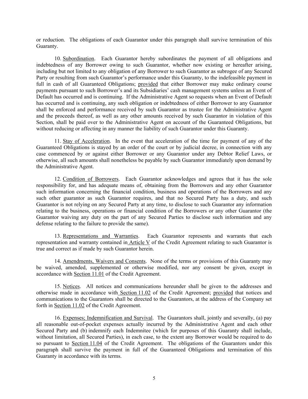 5 or reduction. The obligations of each Guarantor under this paragraph shall survive termination of this Guaranty. 10. Subordination. Each Guarantor hereby subordinates the payment of all obligations and indebtedness of any Borrower owing to such Guarantor, whether now existing or hereafter arising, including but not limited to any obligation of any Borrower to such Guarantor as subrogee of any Secured Party or resulting from such Guarantor’s performance under this Guaranty, to the indefeasible payment in full in cash of all Guaranteed Obligations; provided that either Borrower may make ordinary course payments pursuant to such Borrower’s and its Subsidiaries’ cash management systems unless an Event of Default has occurred and is continuing. If the Administrative Agent so requests when an Event of Default has occurred and is continuing, any such obligation or indebtedness of either Borrower to any Guarantor shall be enforced and performance received by such Guarantor as trustee for the Administrative Agent and the proceeds thereof, as well as any other amounts received by such Guarantor in violation of this Section, shall be paid over to the Administrative Agent on account of the Guaranteed Obligations, but without reducing or affecting in any manner the liability of such Guarantor under this Guaranty. 11. Stay of Acceleration. In the event that acceleration of the time for payment of any of the Guaranteed Obligations is stayed by an order of the court or by judicial decree, in connection with any case commenced by or against either Borrower or any Guarantor under any Debtor Relief Laws, or otherwise, all such amounts shall nonetheless be payable by such Guarantor immediately upon demand by the Administrative Agent. 12. Condition of Borrowers. Each Guarantor acknowledges and agrees that it has the sole responsibility for, and has adequate means of, obtaining from the Borrowers and any other Guarantor such information concerning the financial condition, business and operations of the Borrowers and any such other guarantor as such Guarantor requires, and that no Secured Party has a duty, and such Guarantor is not relying on any Secured Party at any time, to disclose to such Guarantor any information relating to the business, operations or financial condition of the Borrowers or any other Guarantor (the Guarantor waiving any duty on the part of any Secured Parties to disclose such information and any defense relating to the failure to provide the same). 13. Representations and Warranties. Each Guarantor represents and warrants that each representation and warranty contained in Article V of the Credit Agreement relating to such Guarantor is true and correct as if made by such Guarantor herein. 14. Amendments, Waivers and Consents. None of the terms or provisions of this Guaranty may be waived, amended, supplemented or otherwise modified, nor any consent be given, except in accordance with Section 11.01 of the Credit Agreement. 15. Notices. All notices and communications hereunder shall be given to the addresses and otherwise made in accordance with Section 11.02 of the Credit Agreement; provided that notices and communications to the Guarantors shall be directed to the Guarantors, at the address of the Company set forth in Section 11.02 of the Credit Agreement. 16. Expenses; Indemnification and Survival. The Guarantors shall, jointly and severally, (a) pay all reasonable out-of-pocket expenses actually incurred by the Administrative Agent and each other Secured Party and (b) indemnify each Indemnitee (which for purposes of this Guaranty shall include, without limitation, all Secured Parties), in each case, to the extent any Borrower would be required to do so pursuant to Section 11.04 of the Credit Agreement. The obligations of the Guarantors under this paragraph shall survive the payment in full of the Guaranteed Obligations and termination of this Guaranty in accordance with its terms.