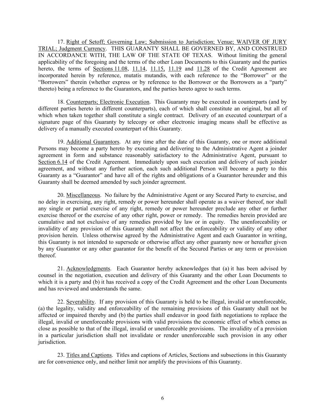 6 17. Right of Setoff; Governing Law; Submission to Jurisdiction; Venue; WAIVER OF JURY TRIAL; Judgment Currency. THIS GUARANTY SHALL BE GOVERNED BY, AND CONSTRUED IN ACCORDANCE WITH, THE LAW OF THE STATE OF TEXAS. Without limiting the general applicability of the foregoing and the terms of the other Loan Documents to this Guaranty and the parties hereto, the terms of Sections 11.08, 11.14, 11.15, 11.19 and 11.28 of the Credit Agreement are incorporated herein by reference, mutatis mutandis, with each reference to the “Borrower” or the “Borrowers” therein (whether express or by reference to the Borrower or the Borrowers as a “party” thereto) being a reference to the Guarantors, and the parties hereto agree to such terms. 18. Counterparts; Electronic Execution. This Guaranty may be executed in counterparts (and by different parties hereto in different counterparts), each of which shall constitute an original, but all of which when taken together shall constitute a single contract. Delivery of an executed counterpart of a signature page of this Guaranty by telecopy or other electronic imaging means shall be effective as delivery of a manually executed counterpart of this Guaranty. 19. Additional Guarantors. At any time after the date of this Guaranty, one or more additional Persons may become a party hereto by executing and delivering to the Administrative Agent a joinder agreement in form and substance reasonably satisfactory to the Administrative Agent, pursuant to Section 6.14 of the Credit Agreement. Immediately upon such execution and delivery of such joinder agreement, and without any further action, each such additional Person will become a party to this Guaranty as a “Guarantor” and have all of the rights and obligations of a Guarantor hereunder and this Guaranty shall be deemed amended by such joinder agreement. 20. Miscellaneous. No failure by the Administrative Agent or any Secured Party to exercise, and no delay in exercising, any right, remedy or power hereunder shall operate as a waiver thereof, nor shall any single or partial exercise of any right, remedy or power hereunder preclude any other or further exercise thereof or the exercise of any other right, power or remedy. The remedies herein provided are cumulative and not exclusive of any remedies provided by law or in equity. The unenforceability or invalidity of any provision of this Guaranty shall not affect the enforceability or validity of any other provision herein. Unless otherwise agreed by the Administrative Agent and each Guarantor in writing, this Guaranty is not intended to supersede or otherwise affect any other guaranty now or hereafter given by any Guarantor or any other guarantor for the benefit of the Secured Parties or any term or provision thereof. 21. Acknowledgments. Each Guarantor hereby acknowledges that (a) it has been advised by counsel in the negotiation, execution and delivery of this Guaranty and the other Loan Documents to which it is a party and (b) it has received a copy of the Credit Agreement and the other Loan Documents and has reviewed and understands the same. 22. Severability. If any provision of this Guaranty is held to be illegal, invalid or unenforceable, (a) the legality, validity and enforceability of the remaining provisions of this Guaranty shall not be affected or impaired thereby and (b) the parties shall endeavor in good faith negotiations to replace the illegal, invalid or unenforceable provisions with valid provisions the economic effect of which comes as close as possible to that of the illegal, invalid or unenforceable provisions. The invalidity of a provision in a particular jurisdiction shall not invalidate or render unenforceable such provision in any other jurisdiction. 23. Titles and Captions. Titles and captions of Articles, Sections and subsections in this Guaranty are for convenience only, and neither limit nor amplify the provisions of this Guaranty.