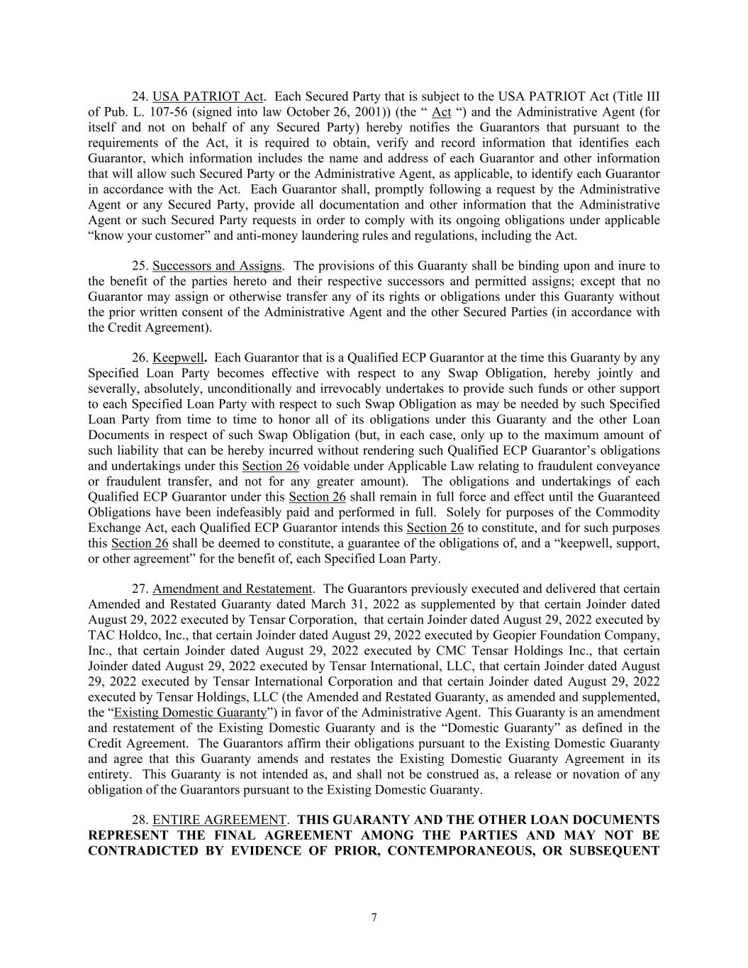 7 24. USA PATRIOT Act. Each Secured Party that is subject to the USA PATRIOT Act (Title III of Pub. L. 107-56 (signed into law October 26, 2001)) (the “ Act “) and the Administrative Agent (for itself and not on behalf of any Secured Party) hereby notifies the Guarantors that pursuant to the requirements of the Act, it is required to obtain, verify and record information that identifies each Guarantor, which information includes the name and address of each Guarantor and other information that will allow such Secured Party or the Administrative Agent, as applicable, to identify each Guarantor in accordance with the Act. Each Guarantor shall, promptly following a request by the Administrative Agent or any Secured Party, provide all documentation and other information that the Administrative Agent or such Secured Party requests in order to comply with its ongoing obligations under applicable “know your customer” and anti-money laundering rules and regulations, including the Act. 25. Successors and Assigns. The provisions of this Guaranty shall be binding upon and inure to the benefit of the parties hereto and their respective successors and permitted assigns; except that no Guarantor may assign or otherwise transfer any of its rights or obligations under this Guaranty without the prior written consent of the Administrative Agent and the other Secured Parties (in accordance with the Credit Agreement). 26. Keepwell. Each Guarantor that is a Qualified ECP Guarantor at the time this Guaranty by any Specified Loan Party becomes effective with respect to any Swap Obligation, hereby jointly and severally, absolutely, unconditionally and irrevocably undertakes to provide such funds or other support to each Specified Loan Party with respect to such Swap Obligation as may be needed by such Specified Loan Party from time to time to honor all of its obligations under this Guaranty and the other Loan Documents in respect of such Swap Obligation (but, in each case, only up to the maximum amount of such liability that can be hereby incurred without rendering such Qualified ECP Guarantor’s obligations and undertakings under this Section 26 voidable under Applicable Law relating to fraudulent conveyance or fraudulent transfer, and not for any greater amount). The obligations and undertakings of each Qualified ECP Guarantor under this Section 26 shall remain in full force and effect until the Guaranteed Obligations have been indefeasibly paid and performed in full. Solely for purposes of the Commodity Exchange Act, each Qualified ECP Guarantor intends this Section 26 to constitute, and for such purposes this Section 26 shall be deemed to constitute, a guarantee of the obligations of, and a “keepwell, support, or other agreement” for the benefit of, each Specified Loan Party. 27. Amendment and Restatement. The Guarantors previously executed and delivered that certain Amended and Restated Guaranty dated March 31, 2022 as supplemented by that certain Joinder dated August 29, 2022 executed by Tensar Corporation, that certain Joinder dated August 29, 2022 executed by TAC Holdco, Inc., that certain Joinder dated August 29, 2022 executed by Geopier Foundation Company, Inc., that certain Joinder dated August 29, 2022 executed by CMC Tensar Holdings Inc., that certain Joinder dated August 29, 2022 executed by Tensar International, LLC, that certain Joinder dated August 29, 2022 executed by Tensar International Corporation and that certain Joinder dated August 29, 2022 executed by Tensar Holdings, LLC (the Amended and Restated Guaranty, as amended and supplemented, the “Existing Domestic Guaranty”) in favor of the Administrative Agent. This Guaranty is an amendment and restatement of the Existing Domestic Guaranty and is the “Domestic Guaranty” as defined in the Credit Agreement. The Guarantors affirm their obligations pursuant to the Existing Domestic Guaranty and agree that this Guaranty amends and restates the Existing Domestic Guaranty Agreement in its entirety. This Guaranty is not intended as, and shall not be construed as, a release or novation of any obligation of the Guarantors pursuant to the Existing Domestic Guaranty. 28. ENTIRE AGREEMENT. THIS GUARANTY AND THE OTHER LOAN DOCUMENTS REPRESENT THE FINAL AGREEMENT AMONG THE PARTIES AND MAY NOT BE CONTRADICTED BY EVIDENCE OF PRIOR, CONTEMPORANEOUS, OR SUBSEQUENT